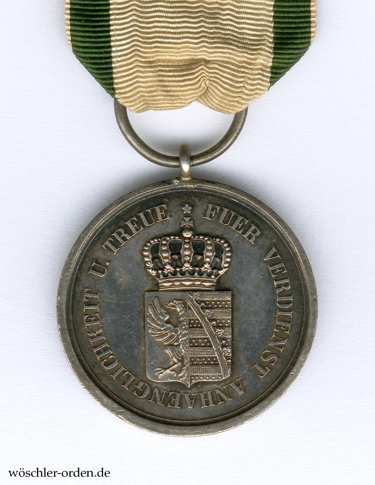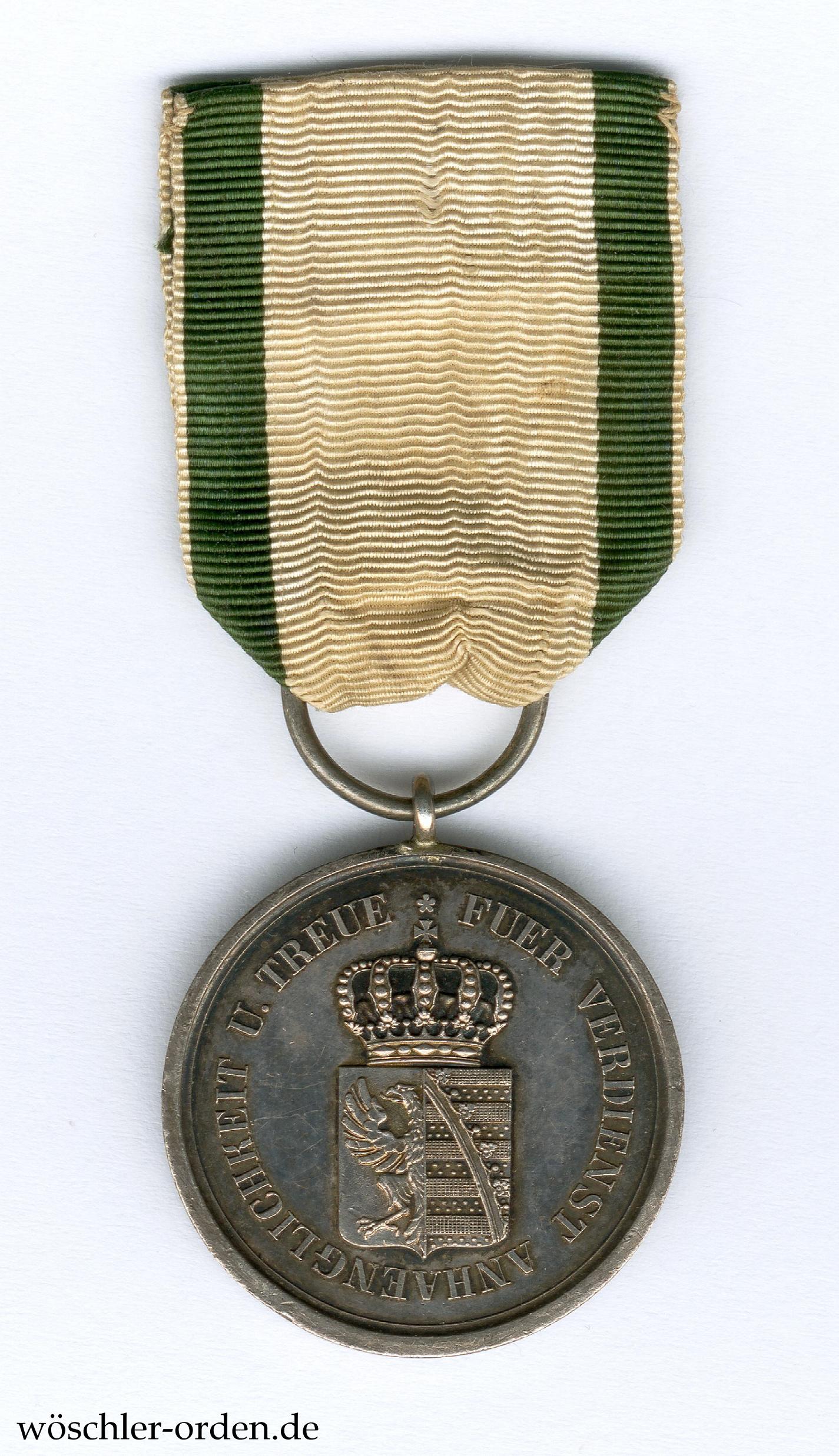 Die Medaille für Verdienst, Anhänglichkeit und Treue wurde durch Herzog Heinrich von Anhalt-Köthen im Jahr 1835 für hervorragende Verdienste von Staatsdienern in zwei Klassen – Gold und Silber – gestiftet. Regelmäßig dürfte sie beim Übertritt in den Ruhestand bzw. nach fünfzig Dienstjahren verliehen worden sein, und zwar in Gold an Angehörige des hochrangigen Staatsdienstes, in Silber an Subalternbeamte. Geliefert wurden noch im Stiftungsjahr durch die Berliner Medaillenmünze Gottfried Loos zwölf goldene sowie einhundert silberne Medaillen, von denen jedoch nicht mehr als vier goldene und zwölf oder dreizehn silberne verliehen worden sein sollen.