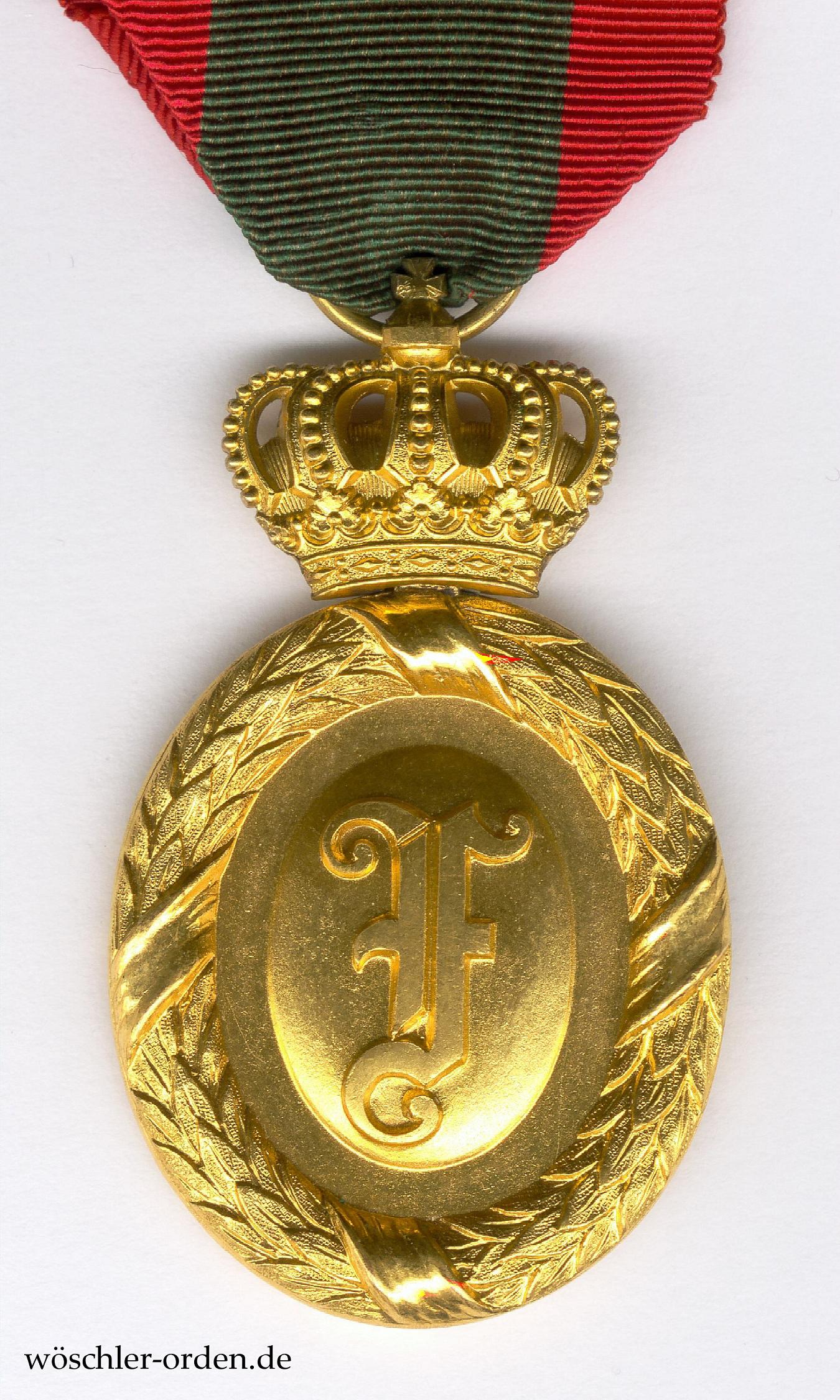 Exemplar des zweiten, zwischen 1905 und 1912 verliehenen Modells. Bronze massiv geprägt und matt vergoldet sowie teilweise poliert, überhöht von einer über ein Scharnier beweglich angebrachten Herzogskrone, durch deren Reichsapfel der Bandring. Geliefert wurden diese Dekorationen durch die Firma Hofjuwelier Heinzelmann, Dessau, der sie jedoch bei den Hofjuwelieren J. Godet & Sohn in Berlin fertigen ließ.