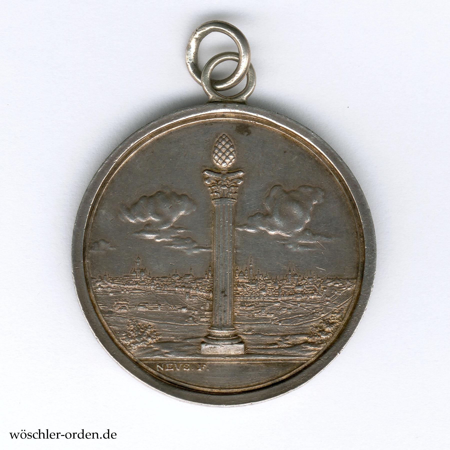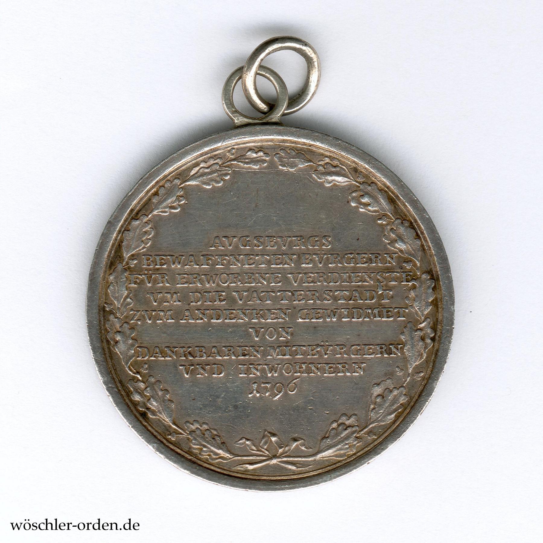 Silber geprägt, etwa 41 mm. Vorderseitig vor einer Stadtansicht Augsburgs die Darstellung der aus dem Stadtwappen stammenden Zirbelnuss auf Säule, darunter die Signatur „NEVS. F.“ des Stempelschneiders Johann Jacob Neuss. Rückseitig die neunzeilige Widmungsinschrift „AUGSBURGS / BEWAFFNETEN BÜRGERN / FÜR ERWORBNE VERDIENSTE / UM DIE VATTERSTADT / ZUM ANDENKEN GEWIDMET / VON / DANKBAREN MITBÜRGERN / UND INWOHNERN / 1796“.