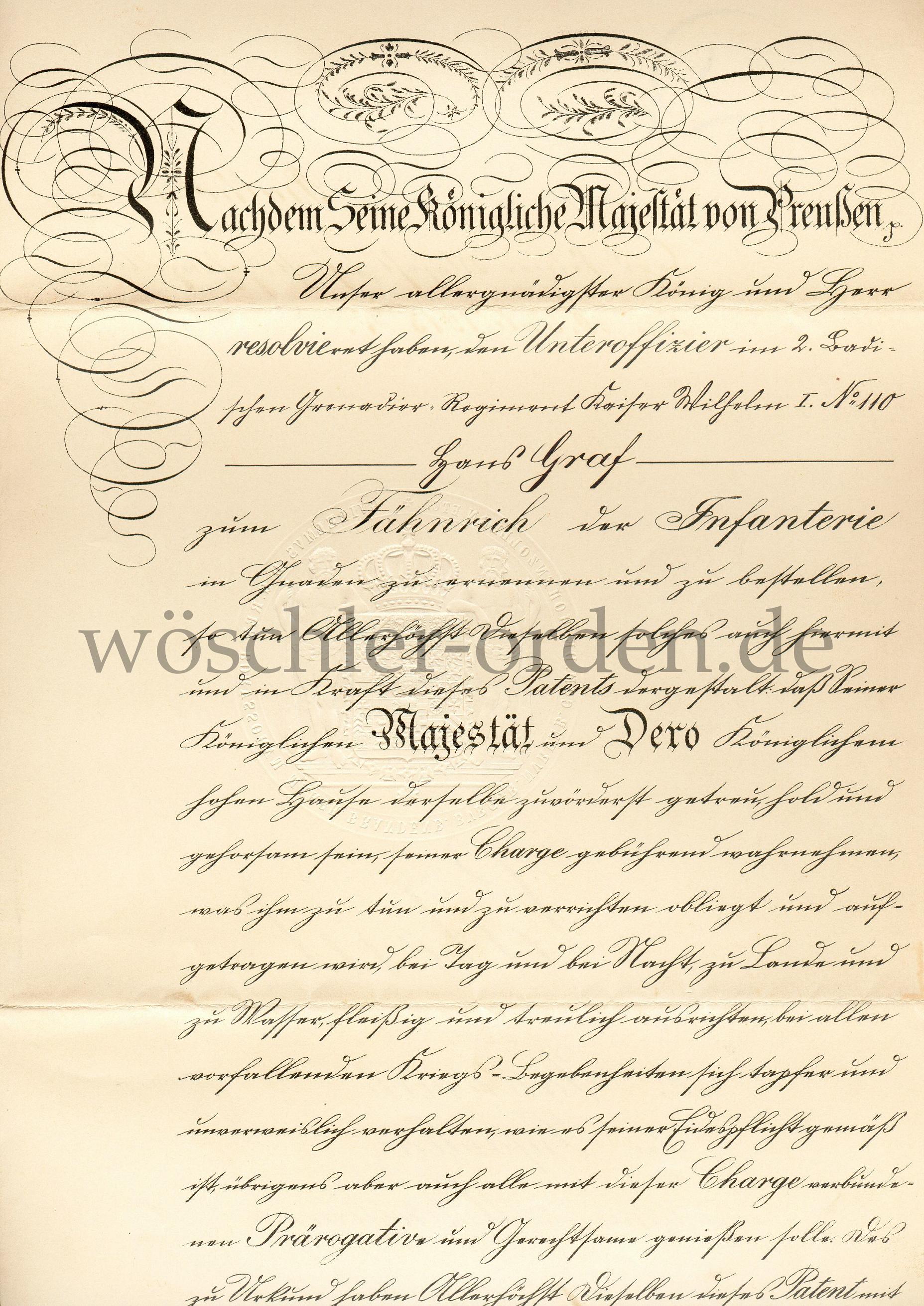 Beiliegend außerdem das „Patent als Fähnrich der Infanterie für den bisherigen Unteroffizier Graf“, ausgefertigt „Balholm, an Bord seiner Majestät Jacht „Hohenzollern“, den 19. Juli 1913, ein vierseitiger „Kriegsranglisten-Auszug“ der Reichsarchivzweigstelle vom 15.11.1935 sowie eine Photopostkarte aus der Zeit kurz nach dem Weltkrieg, die Graf in Uniform und mit seiner Gattin zeigt. Er trägt darauf die hier genannten Auszeichnungen, außerdem beide Klassen des Eisernen Kreuzes sowie das Verwundetenabzeichen in mattweiß.