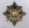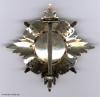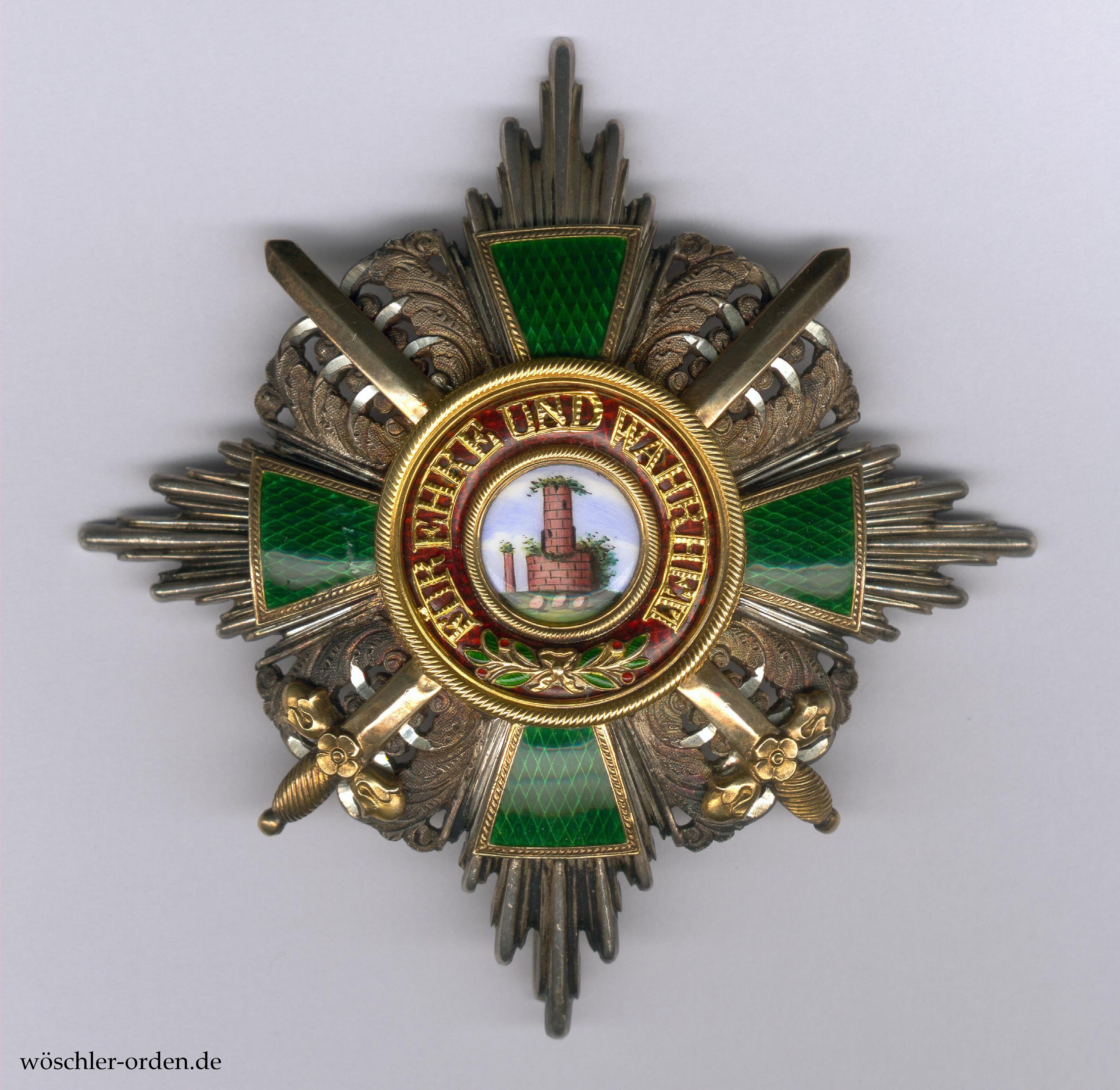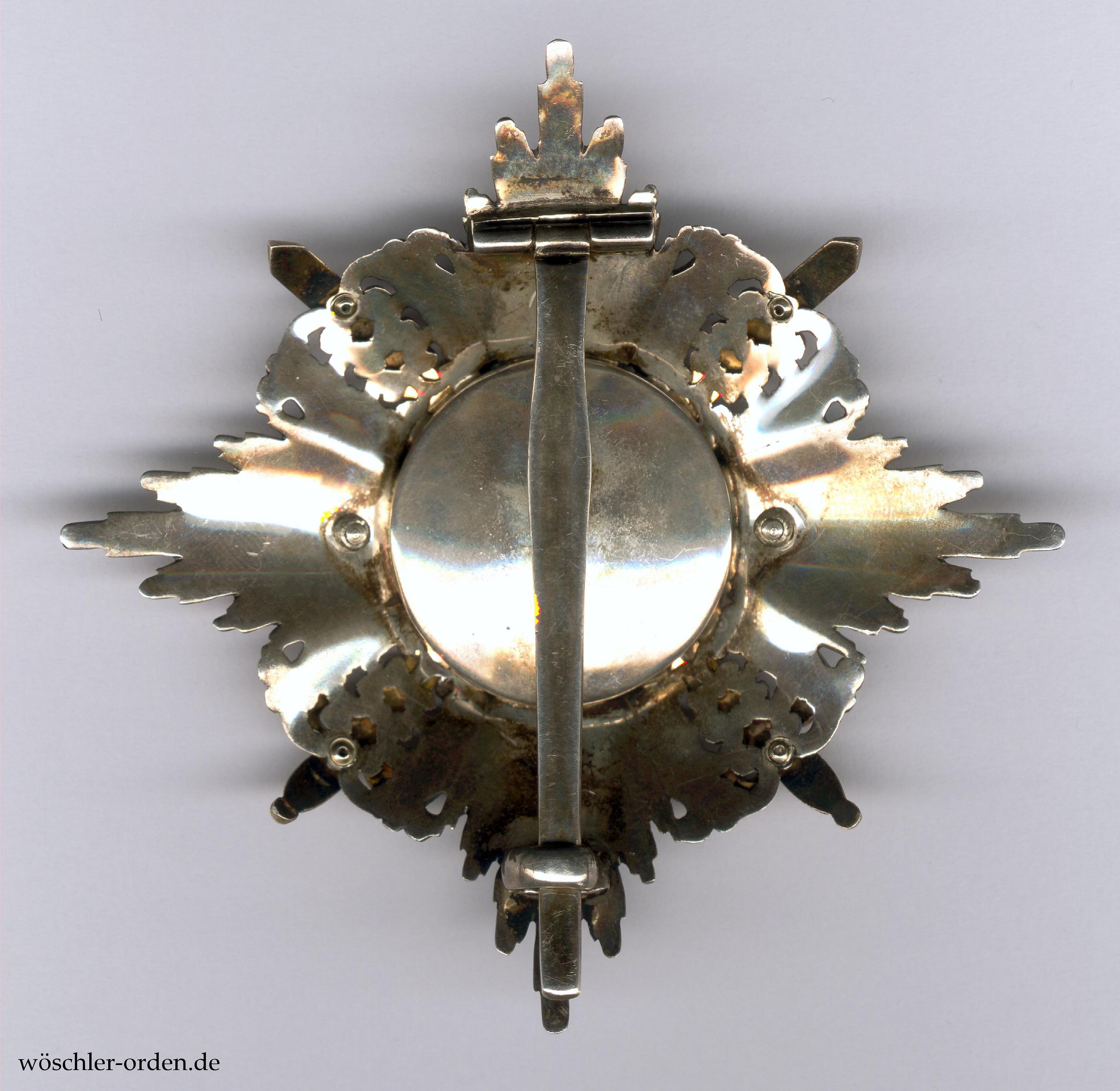 Bruststern, ohne das Kreuz, aus Fertigung der Firma C. F. Zimmermann, Pforzheim, aus der Zeit des Weltkrieges. Silber, mehrteilig gefertigt, die Auflagen teilweise noch echt golden, das Medaillon in Emaillemalerei, die Schwerter mit Goldauflage („Doublé“) und mittels Hohlnieten befestigt. Der Medaillonring und die vier aufgelegten Kreuzarmflächen fein flinkiert und transluzid rot bzw. grün emailliert