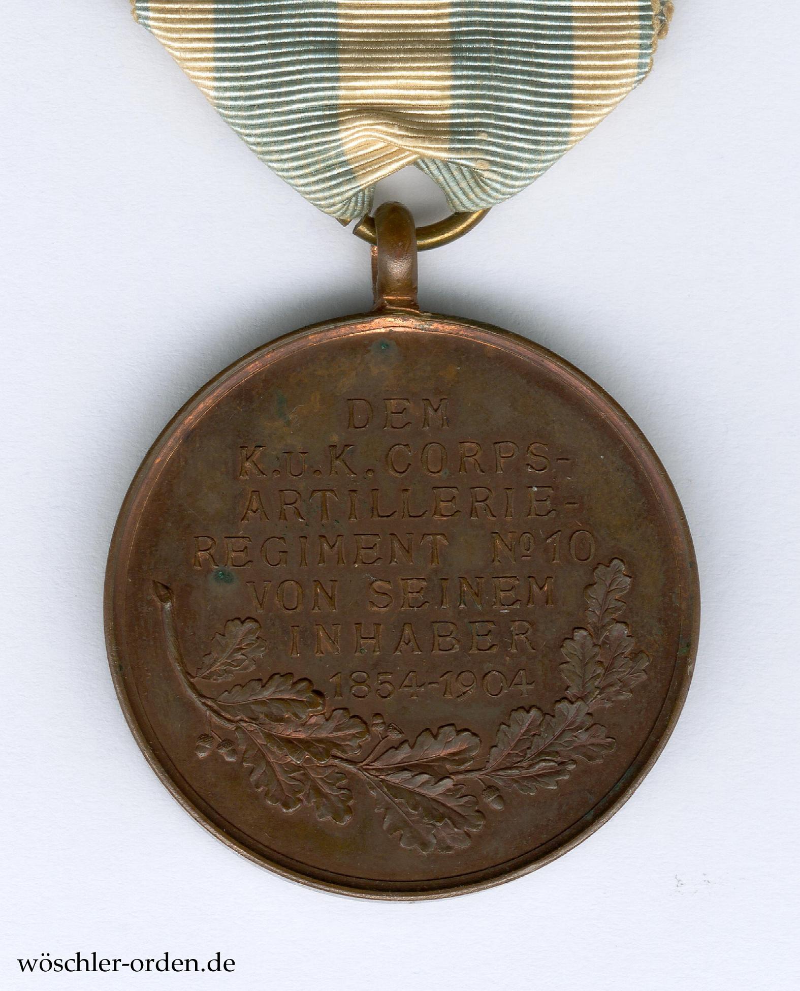 Die Inhaber-Jubiläumsmedaille wurde am 30. April 1904 durch Prinzregent Luitpold anlässlich seines 50-jährigen Jubiläums als Inhaber des K.u.K.-Corps-Artillerie-Regiments Nr. 10 in zwei Ausgaben – Silber und Bronze – gestiftet. Die silbernen Medaillen waren für die aktiven Offiziere und die ehemaligen Regimentskommandeure, die bronzenen für ältere Unteroffiziere bestimmt. Verausgabt wurden lediglich 81 bzw. 123 Medaillen.