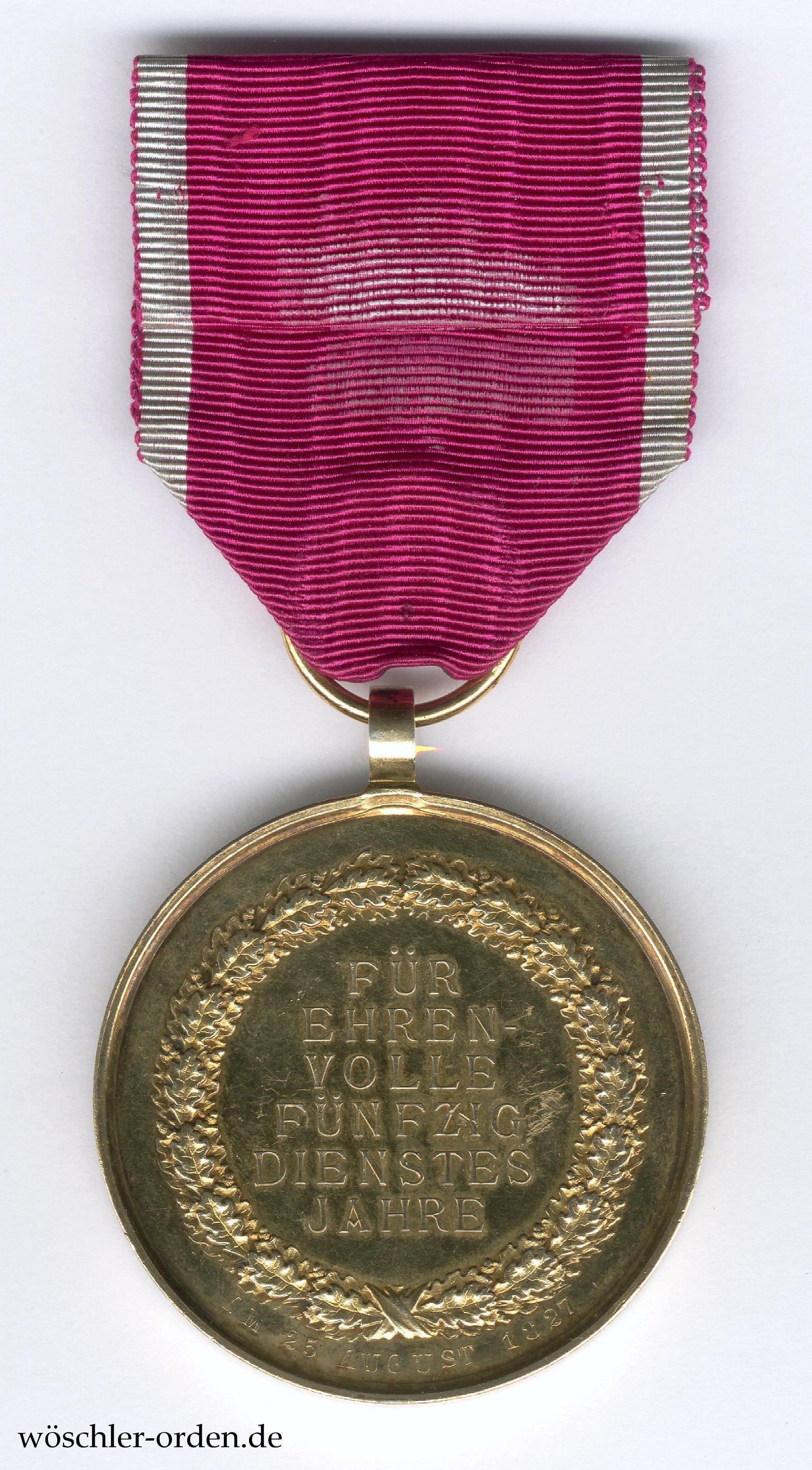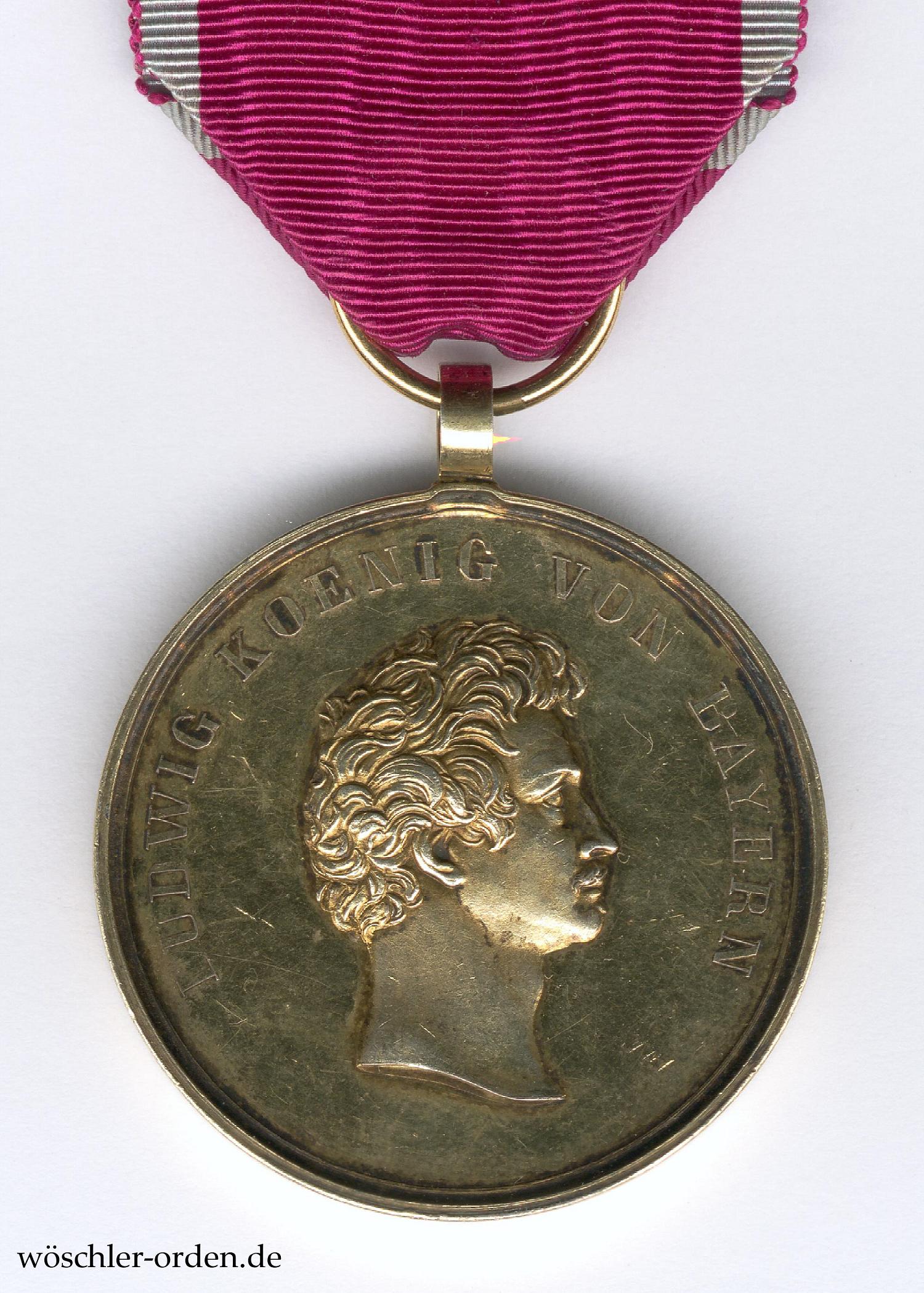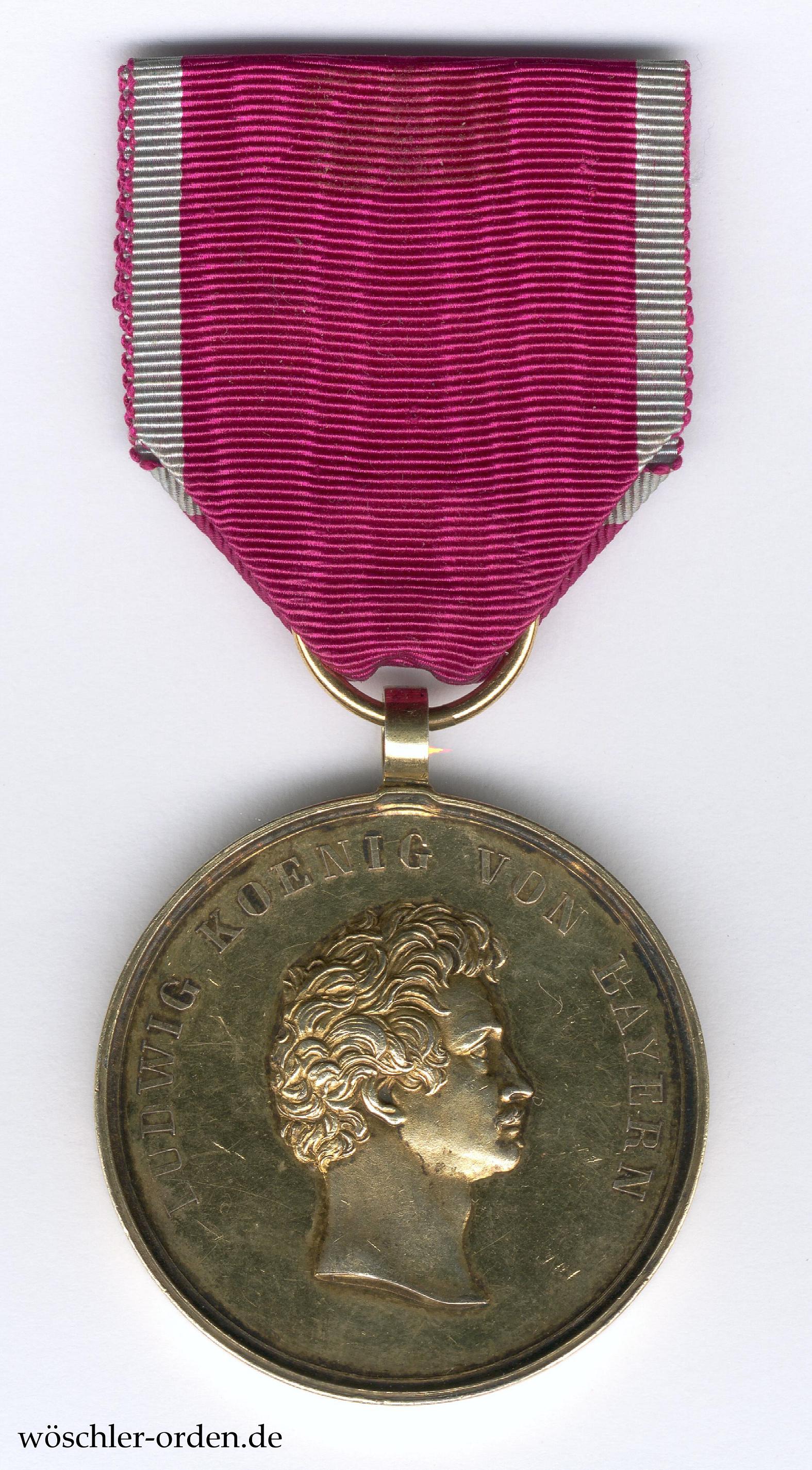Der Ludwigs-Orden wurde durch König Ludwig I. am 25. August 1827, seinem Geburts- und Namenstag, zur Auszeichnung von Staatsbediensteten, die ihr fünfzigstes Dienstjahr vollendet hatten, in zwei Klassen gestiftet. Neben dem Militär wurden Personen im Hof-, Staats- und Kirchendienst berücksichtigt. Die höher stehenden Empfänger erhielten ein teilemailliertes Ordenskreuz, die niedrigeren Ranges eine goldene Medaille, die beide am selben Bande auf der linken Brust getragen wurden. Die ursprünglichen Stempel der Medaille wurden vom Münzmedailleur im Hauptmünzamt Johann Baptist Stiglmair geschnitten. Im Jahr 1847 wurde durch Johann Adam Ries ein neuer, leicht abweichender Rückseitenstempel geschnitten. Erst im Februar 1918 kam es zur Ausprägung der ansonsten immer echt goldenen Medaillen aus vergoldetem Silber.