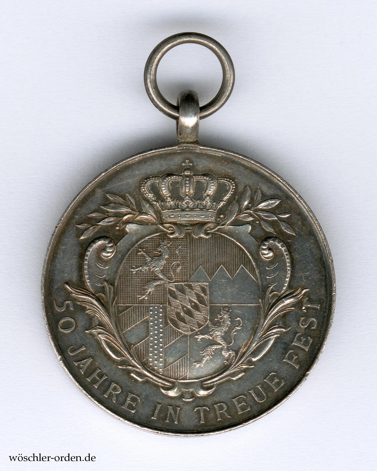 Silber geprägt, auf der Vorderseite das nach links gewendete Brustbild des Stifters in Unform, vom selben durch Prof. Anton Scharff geschaffenen Stempel, der auch bei der Rettungsmedaille Verwendung fand. Rückseitig der gekrönte, ovale bayerische Wappenschild mit Randverzierung und Lorbeerzweige, darunter Umschrift „50 JAHRE IN TREUE FEST“. Die Rückseite ist unsigniert, stammt jedoch von Alois Boersch. An stabiler, angelöteter Ringöse mit wohl privat angebrachtem Sprungring.