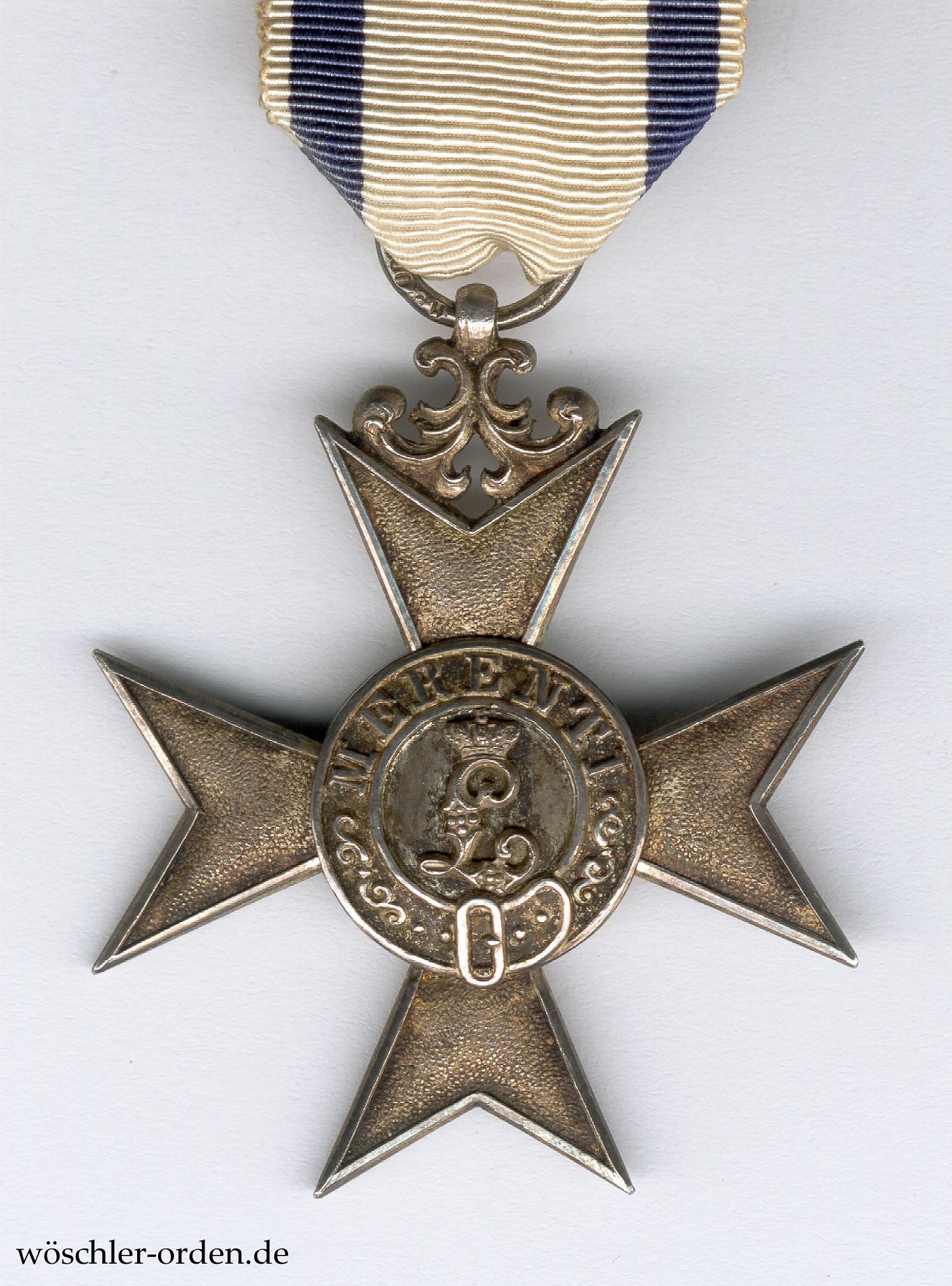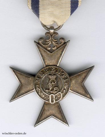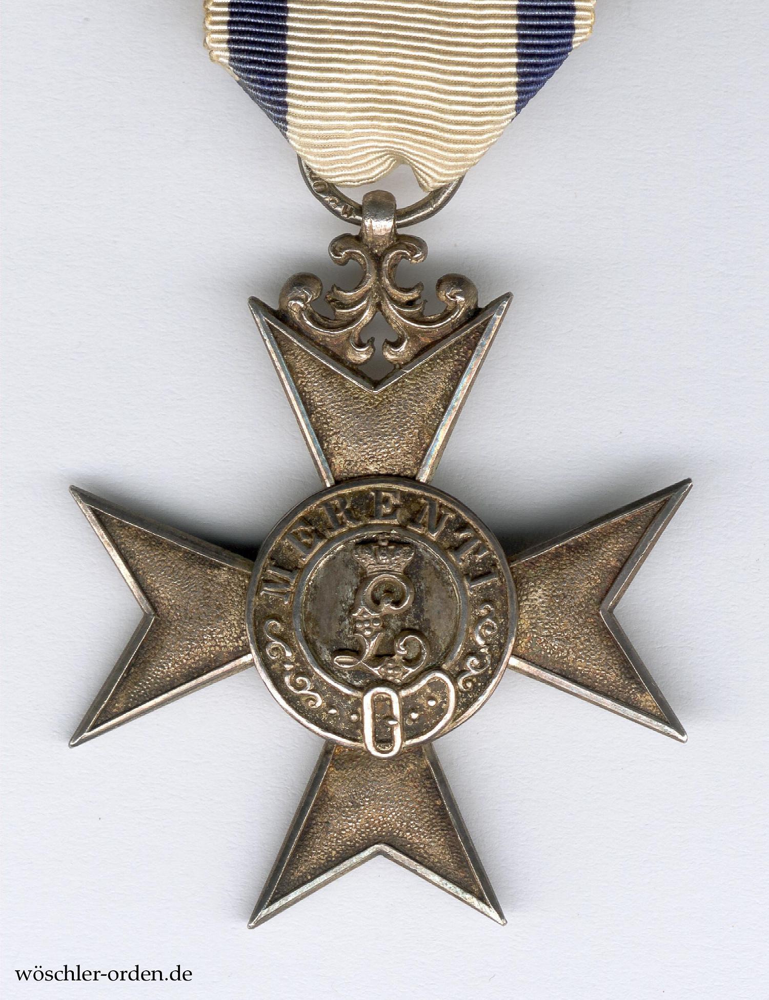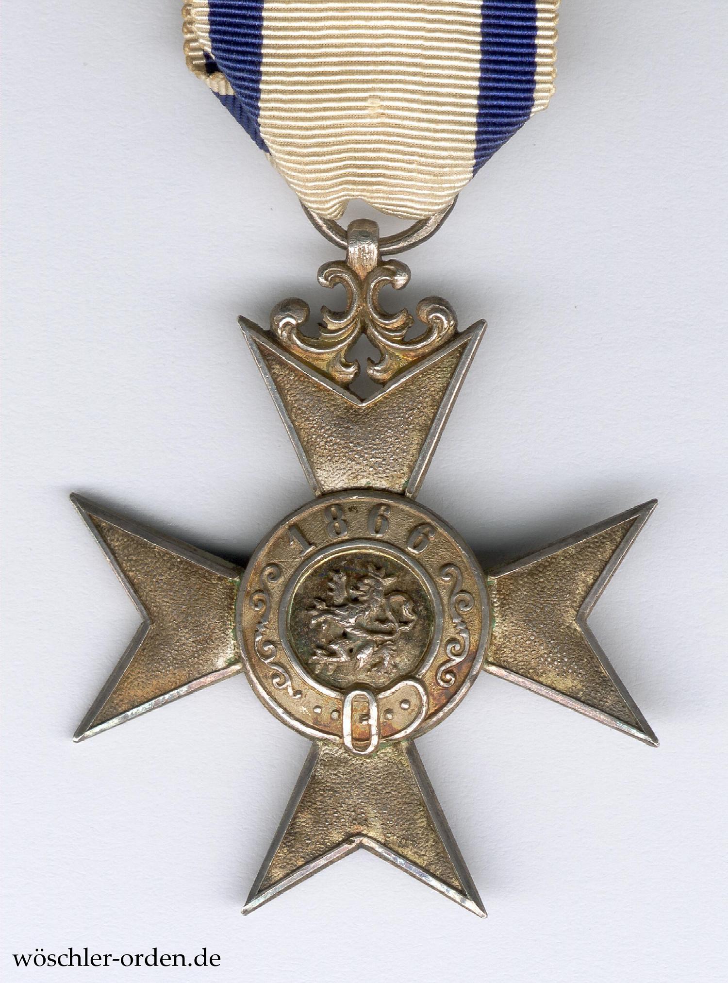 Exemplar des zweiten, bis 1913 verliehenen zweiklassigen Modells. Silber teils hohl geprägt, die mehrteilig gefertigten Medaillons verstiftet. Der Bandring mit Herstellerpunzierung „G.H.“ der Firma Gebrüder Hemmerle, München, und Feingehaltspunzierung „900“.