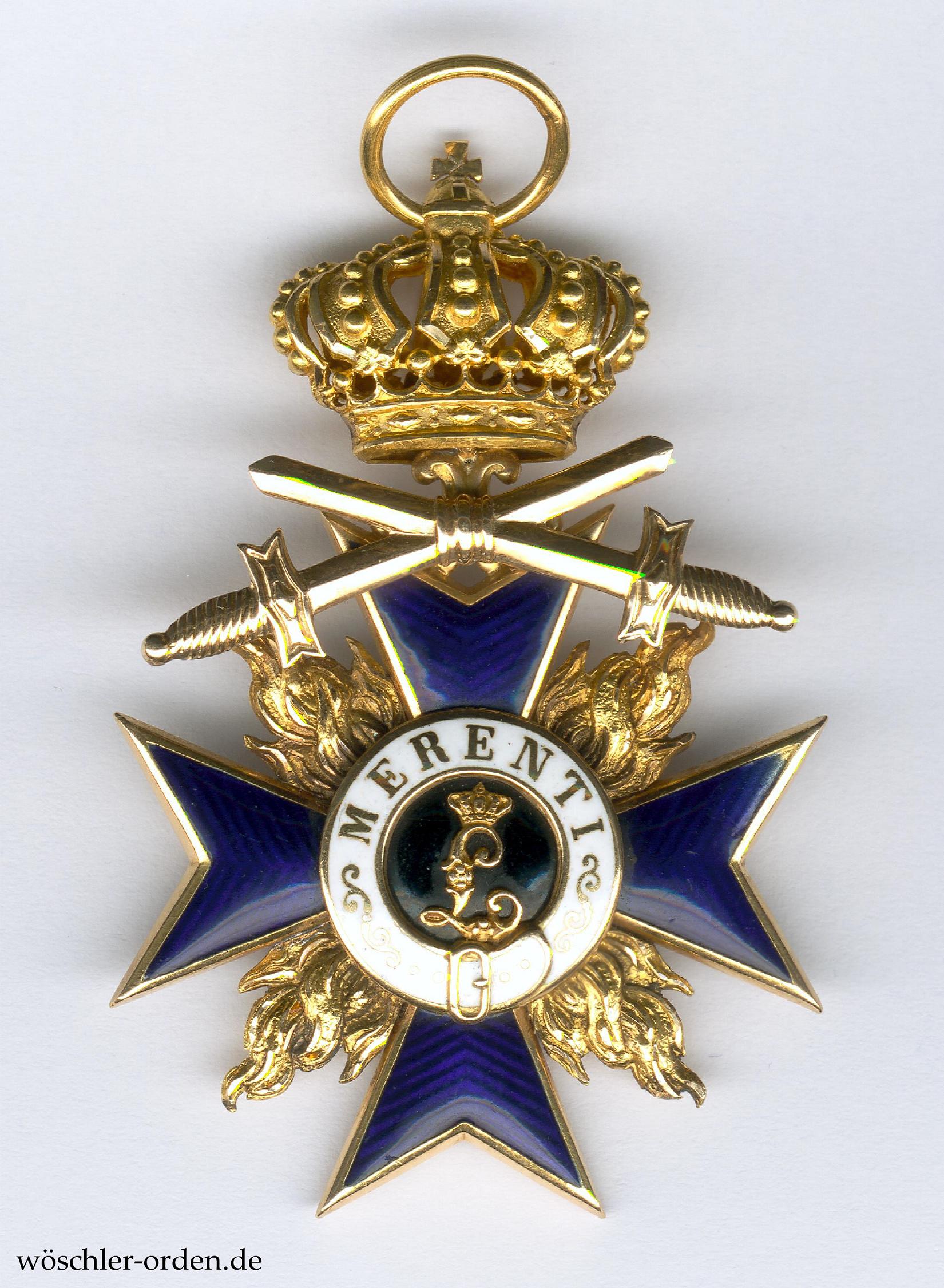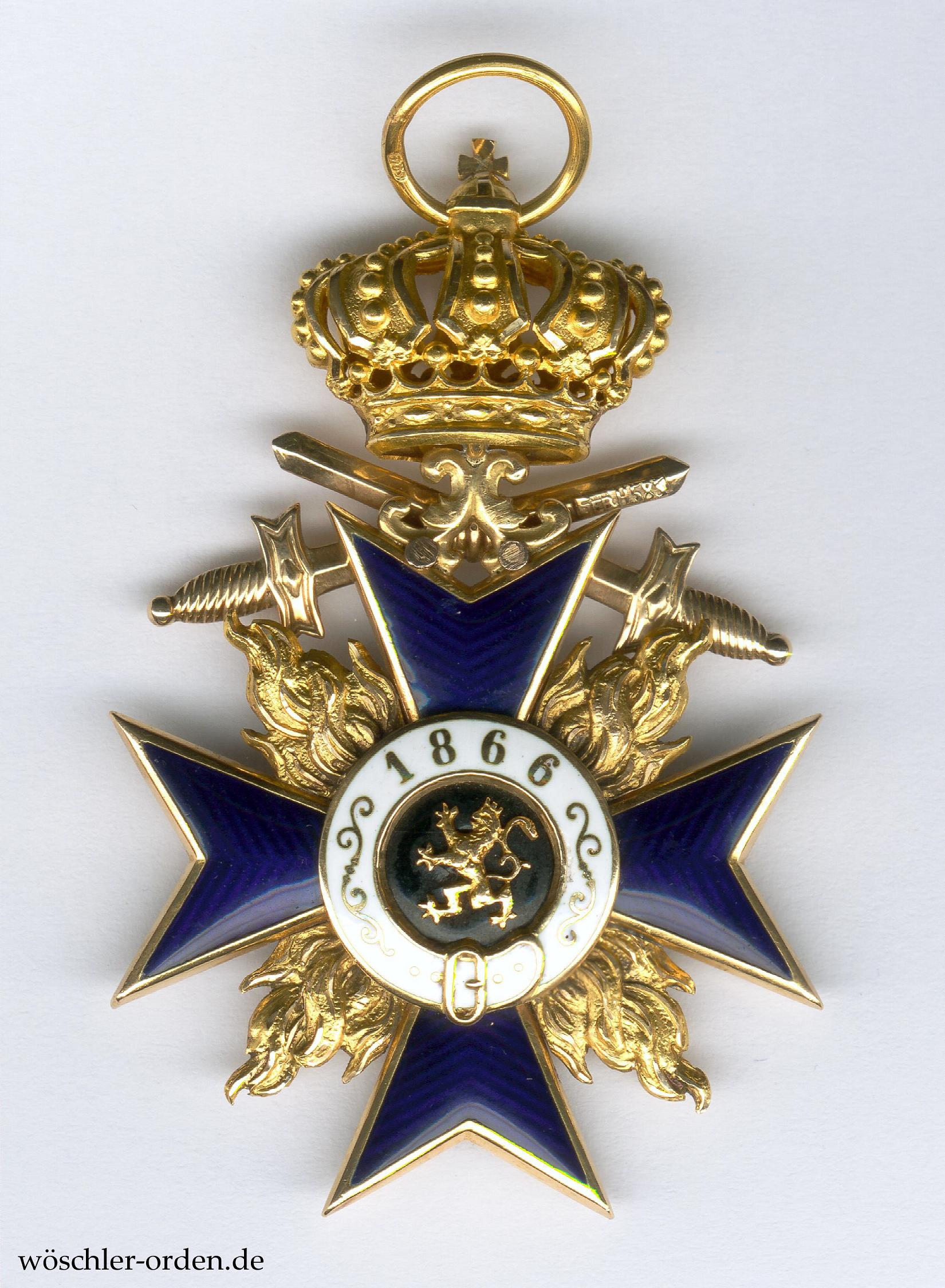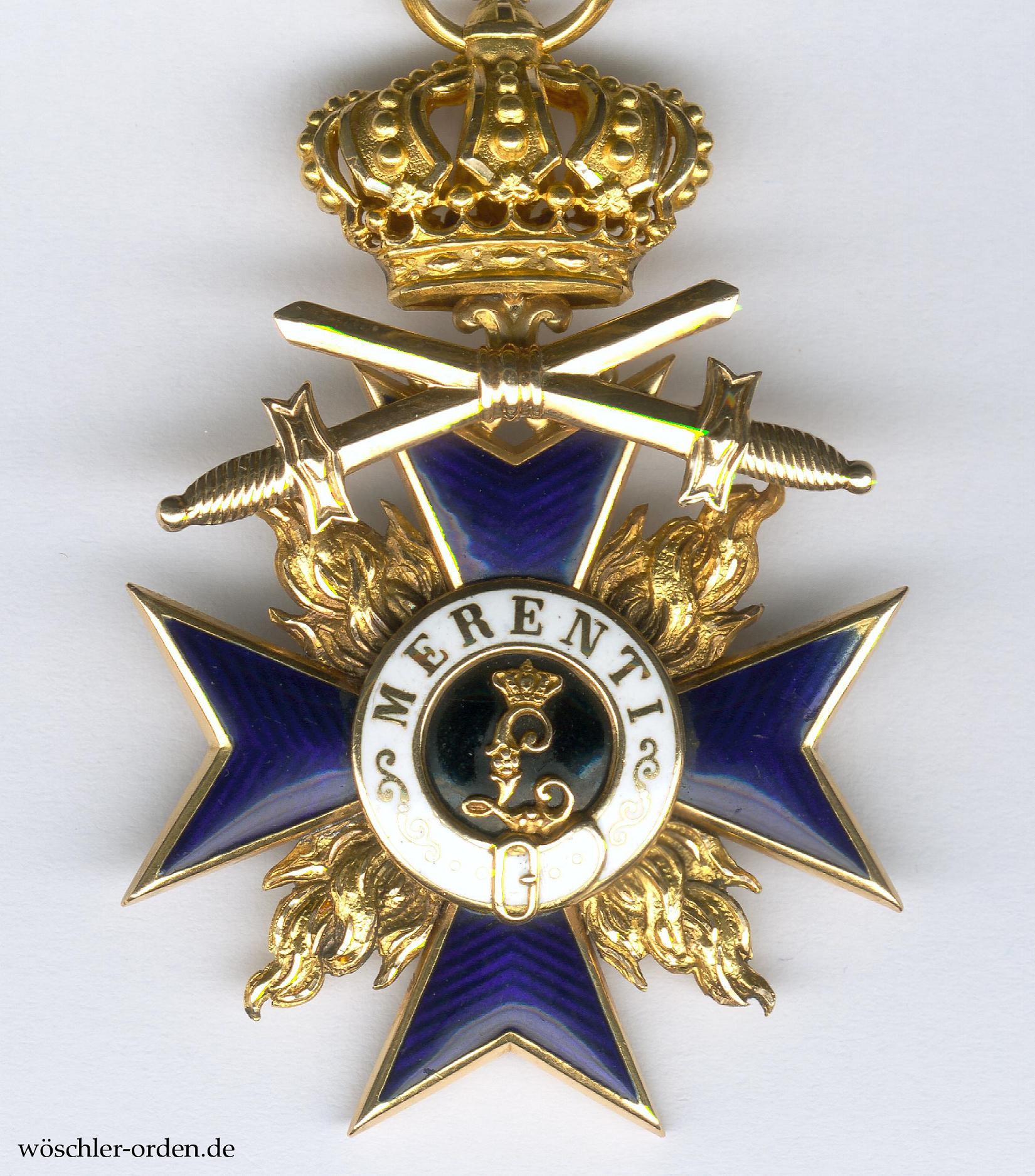 Es handelt um ein Ritterkreuz des ersten, bis 1905 gefertigten Modells aus der Fertigung von Hausinger oder Elchinger, wie es zu Beginn des Weltkriegs im Auftrag der Ordenskanzlei durch Hemmerle in eine Kriegsdekoration mit Krone umgewandelt wurde.
