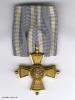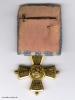 Bronze einteilig geprägt, vergoldet und patiniert, an geschlossenem Bandring. An Einzel-Ordensschnalle mit gerafft vernähtem Band, rückseitig roséfarbene Seidenabdeckung.
