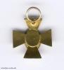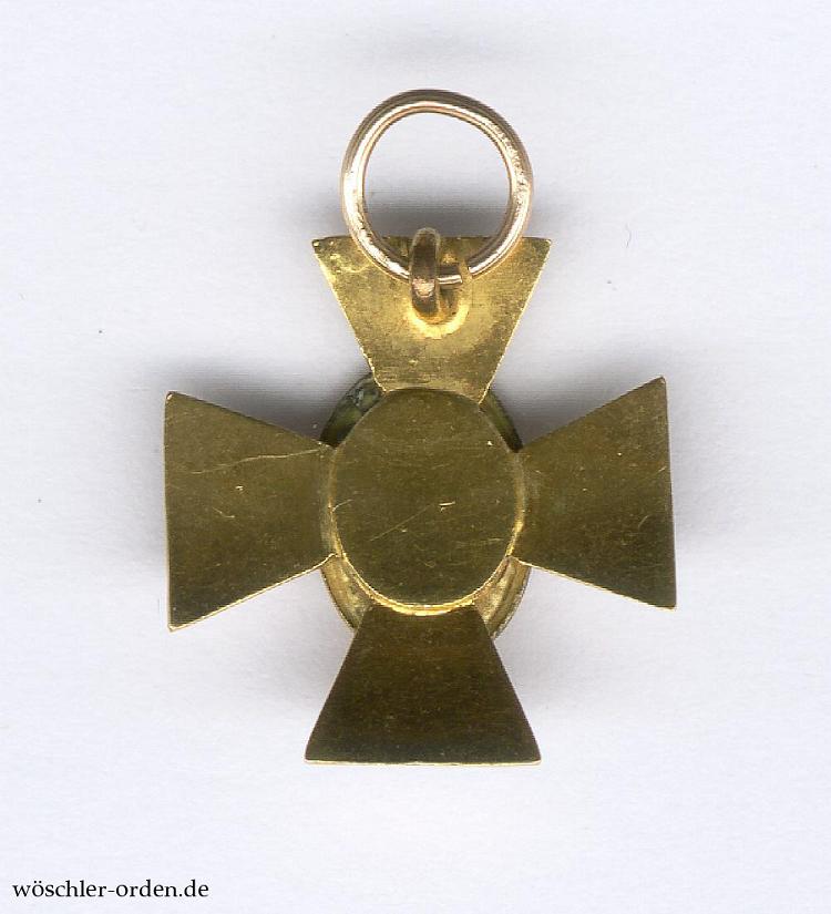 Miniatur, etwa 16,5 mm x 15,5 mm. Gold und Emaille, mehrteilig gefertigt. Die Rückseite glatt, mit auf dem oberen Kreuzarm angelöteter kleiner Ringöse mit zusätzlichem, offenem Ringchen. Ohne Herstellersignatur, jedoch sicherlich aus Fertigung eines der offiziellen Ordensjuweliere, wohl am ehesten der Gebrüder Hemmerle, München, stammend.