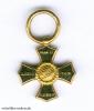 Miniatur, etwa 19 mm x 17 mm. Bronze gegossen und vergoldet, die Kreuzarmfelder grün lackiert. An stabiler Ringöse mit geschlossenem Bandringchen.