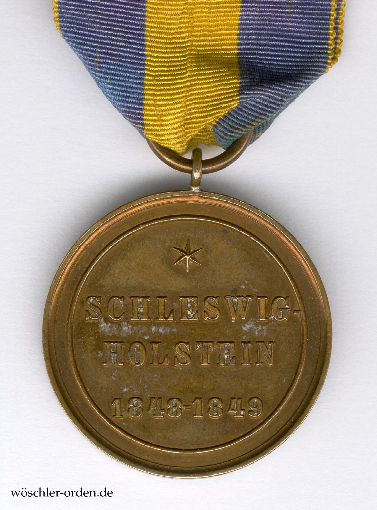Bronze geprägt, an einer einfachen angelöteten Ringöse mit offenem Bandring. Vorderseitig das gekrönte Monogramm des Herzogs Wilhelm in einem Lorbeerkranz, darunter die Signatur „C. P.“ des Herzoglich Braunschweigischen Hofgraveurs Carl Peterson. Rückseitig, inmitten eines Kreises, dreizeilige Inschrift „SCHLESWIG- / HOLSTEIN / 1848-1849“ unter einem sechsstrahligen Stern.