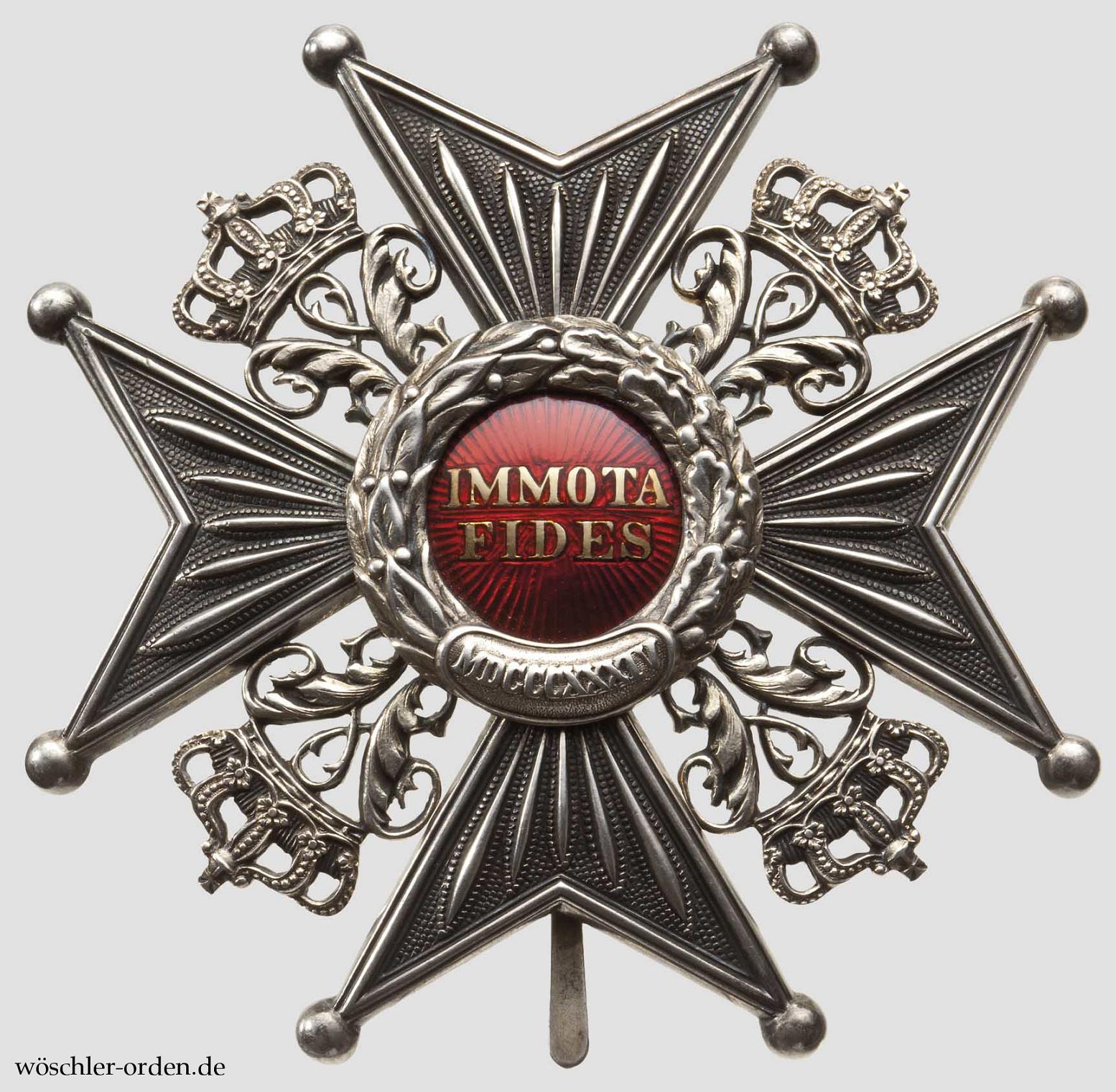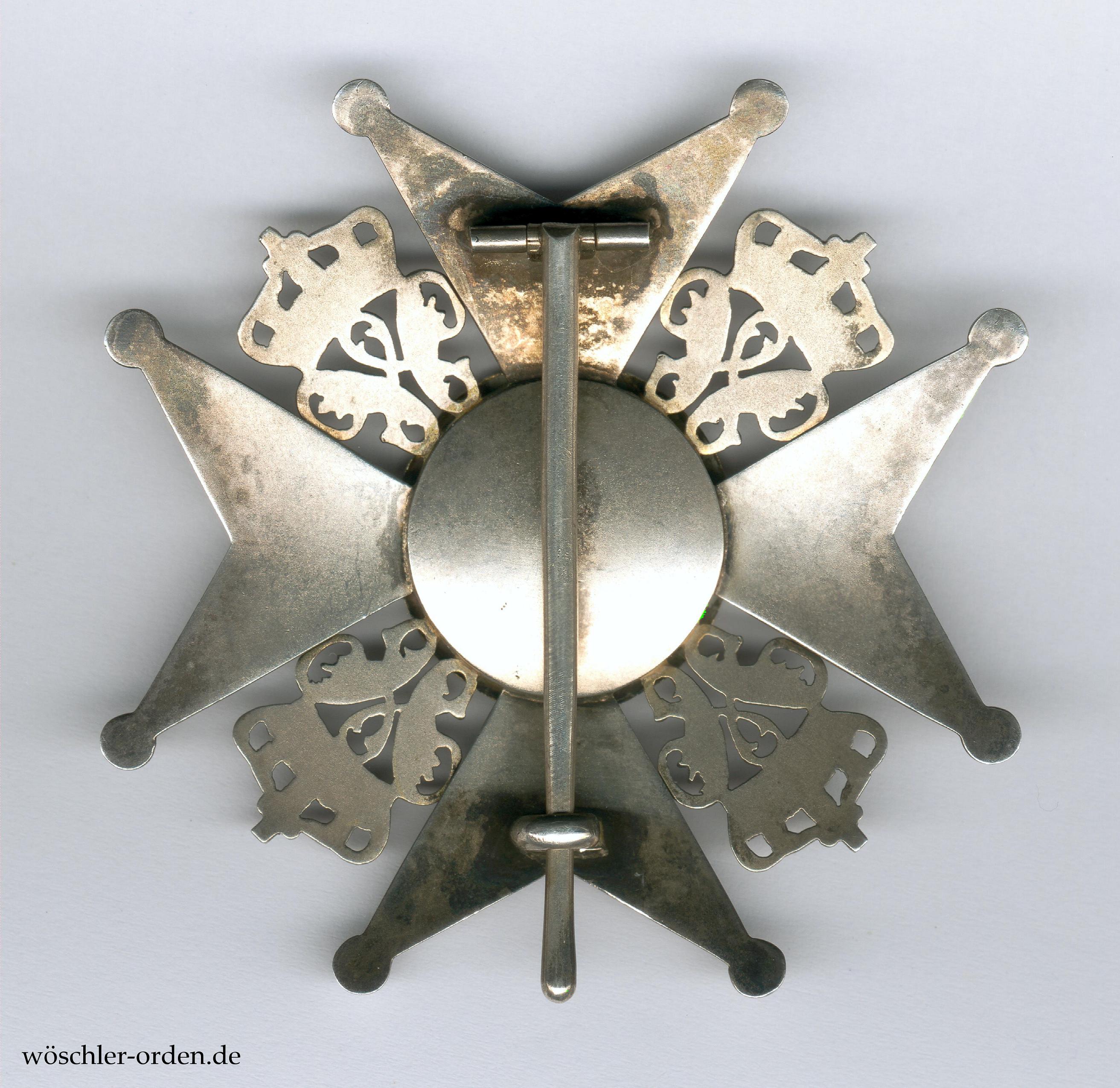 Fertigung der Firma Hermann Jürgens, die ab 1912 letzte Lieferantin war, aus der Zeit des Weltkriegs oder kurz davor. Silber, mehrteilig hohl gefertigt und verbödet, die separat eingesetzten, gekrönte Chiffren ebenso wie der Medaillonring vergoldet. Die Medaillonplatte in Gold gefertigt, strahlenförmig handgraviert und transluzid rot emailliert. An dünner Drahtnadel mit halbrundem Durchschnitt. Für ein beinahe identisches Stück, jedoch mit Schwertern, vgl. Klenau, Seite 173.