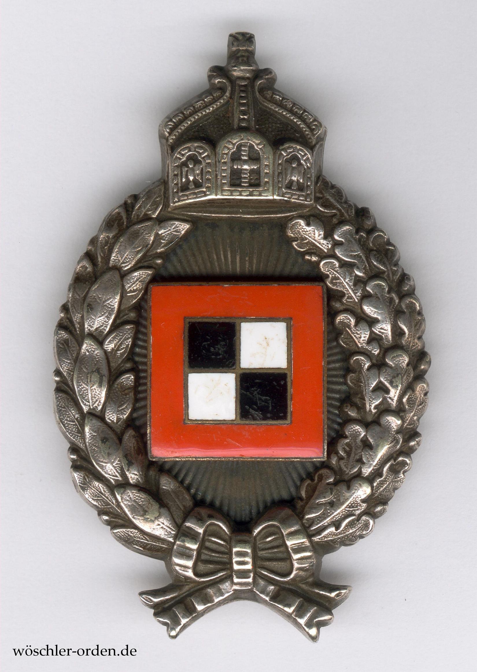 Exemplar wohl aus der Fertigung für die späteren Weltkriegsverleihungen. Silber hohlgeprägt und verbödet, mit aufgesplinteter „Standarte des Armeeoberkommandos“, diese rückseitig (nachträglich?) mit Lötpunkten fixiert. An angelötetem Nadelsystem mit dünner, runder Tragenadel. Ohne ersichtliche Herstellermarkierung handelt es sich um eine typische Fertigung der Firma C. E. Juncker, Berlin.