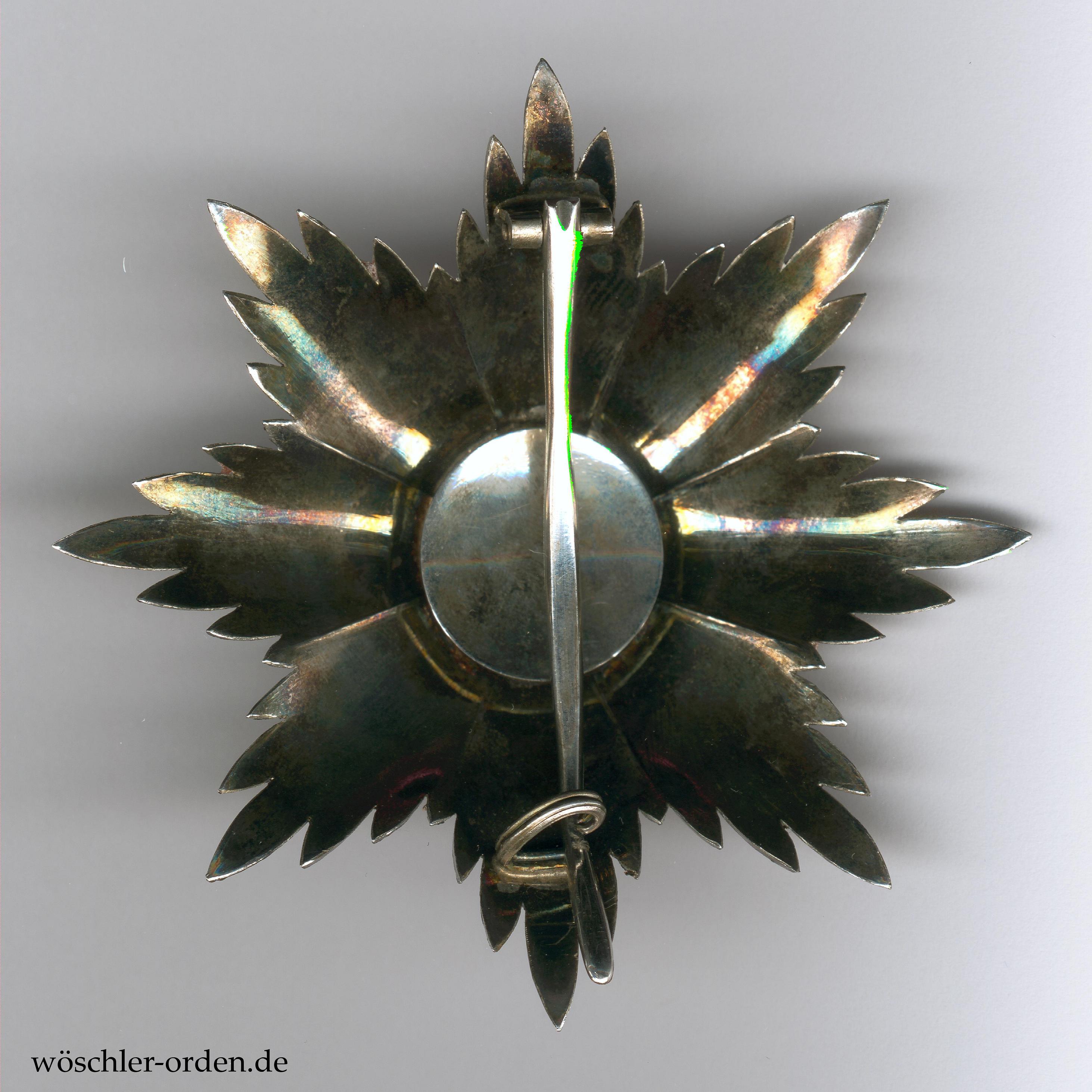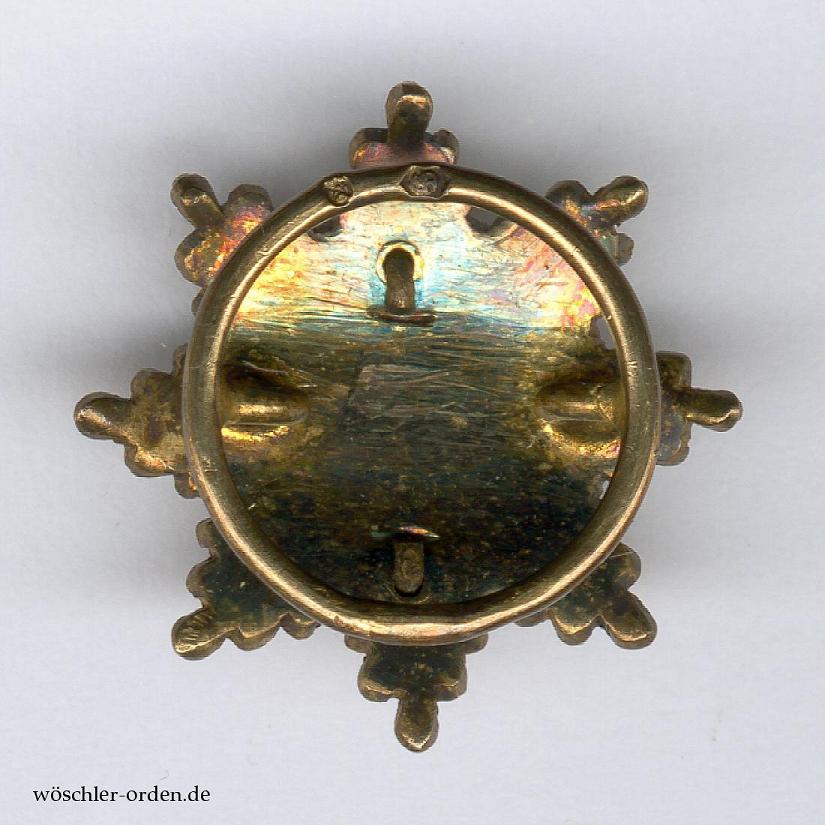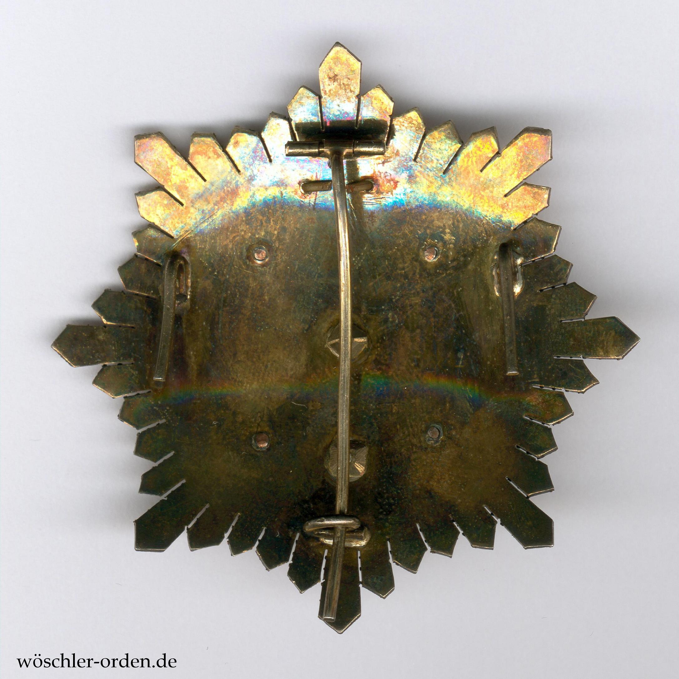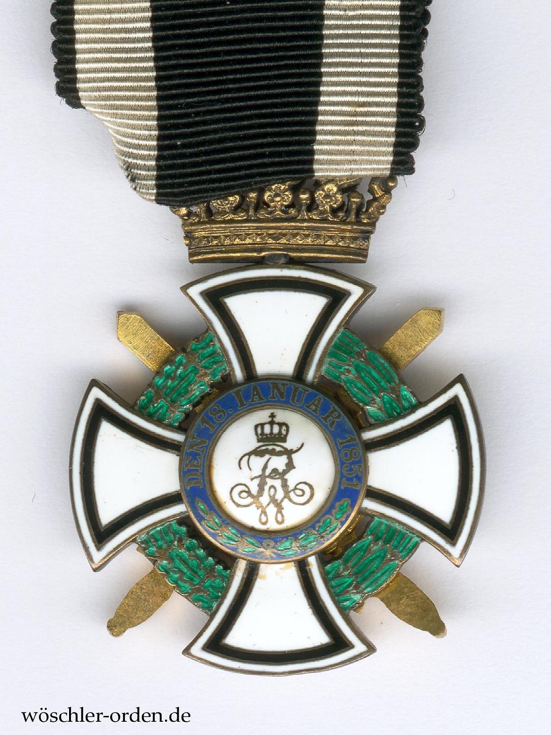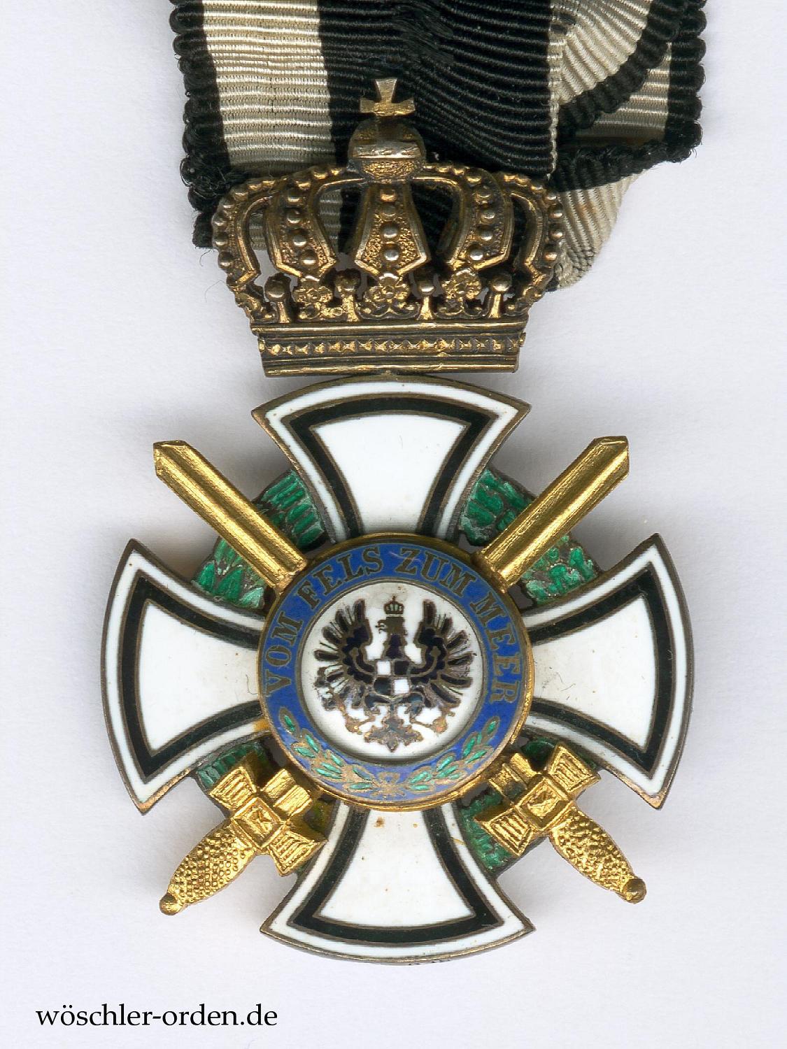 - Preußen, Hausorden von Hohenzollern, Kreuz der Ritter mit Schwertern. Silber-vergoldetes Stück aus der zweiten Weltkriegshälfte (1917/18), auf dem unteren Kreuzarm Silberpunze „938“ und Ritzmarke „W“ für Joh. Wagner & Sohn, Berlin.