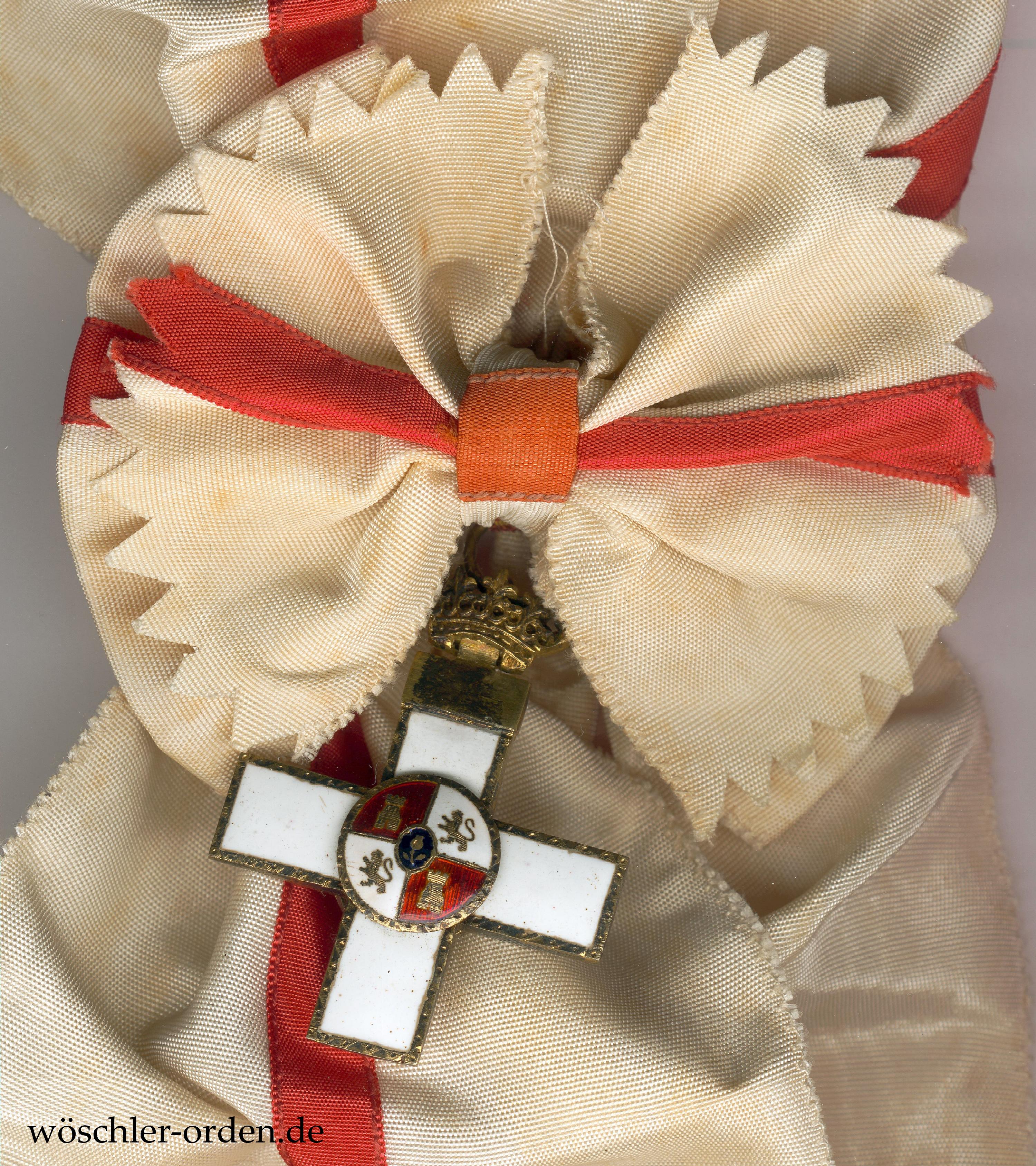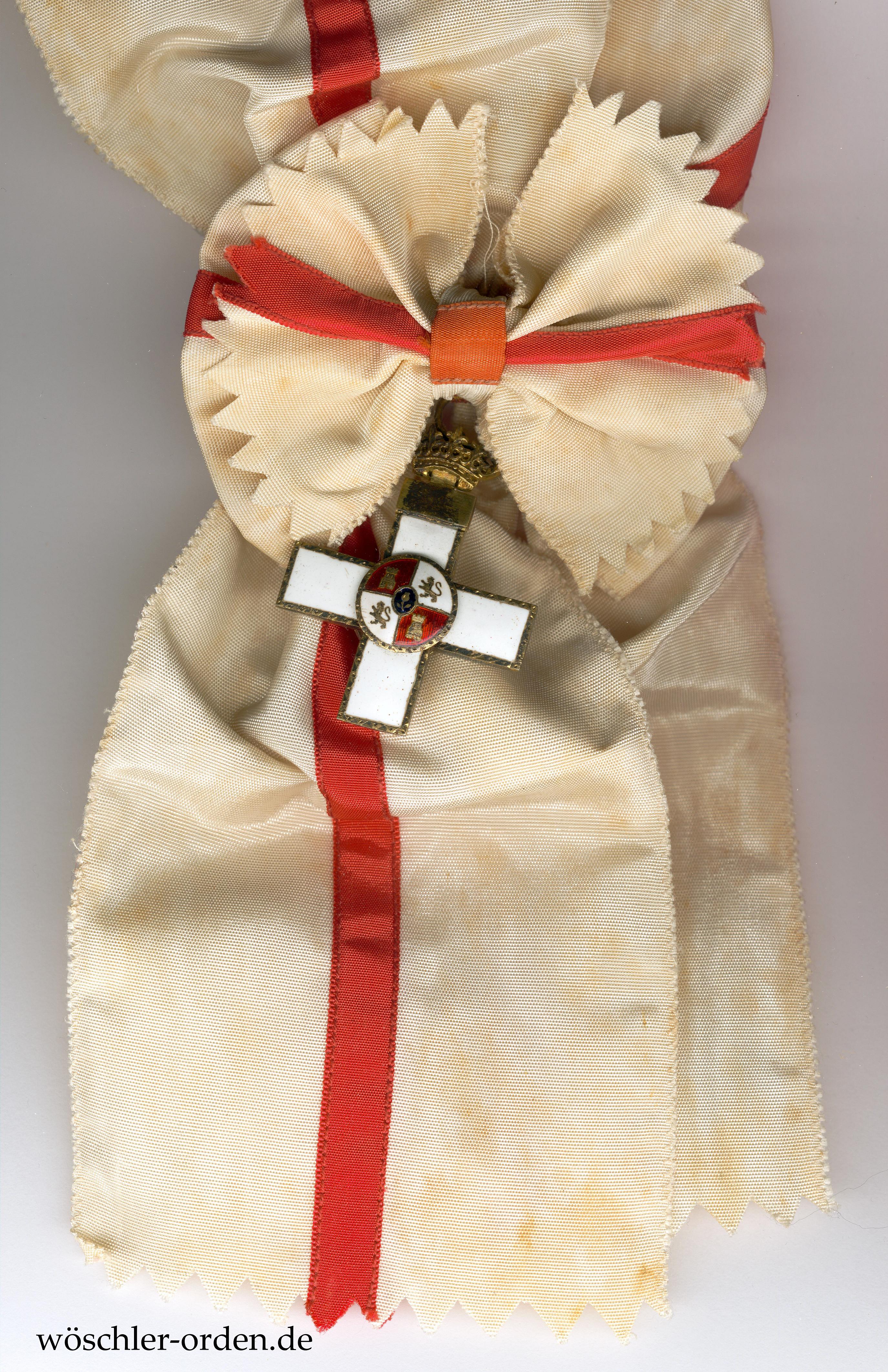 Preußen, Hausorden von Hohenzollern, Kreuz der Ritter mit Schwertern. Reduktion (sog. „Prinzengröße“), etwa 44 mm x 29 mm, an Bandstück. Silber-vergoldet, auf dem unteren Kreuzarm punziert „JG&S“ für J. Godet & Sohn, Berlin, und „938“ für den Silberfeingehalt. Seltenes Stück in ansprechender Qualität und Ausführung!