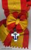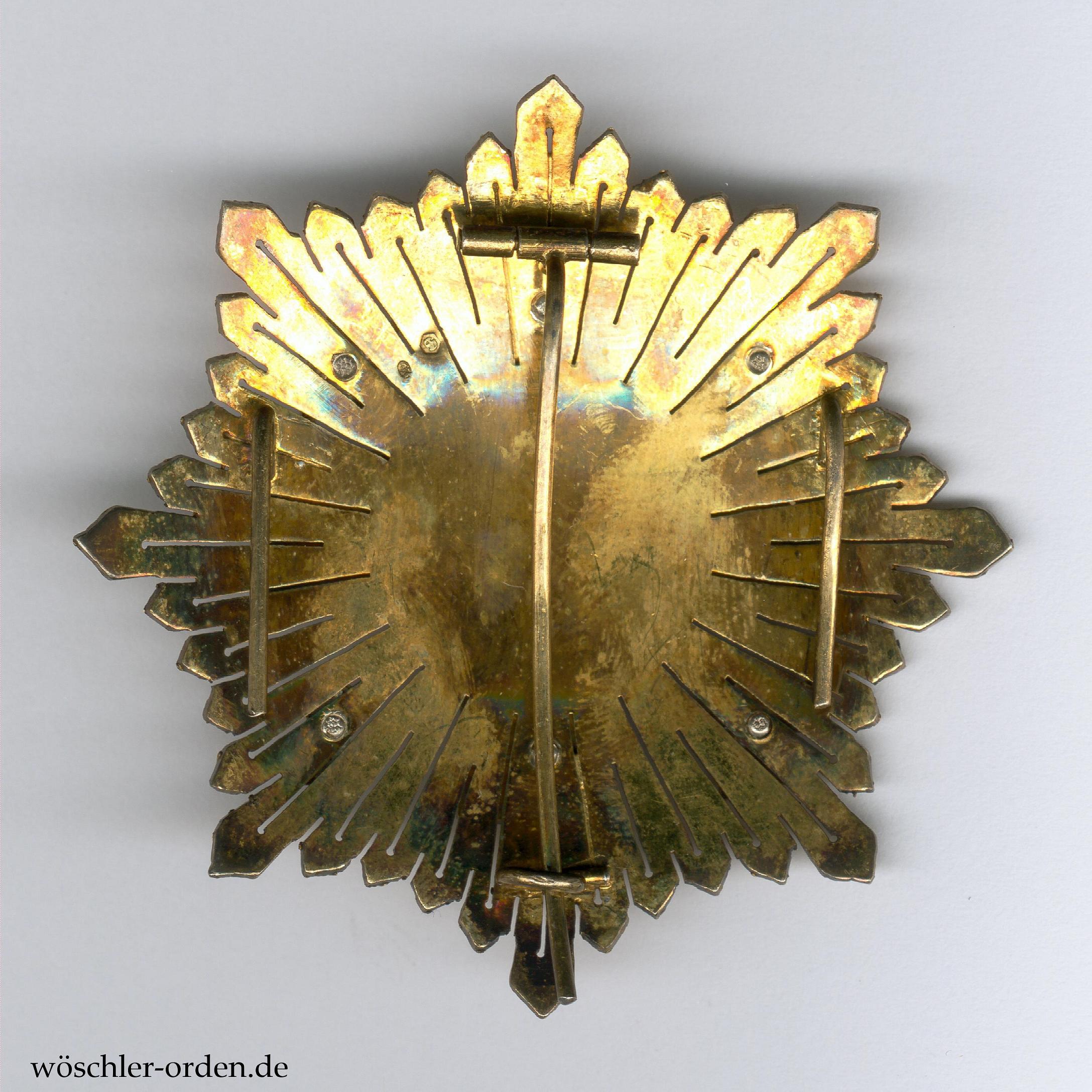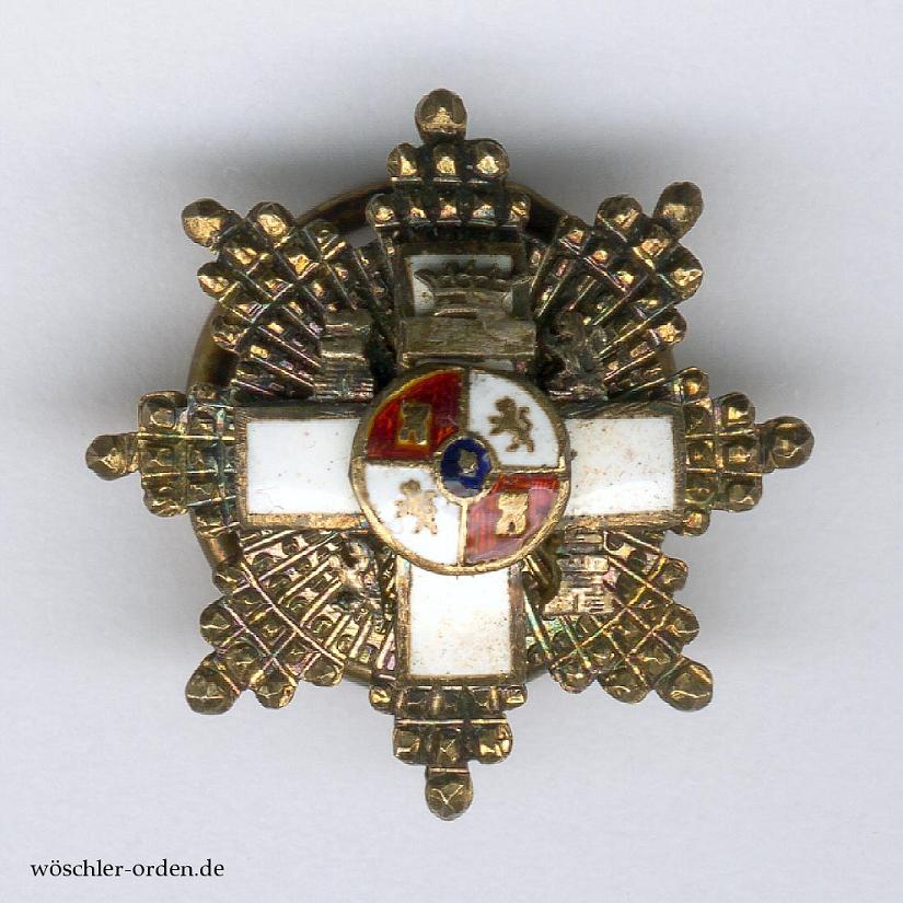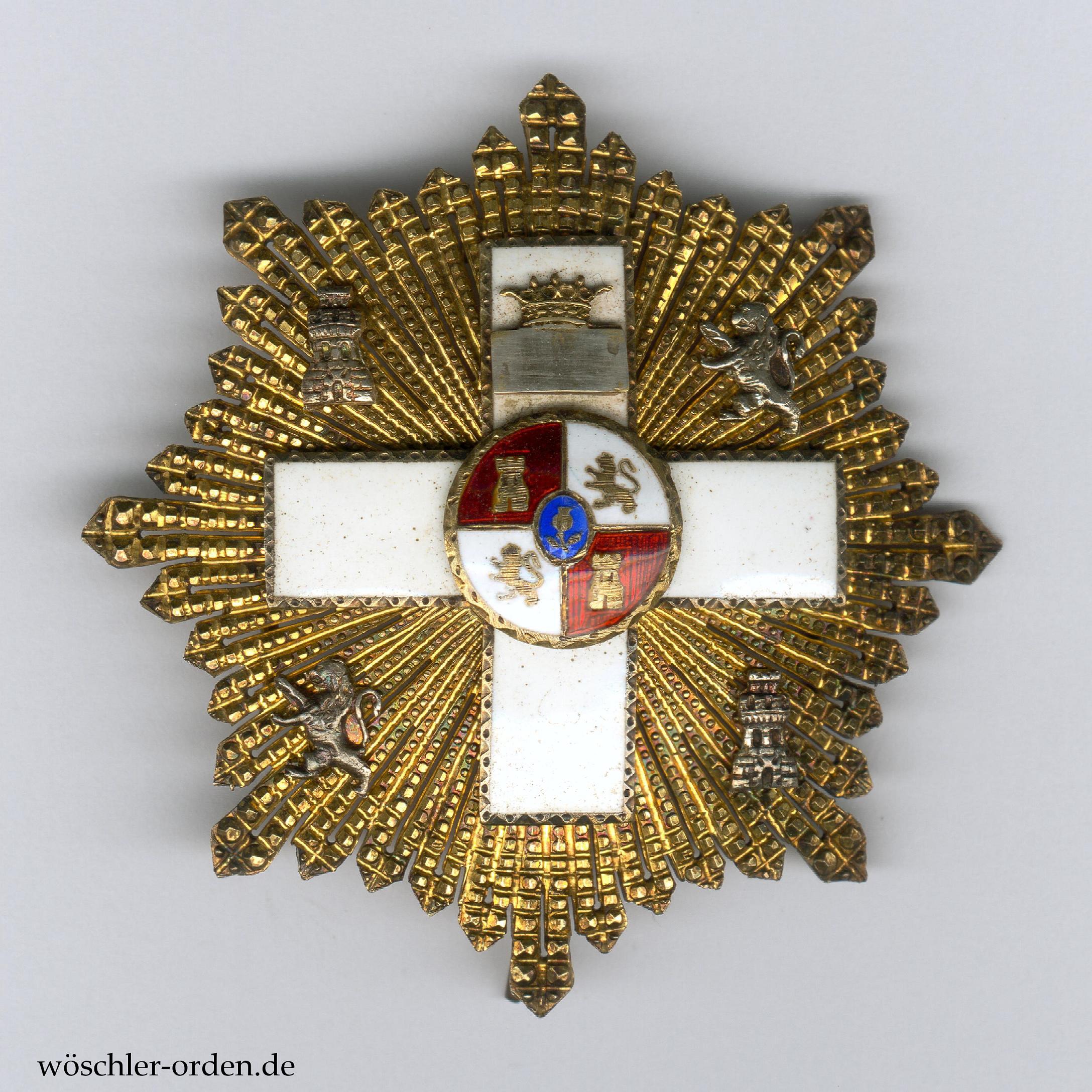 Spanien, Militär-Verdienstorden (Orden del Mérito Militar), Set der 4. Klasse (Großkreuz) der weißen Abteilung (für Verdienste in Friedenszeit) des Modells 1938 – 1975 (Franco-Ära), bestehend aus Großkreuz-Kleinod, wohl silber-vergoldet und emailliert, an Schärpe und zugehörigem Bruststern, wohl ebenfalls silber-vergoldet, mit silbernen, teils emaillierten, vernieteten Auflagen. Rückseitig mehrere Punzierungen. Dazu außerdem eine Miniatur des Bruststerns, etwa 23 mm x 23 mm, silber-vergoldet mit emaillierter, aufgeklammerter Auflage, an Tragebügel, dieser mehrfach punziert.