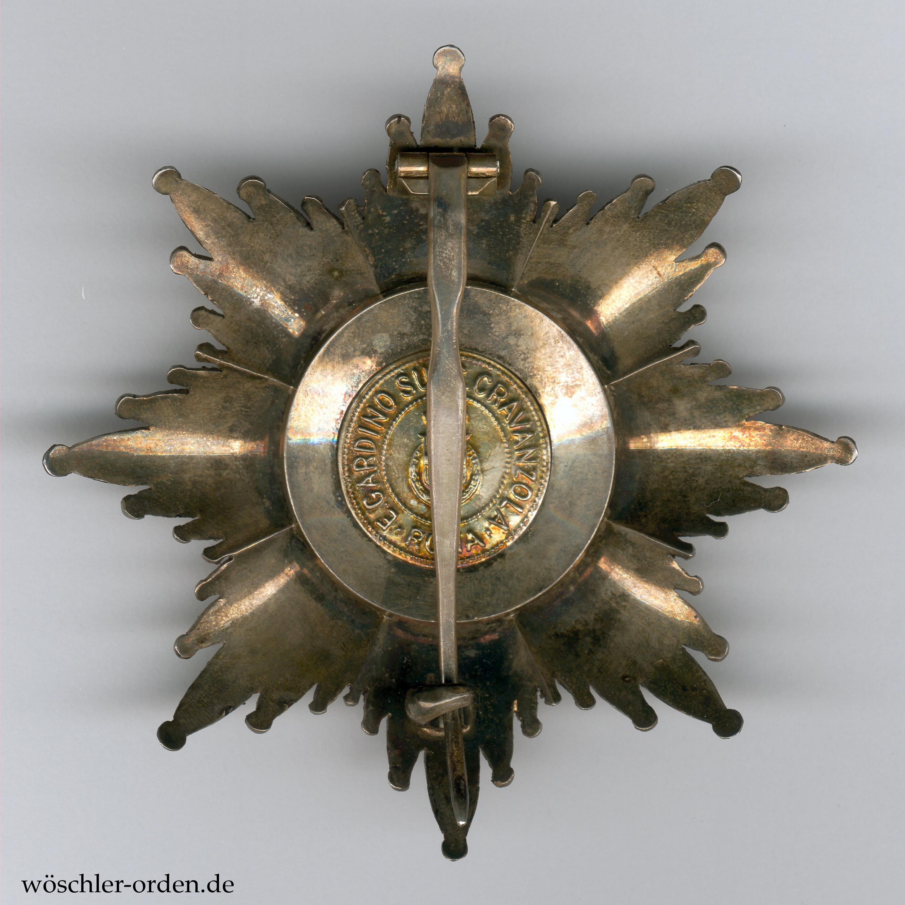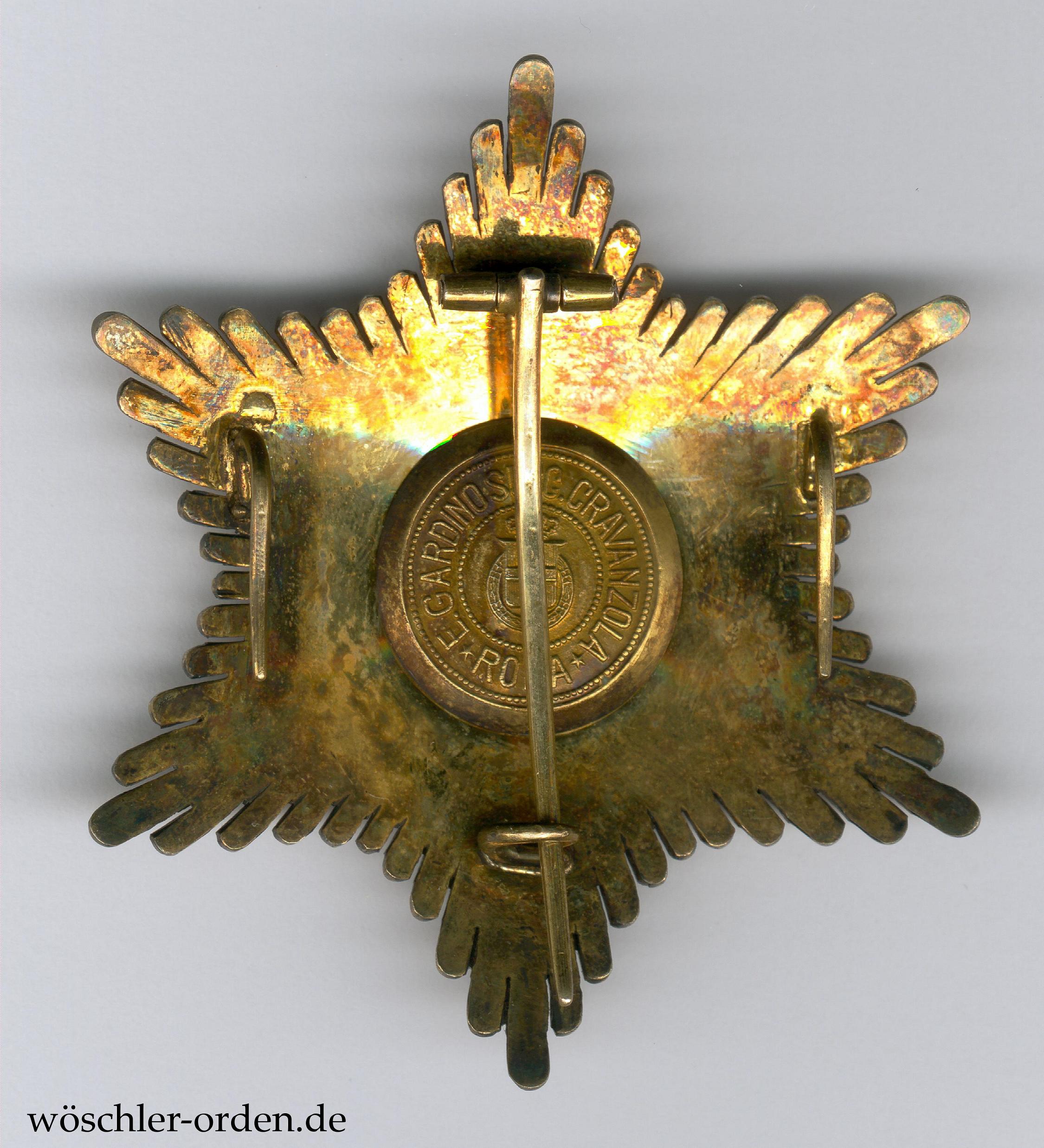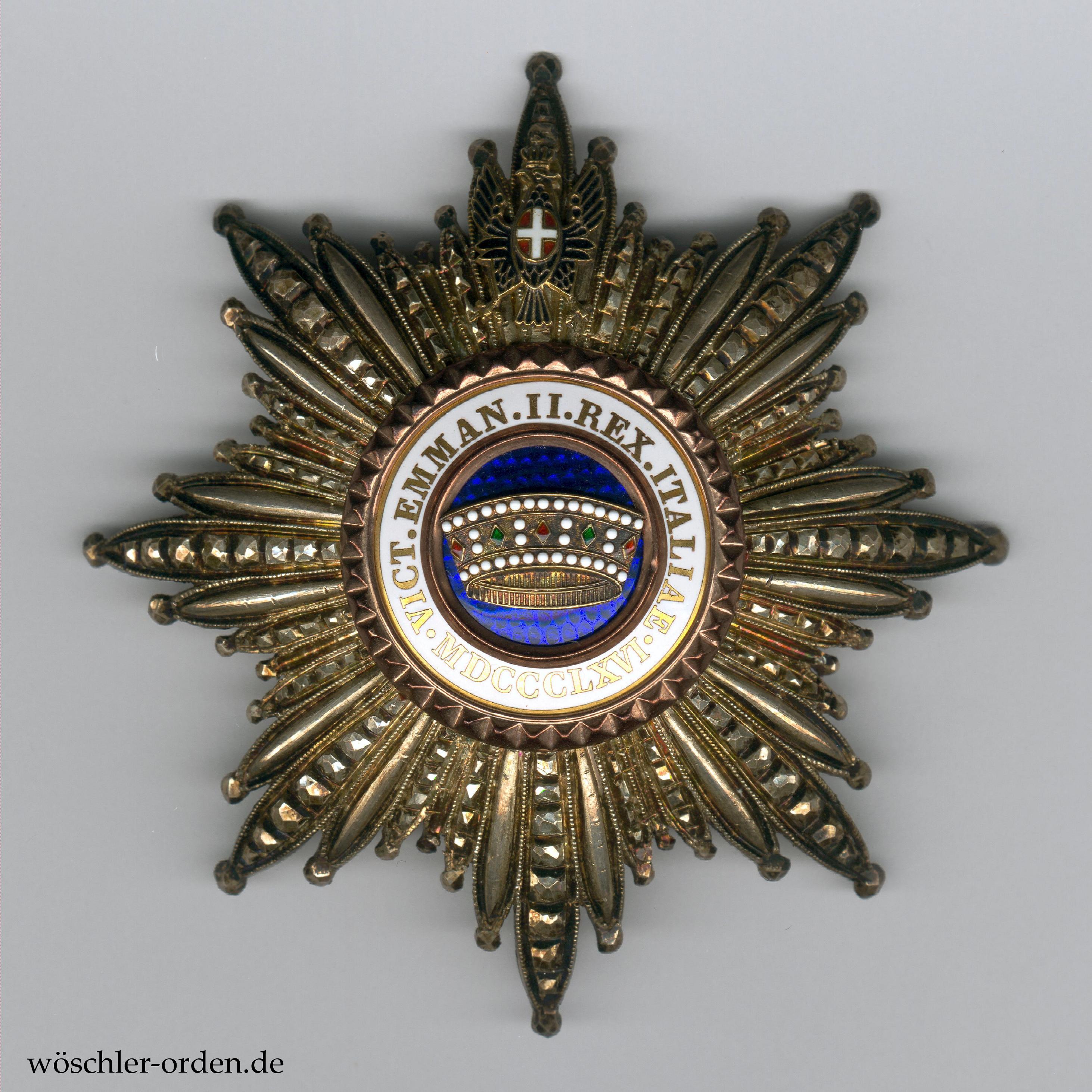Italien, Orden der Krone Italiens (Ordine della Corona d'Italia), Großkreuz-Set, bestehend aus Großkreuz-Kleinod, wohl Gold und Emaille, an Schärpe und zugehörigem Bruststern, Silber mit goldenen und emaillierten Auflage. Rückseitig Herstellermedaillon E. Gardino succ. Cravanzola, Roma, um Wappen.