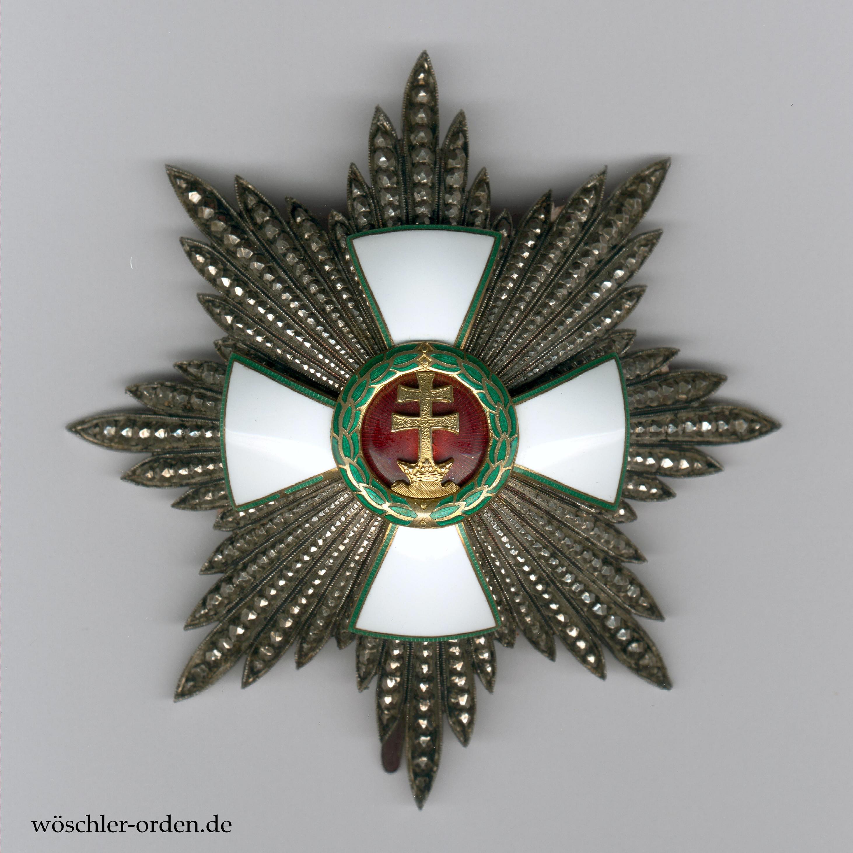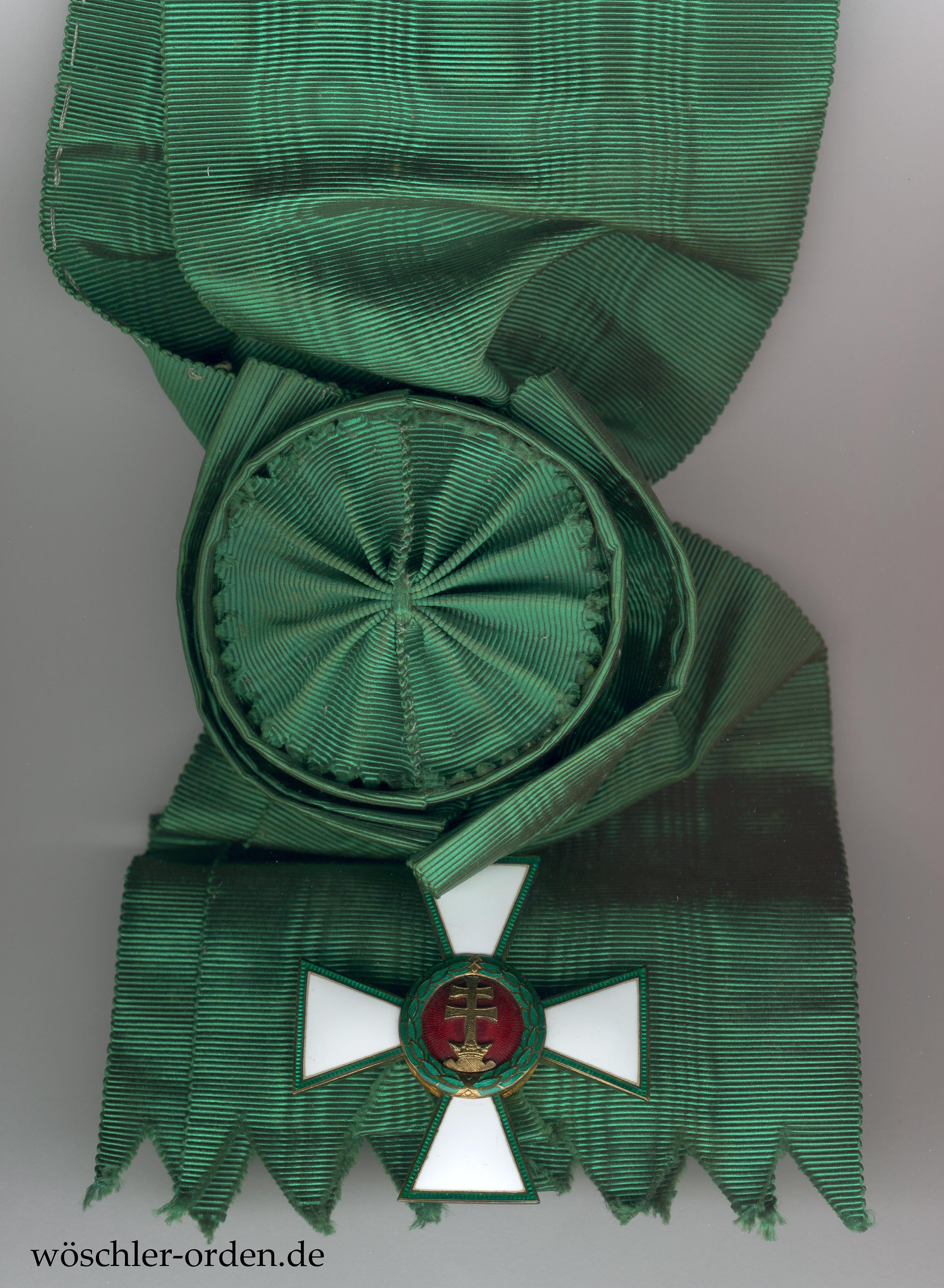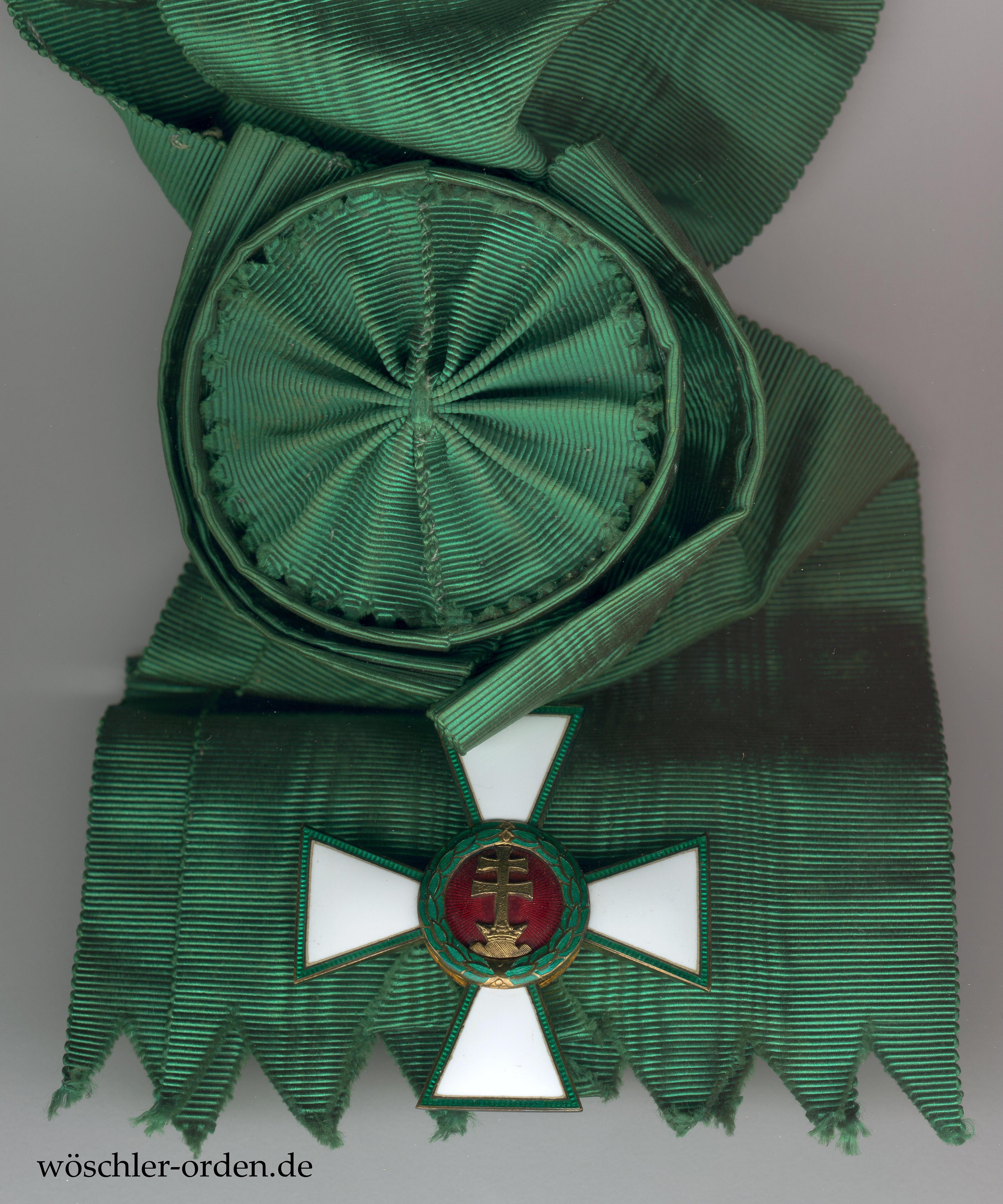 Ungarn, Verdienstorden (1922 – 1944, „Magyar Érdemrend“), Großkreuz-Set, bestehend aus Großkreuz-Kleinod, wohl silber-vergoldet, an Schärpe und zugehörigem Bruststern, Silber, mit vergoldeter und emaillierter Auflage. Die grüne Kreuzarmeinfassung beim Stern etwas schadhaft.