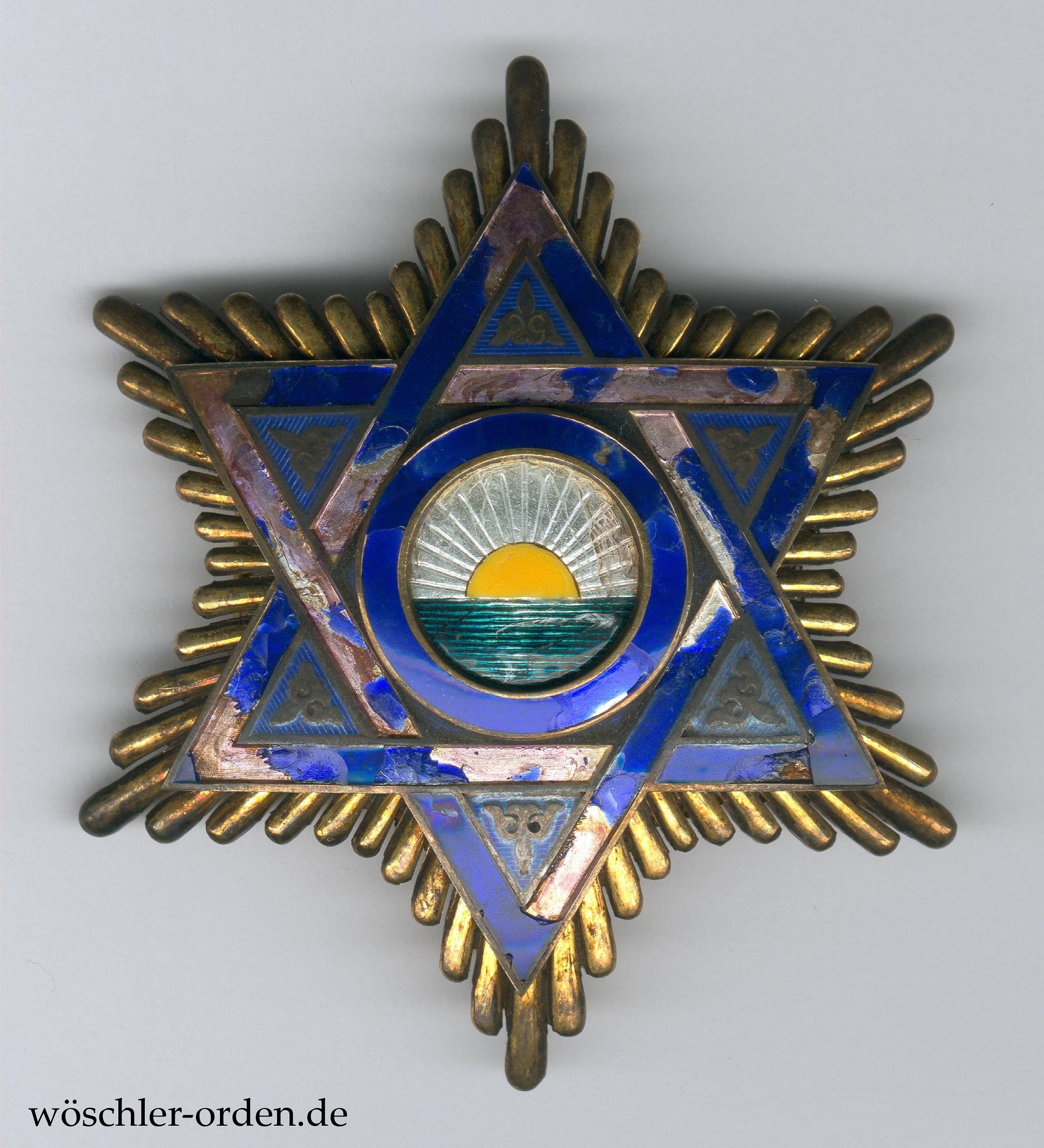 Marokko (als spanisches „Protektorat“), Mehdauia-Orden, Großkreuz-Set, bestehend aus Großkreuz-Kleinod, wohl silber-vergoldet und emailliert, an Schärpe und zugehörigem Bruststern, ebenfalls silber-vergoldet und emailliert. Rückseitig Herstellermedaillon E. Gardino succ. Cravanzola, Roma, um Wappen. Kleinod wie Bruststern mit starken Schäden der blauen Emaille!