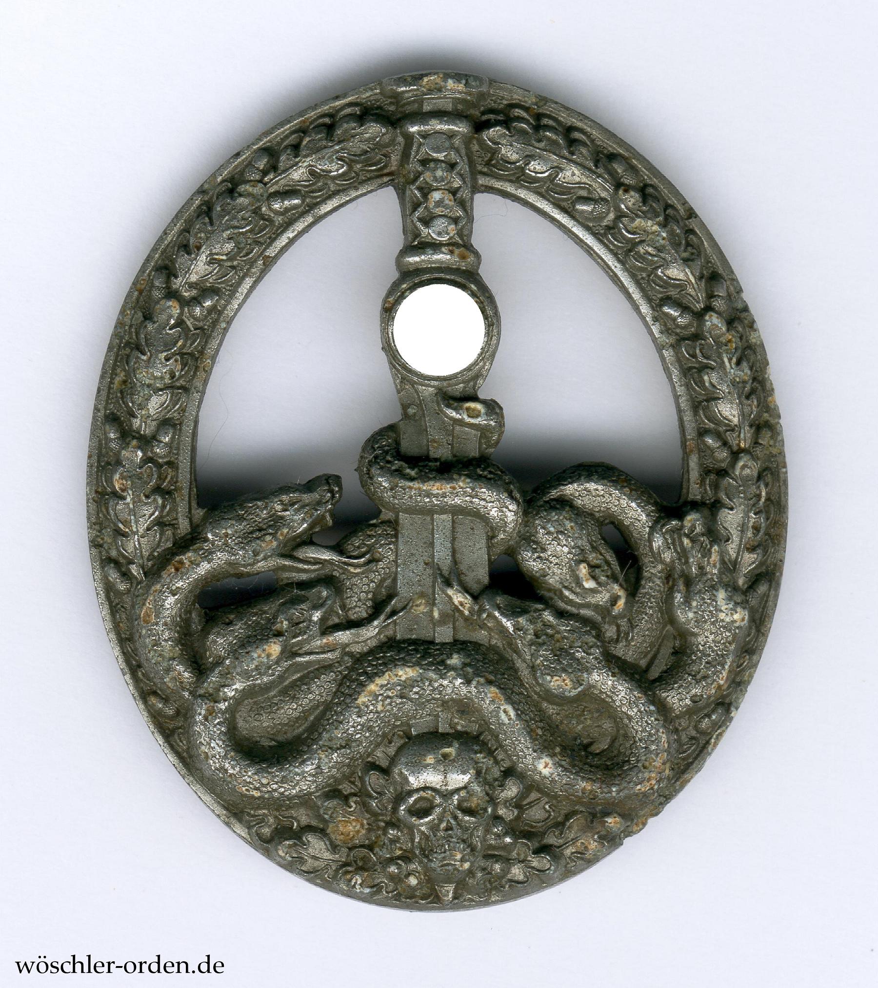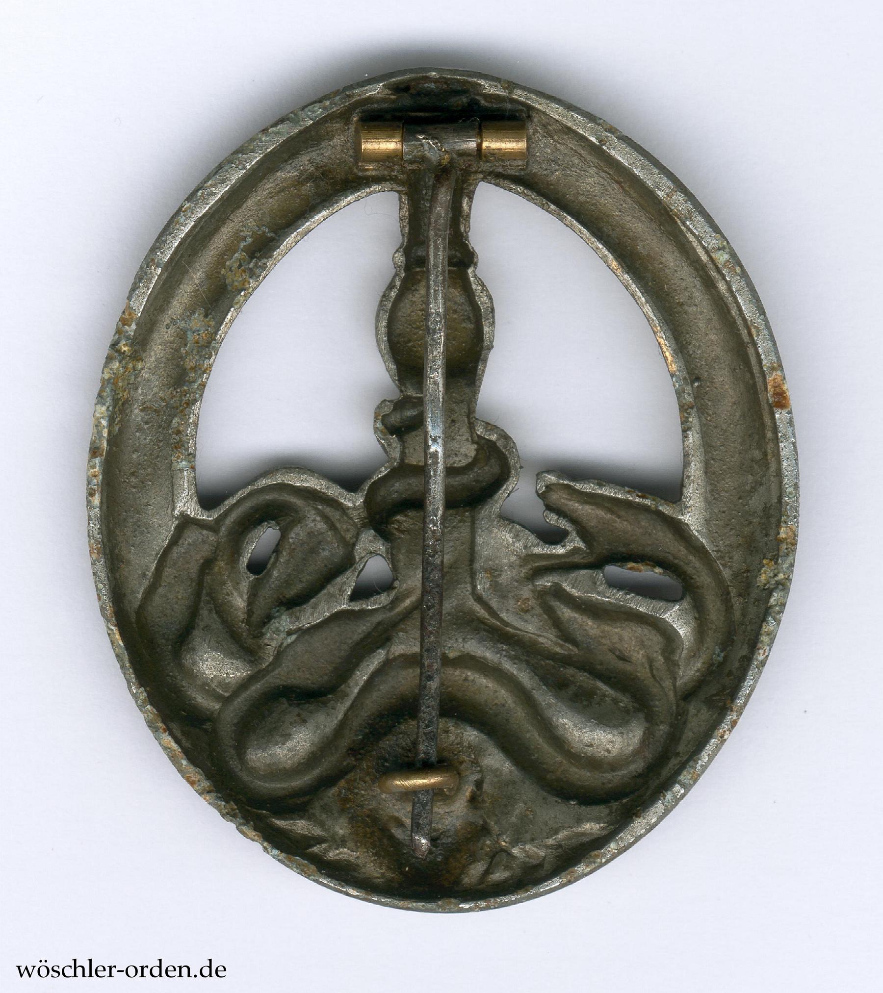 Halbhohle Fertigung wohl der Firma C. E. Juncker, Berlin. Zink geprägt und bronziert, an stählerner Tragenadel mit buntmetallenem Nadelhaken und -bock.
