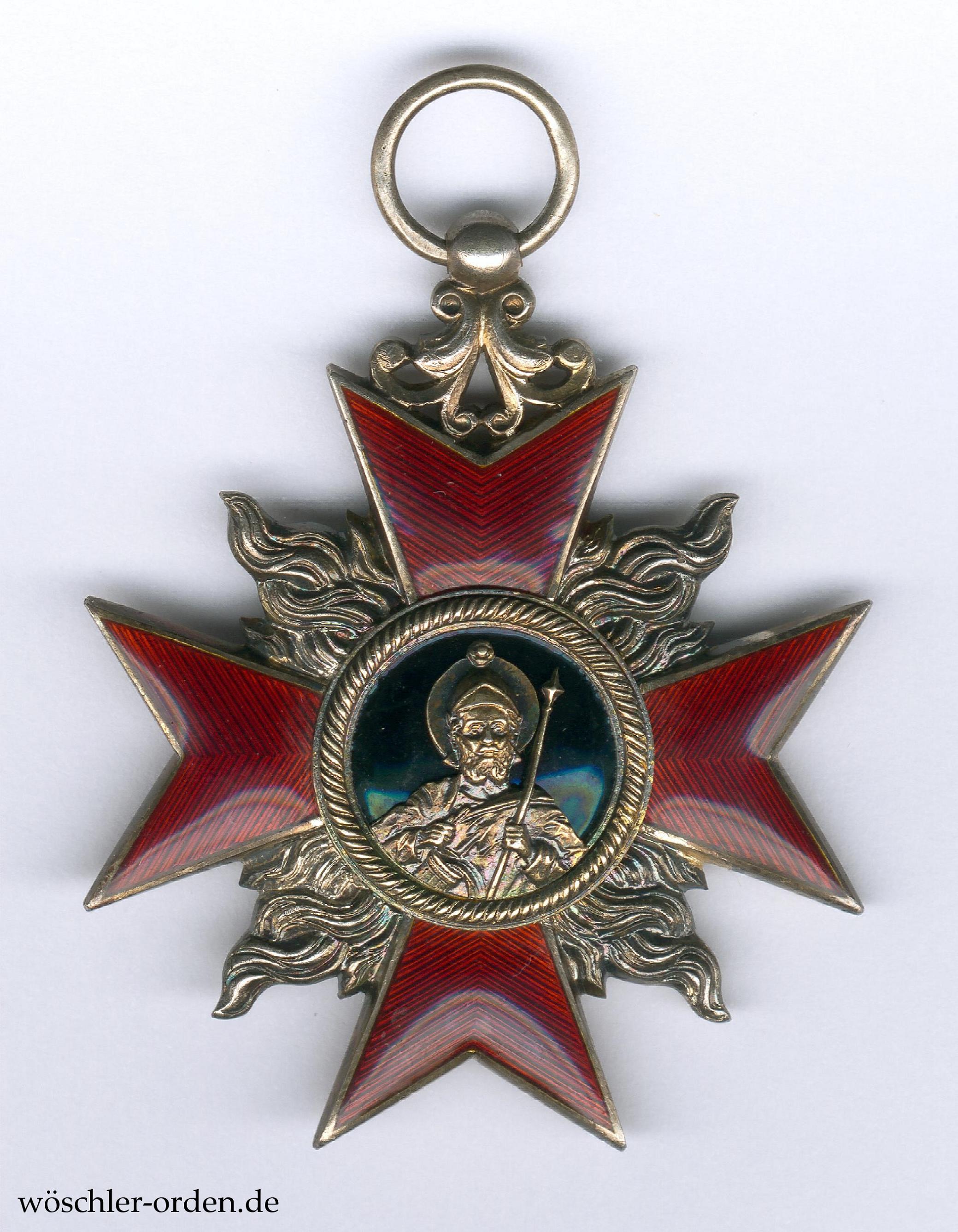 Silber, mehrteilig gefertigt, die Medaillons vergoldet. Die Kreuzarme transluzid rot, der Hintergrund des Medaillons der Vorderseite schwarz emailliert. An Zieragraffe mit geschlossenem Bandring, dieser mit etwas unleserlicher Silberpunzierung „900“.