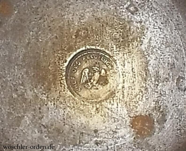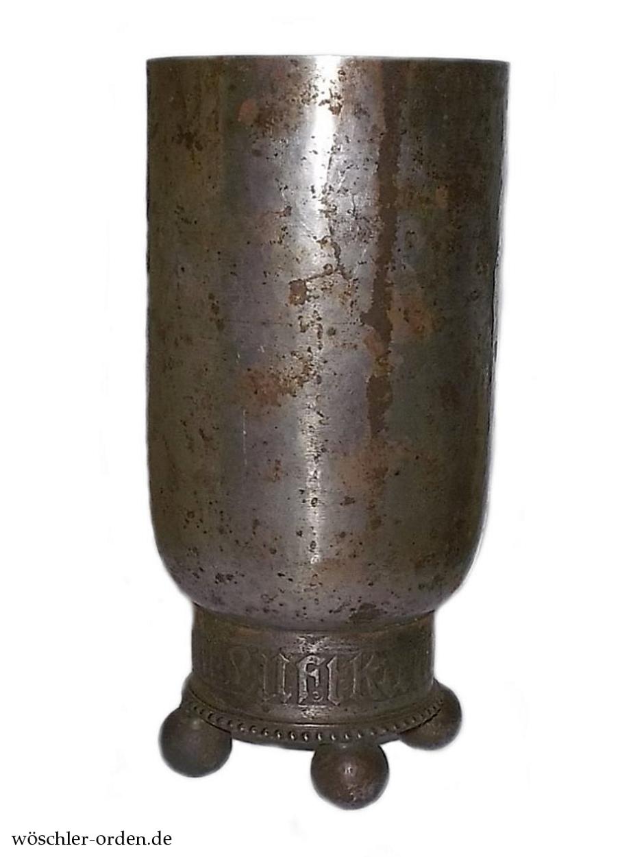 Der Holzsockel fehlt wie üblich. Die Versilberung und die Innen-Vergoldung sind vollständig verputzt, der Ehrenbecher ist insgesamt stellenweise rostig, jedoch kaum vernarbt. Obschon dieser Mangel sicherlich einfach zu verbessern wäre, muss gesagt werden, dass die rostig-eiserne Erscheinung zu dieser Auszeichnung des Ersten Weltkrieges beinahe besser als der silberne Ausgabezustand passt.