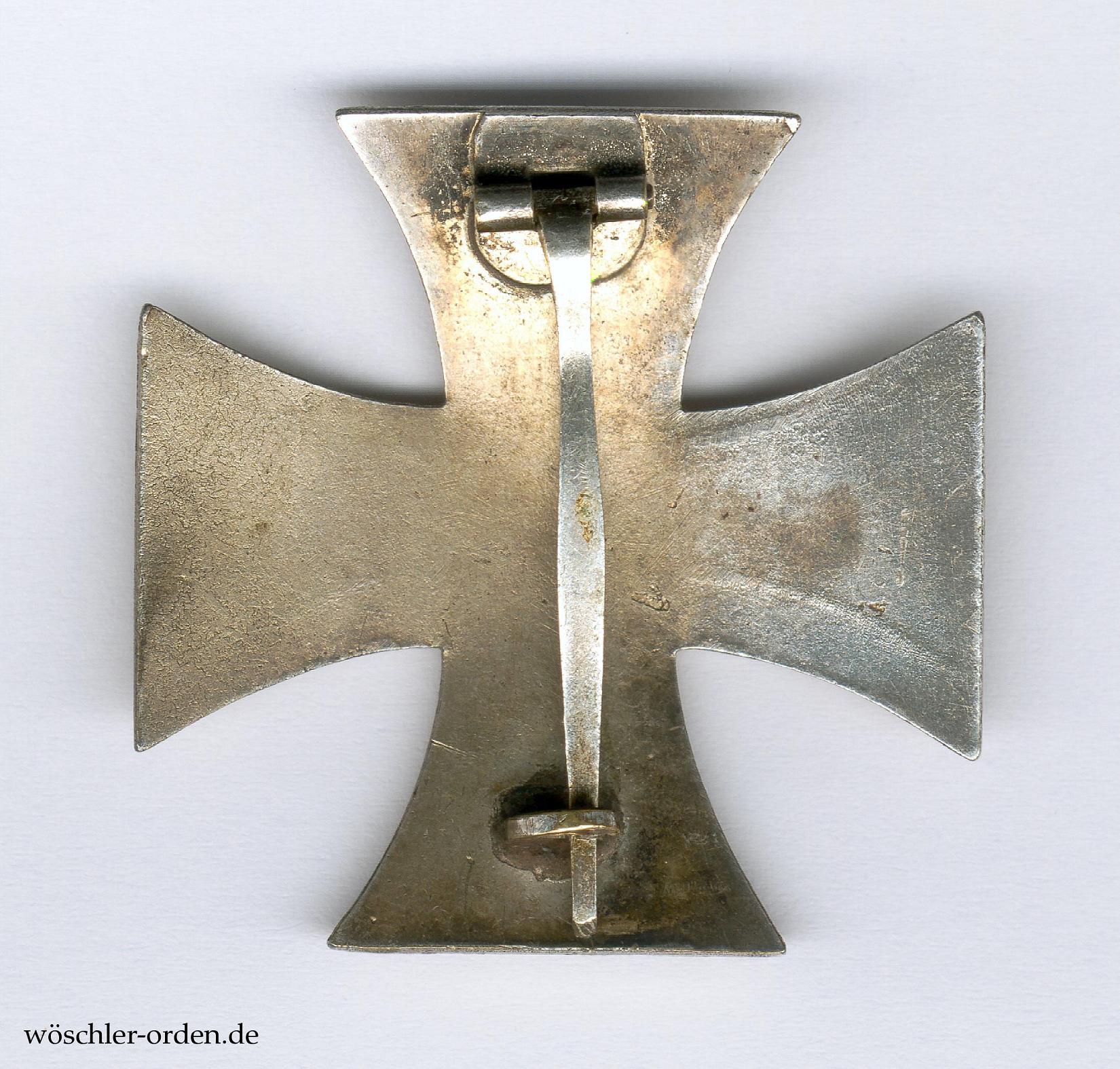 Mutmaßliches Zweitstück in einteiliger Fertigung mit den noch etwas schlankeren, geschwungenen Kreuzarmen im Stil der Kreuze der Stiftung von 1914, der sog. „Schinkelform“. Stahl geprägt und lackiert, an buntmetallenem Nadelsystem mit ebenfalls buntmetallener Nadel.