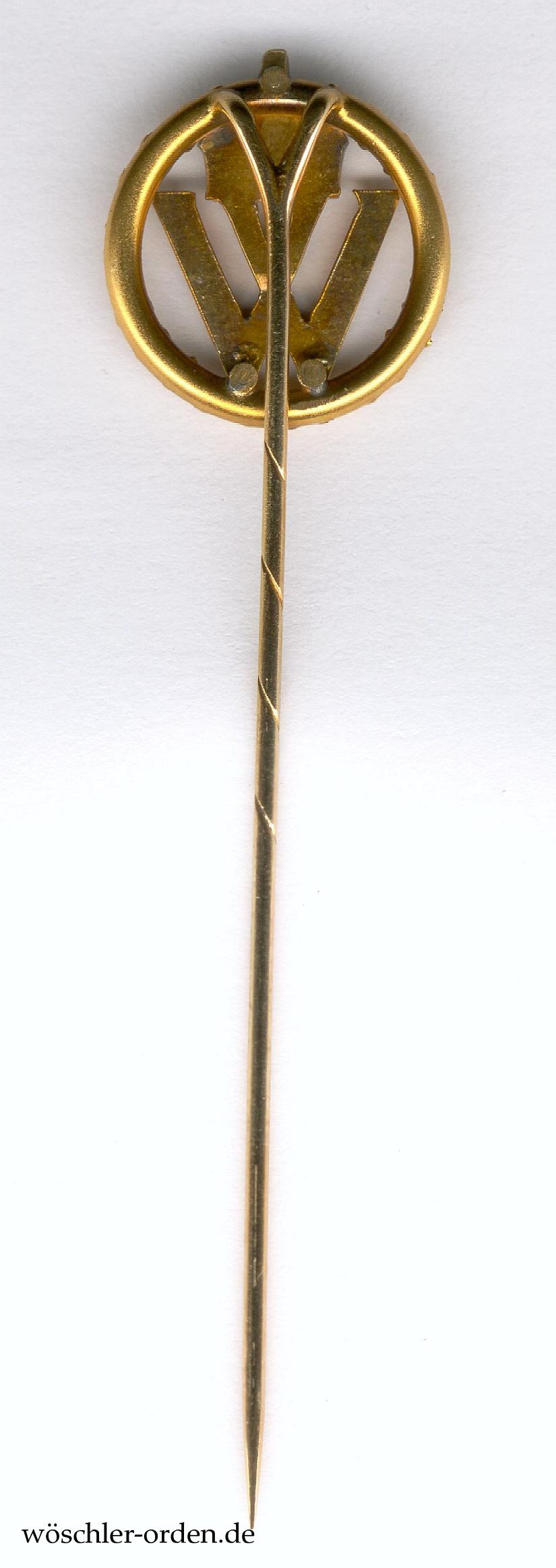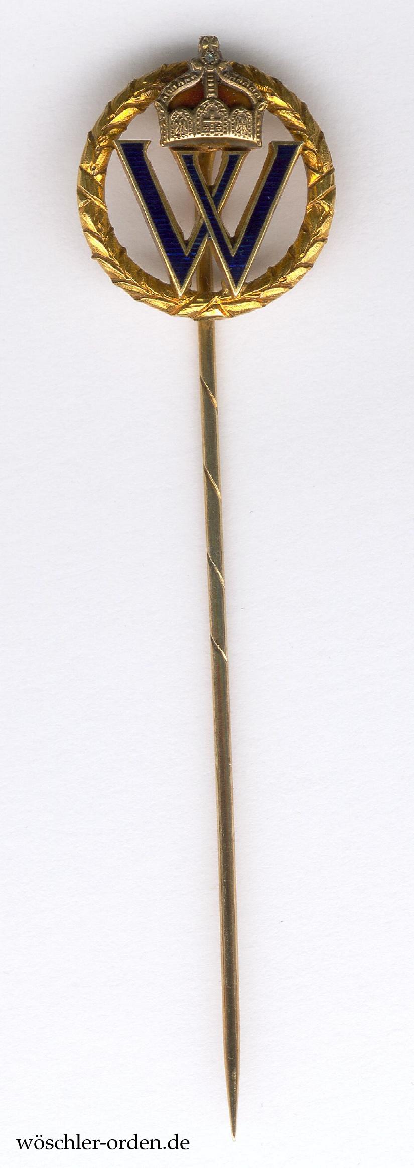Deutsches Reich, Goldene Geschenk-Krawattennadel Kaiser Wilhelm II. in Form eines goldenen, dunkelblau emaillierten Monogrammes „W“ unter der Deutschen Kaiserkrone, diese aus vergoldetem Silber gefertigt und teilweise emailliert. Anstelle des Reichsapfel ein kleiner Edelstein, wohl ein Diamant (ungeprüft). Das Monogramm umgeben von einem eng gebundenen Lorbeerkranz, dessen Durchmesser etwa 18 mm beträgt.
