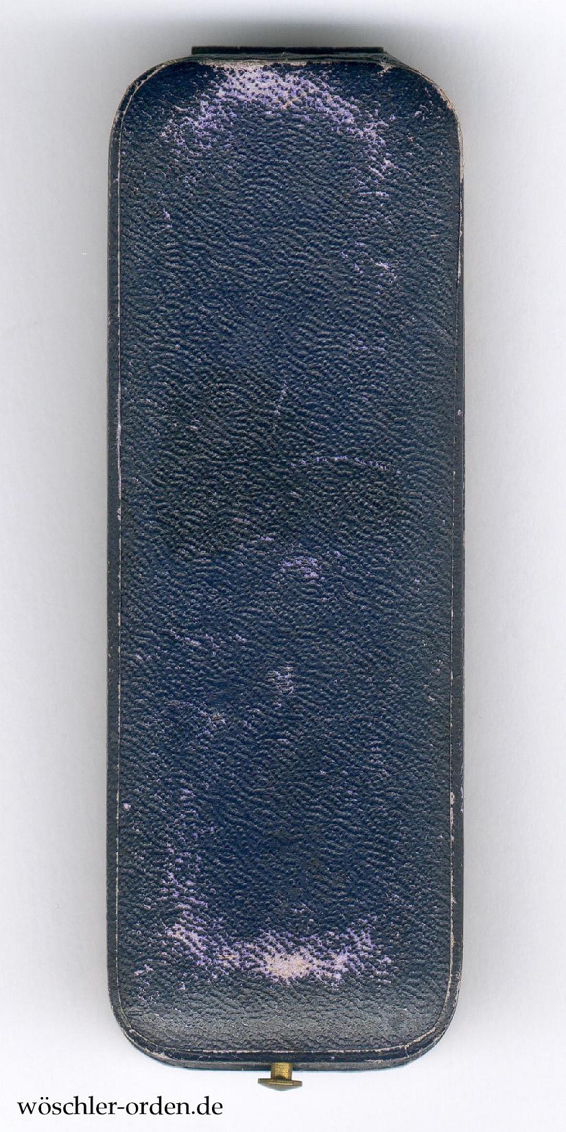 Dazu das von einer goldenen Dekorleiste abgesehen schmucklose, mit blauem Lederimitat bezogene Verleihungs- bzw. Vergabeetui, innen mit Einlage von cremefarbenem Samt mit Aussparung für die Tragenadel, der Himmel in ebenfalls cremefarbener Seide, mit schwarz eingedrucktem Signet von „Sy & Wagner / Königl. Hofgoldschmiede / – Berlin – / Unter den Linden 12/13.“