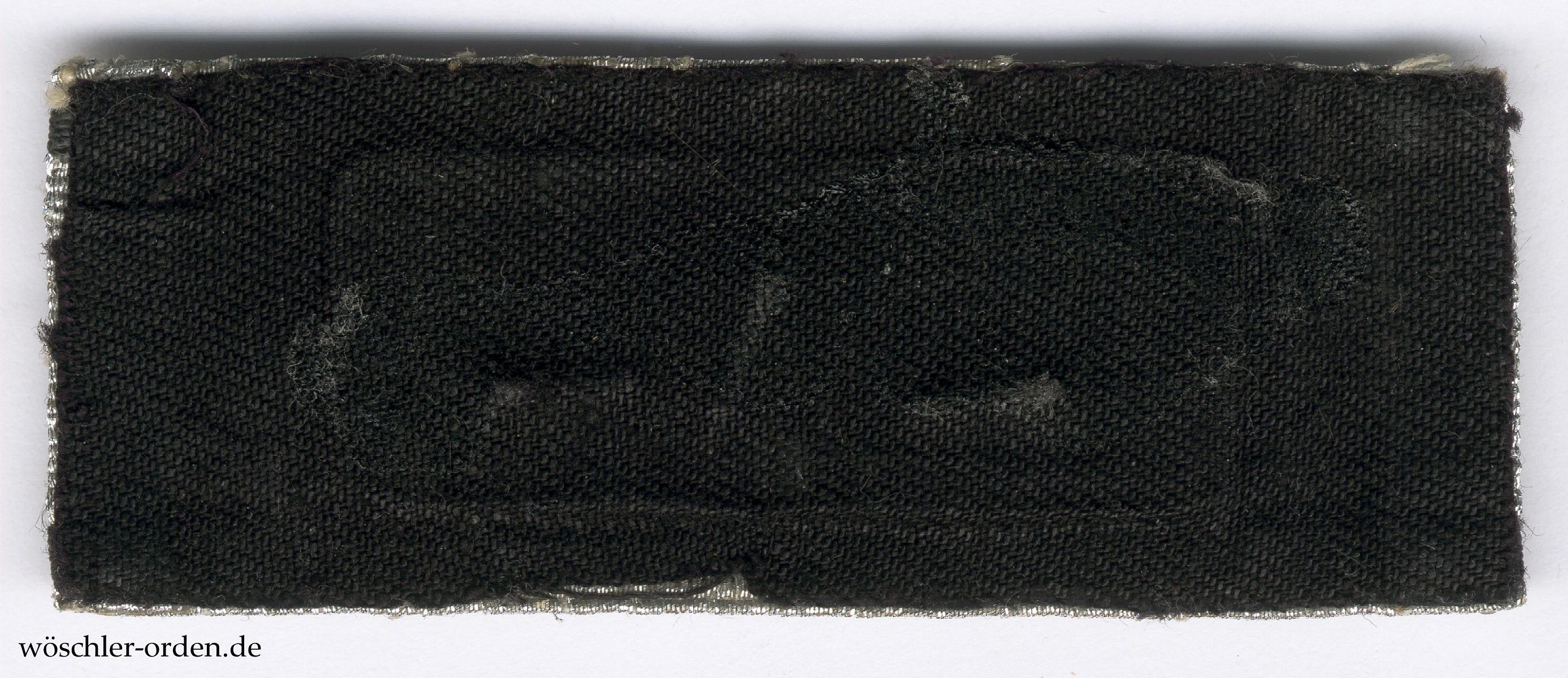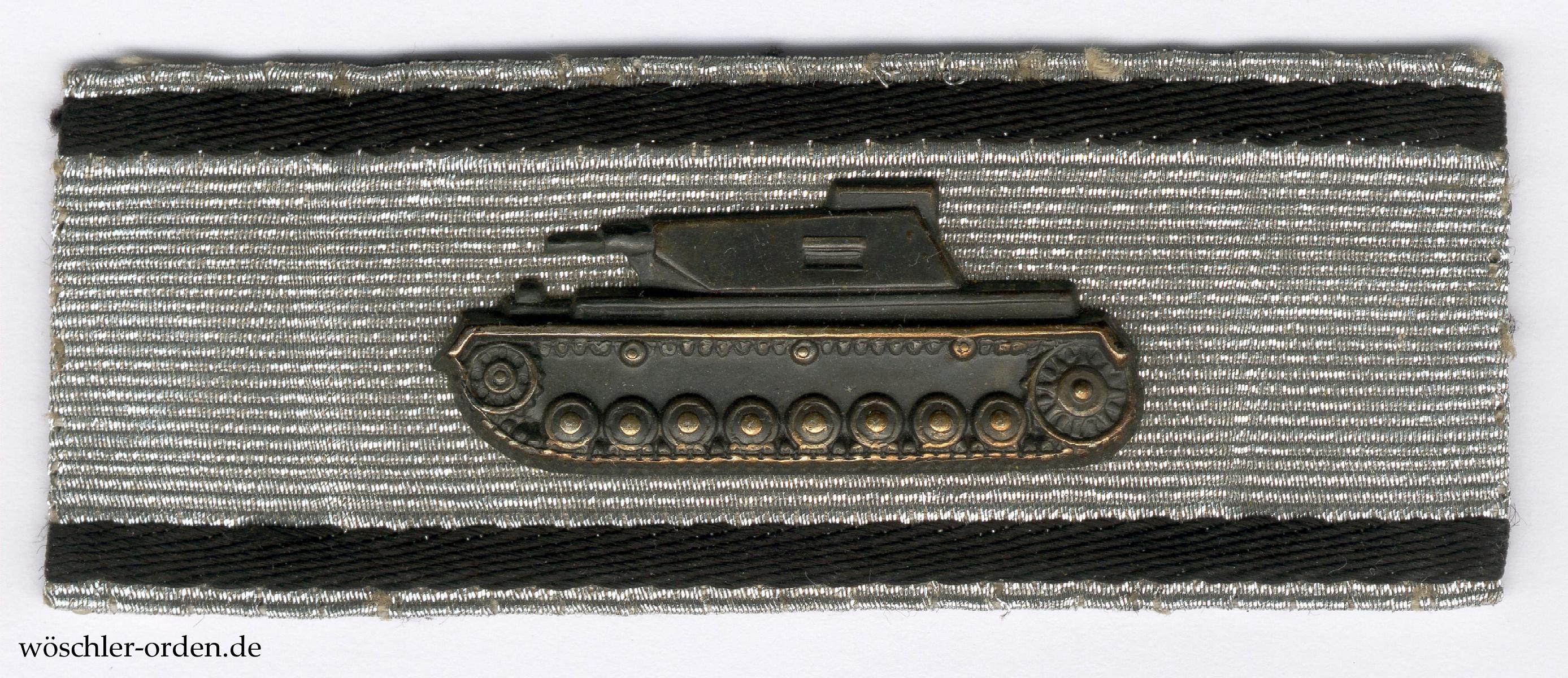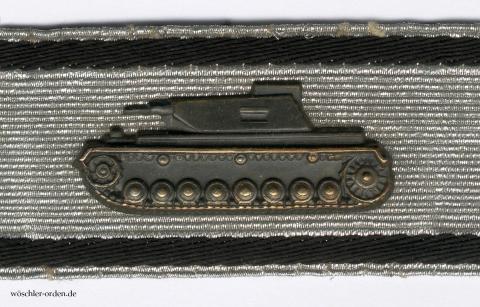 Der Panzerkampfwagen aus Eisenblech geprägt und bronziert, rückseitig mit drei angelöteten Splinten und über diese mit einer ebenfalls stählernen Rückplatte verbunden, auf einem Band aus Aluminiumgespinst mit eingewirkten schwarzen Streifen. Rückseitig ist eine Abdeckung aus schwarzem Leinenstoff aufgeklebt.