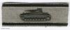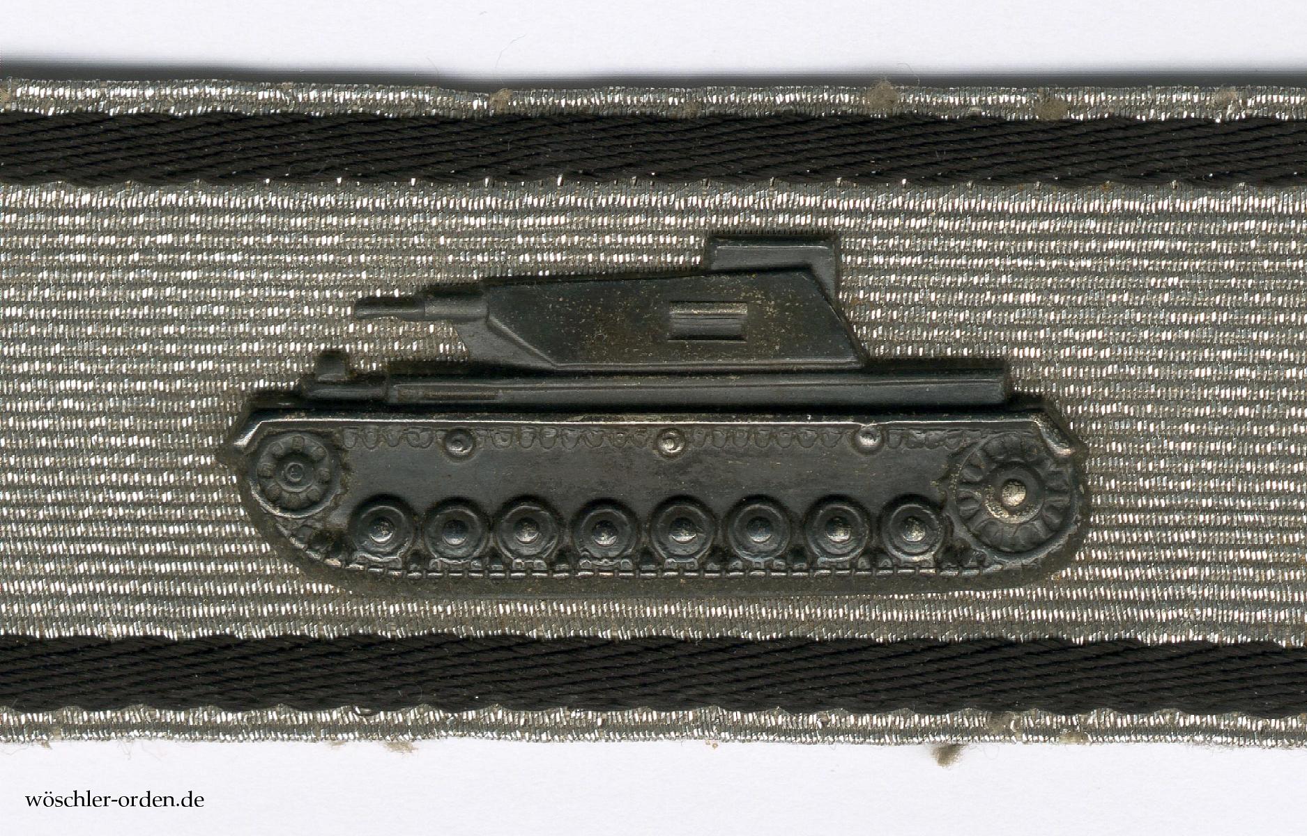 Sehr frühes, hochwertig verarbeitetes Exemplar aus Fertigung mutmaßlich der Moriz Hausch A.-G., Pforzheim, der aufgelegte Panzerkampfwagen aus Neusilber geprägt und geschwärzt, rückseitig mit drei angelöteten Splinten wohl aus Messing und über diese mit einer zinkenen Rückplatte verbunden, auf einem Band aus Aluminiumgespinst mit eingewirkten schwarzen Streifen. Rückseitig ist eine Abdeckung aus hellgrauem Filzdeckstoff aufgeklebt.