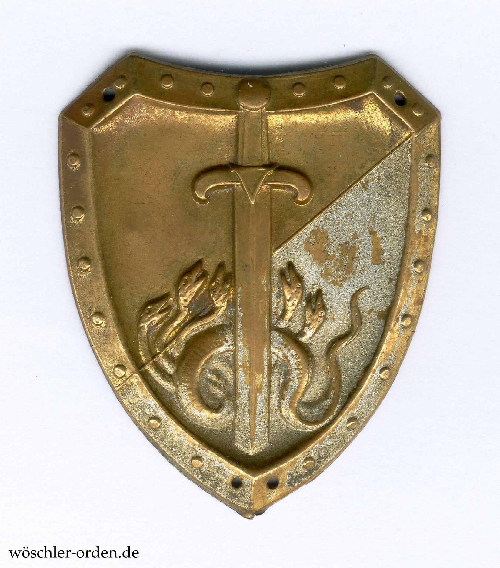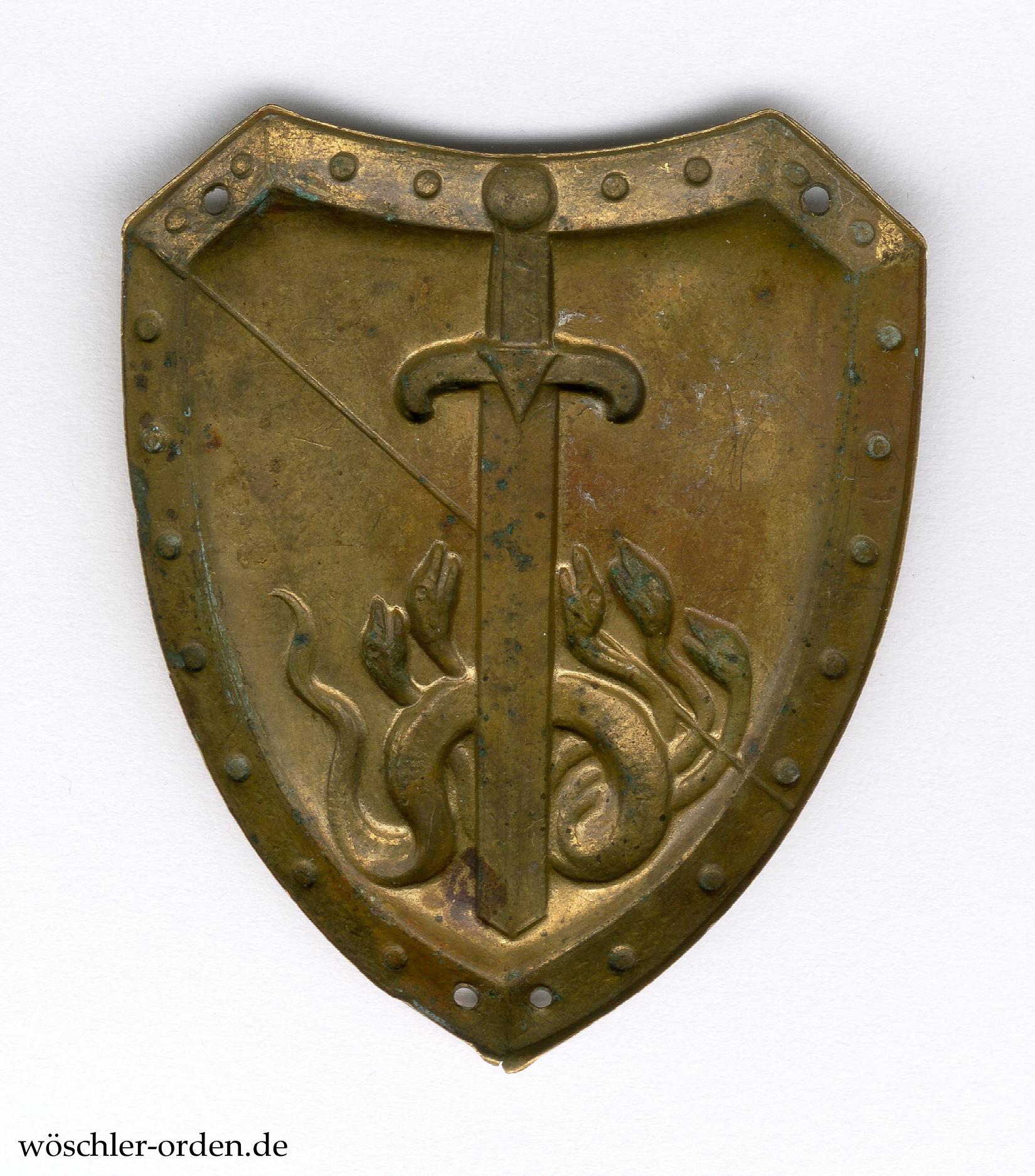 Wohl Messing hohlgeprägt, vorderseitig teils versilbert. Am Rand mit vier Löchern zum Aufnähen an der Uniform.