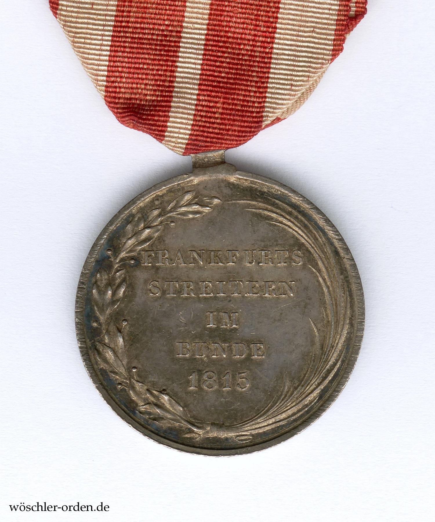 Die Kriegsdenkmünze für die Offiziere und Mannschaften aus dem Gebiete der Stadt wurde durch Senatsbeschluss vom 20. Januar 1816 für die Freiwilligen sowie für die Angehörigen des Frankfurter Linienmilitärs, welche den Feldzug 1815 – namentlich das Gefecht bei Selz am 26. Juni sowie die Einschließung von Straßburg vom 29. Juni bis 22. Juli 1815 – mitgemacht hatten, gestiftet. In Silber erfolgten insgesamt 340 Verleihungen, ein goldenes Exemplar war für die Fahne des Linienbataillons bestimmt.