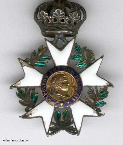 Exemplar der zweiten, etwa 1806 bis 1809 gefertigten Ausgabe des zweiten, bis 1814/15 verliehenen Modells des Kaiserreiches, mit einer fünfbügeligen, beweglich angebrachten Laubkrone, aber noch ohne Kügelchen an den Sternspitzen. Silber, mehrteilig gefertigt und emailliert, die Medaillons Gold und Emaille. Durch den Reichsapfel der Krone ein glatter Bandring, dieser mit dem zwischen 1809 und 1819 gebräuchlichen Liktorenbündel punziert.