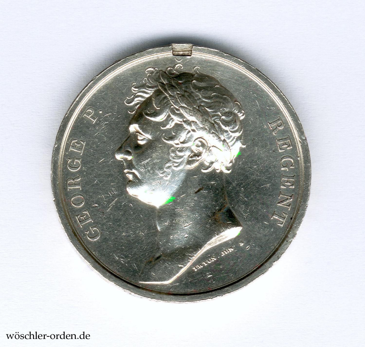 Silber, etwa 37 mm. Exemplar für einen Angehörigen der „King’s German Legion“, dementsprechend im Rand eingeschlagen „* * GEORGE LIEBERGELD, 8th LINE BATT. K. G. L. **“. Nach Angaben in der englischsprachigen Wikipedia wurden insgesamt etwa 39.000 Waterloomedaillen verliehen.