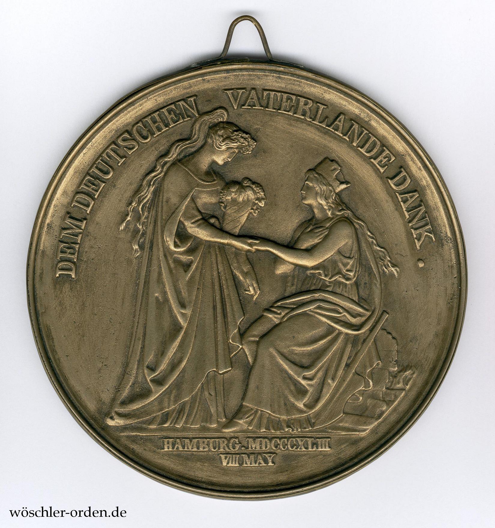 Bronzeguss, etwa 167 mm, wohl aus dem Glockenmetall der 1842 abgebrannten Hauptkirche. Vorderseitig sitzende Hammonia mit Mauerkrone, die Hand der vor ihr stehenden Germania haltend, die ein Füllhorn im linken Arm hält. Oben Inschrift „DEM DEUTSCHEN VATERLANDE DANK.“, unten das Stiftungsdatum „HAMBURG . MDCCCXLIII / VIII MAY“. Rückseitig in der Mitte das Hamburger Stadtwappen, oben „V. VIII. MAY.“ und „MDCCCXLII.“, also das Datum des „Großen Brandes“.