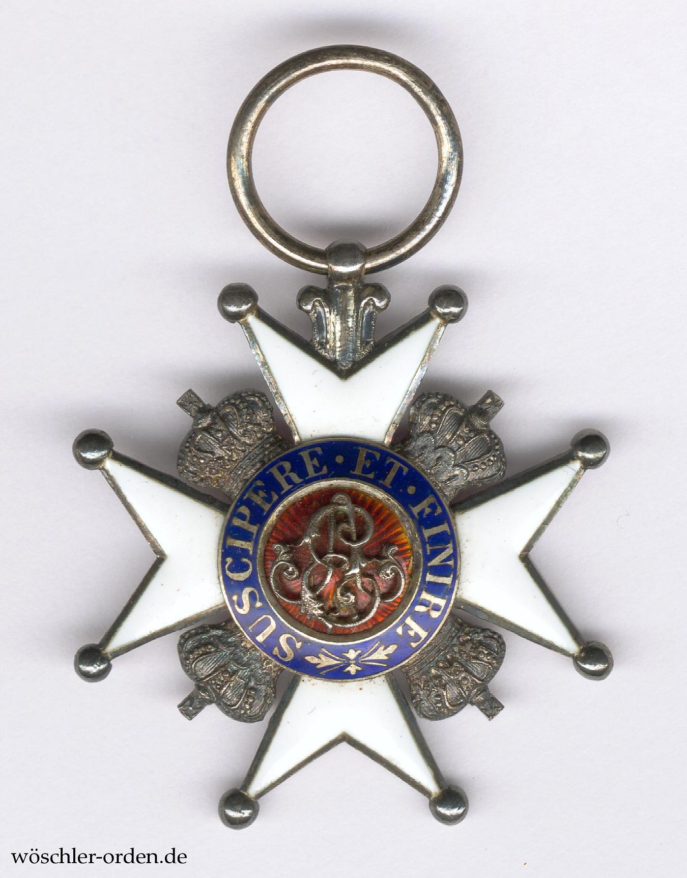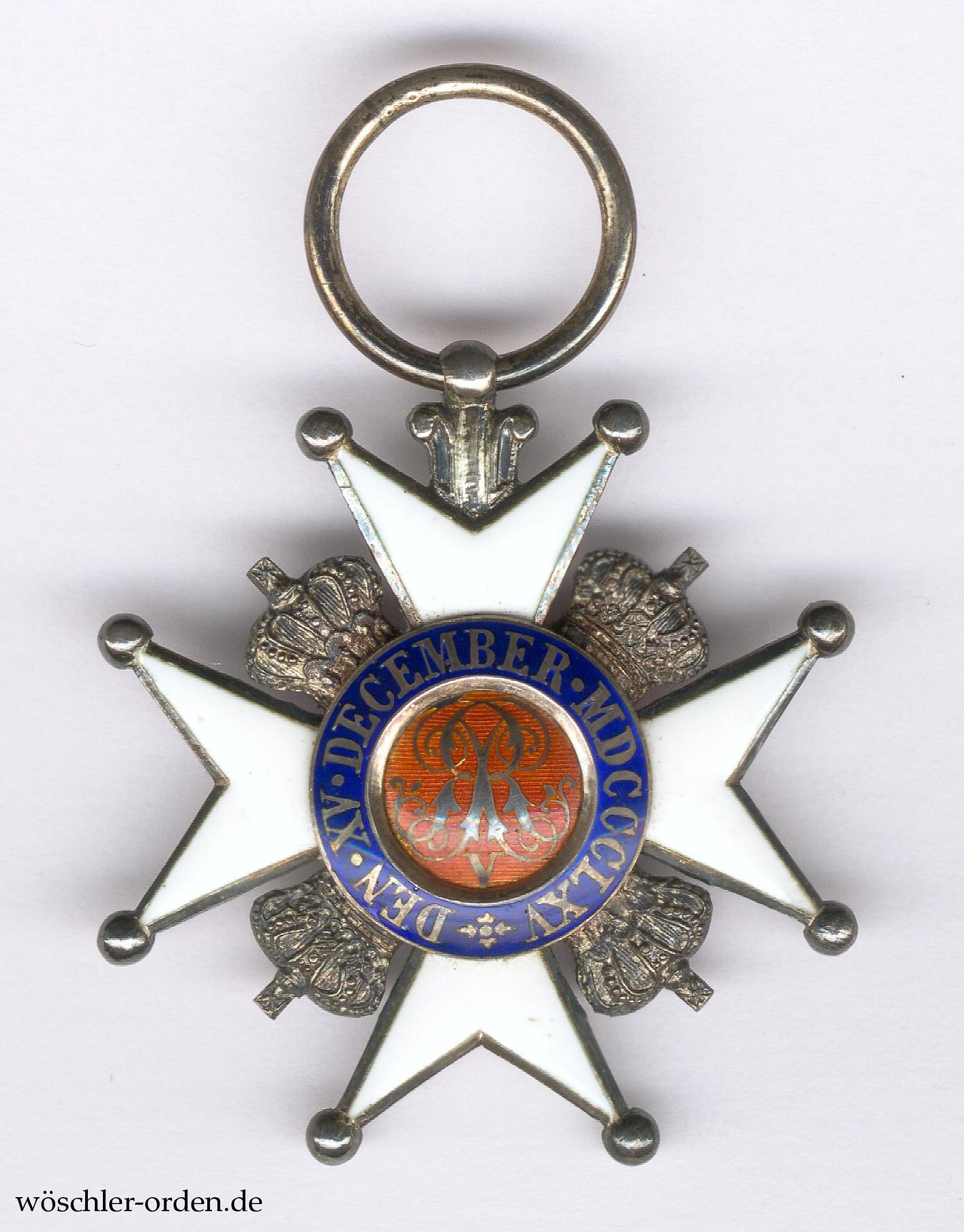 Exemplar aus Fertigung der Firma Carl Büsch, Hannover, deren Erstlieferung aus 96 Exemplaren dieser Klasse bestand. Silber, mehrteilig gefertigt und emailliert. Wohl erste Ausführung mit „geschlossenen“ Kronen zwischen den Kreuzarmen. Das Monogramm im Medaillon der Vorderseite separat gefertigt und aufgelegt, das in dem der Rückseite plan in der transluzid roten Emaille liegend. An länglicher Zieragraffe mit starrer Kugelöse, durch diese der geschlossene Bandring.
