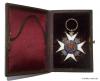 Dazu das mit braunem Leder mit eingeprägtem Dekor bezogene Verleihungsetui, gänzlich ohne ein Wappen oder eine Beschriftung. Innen mit einer Einlage aus weinrotem Samt mit Aussparung für das Ordenskreuz nebst Bandring, der Himmel in ebenfalls weinroter Seide sowie einem Bändchen zur Halterung des Ordensbandes.