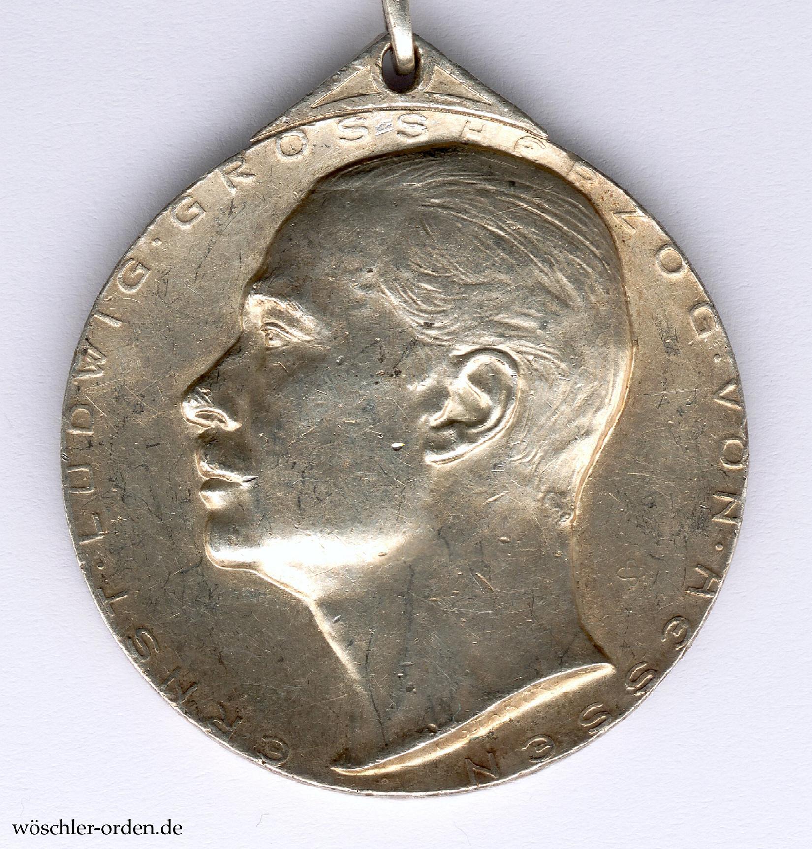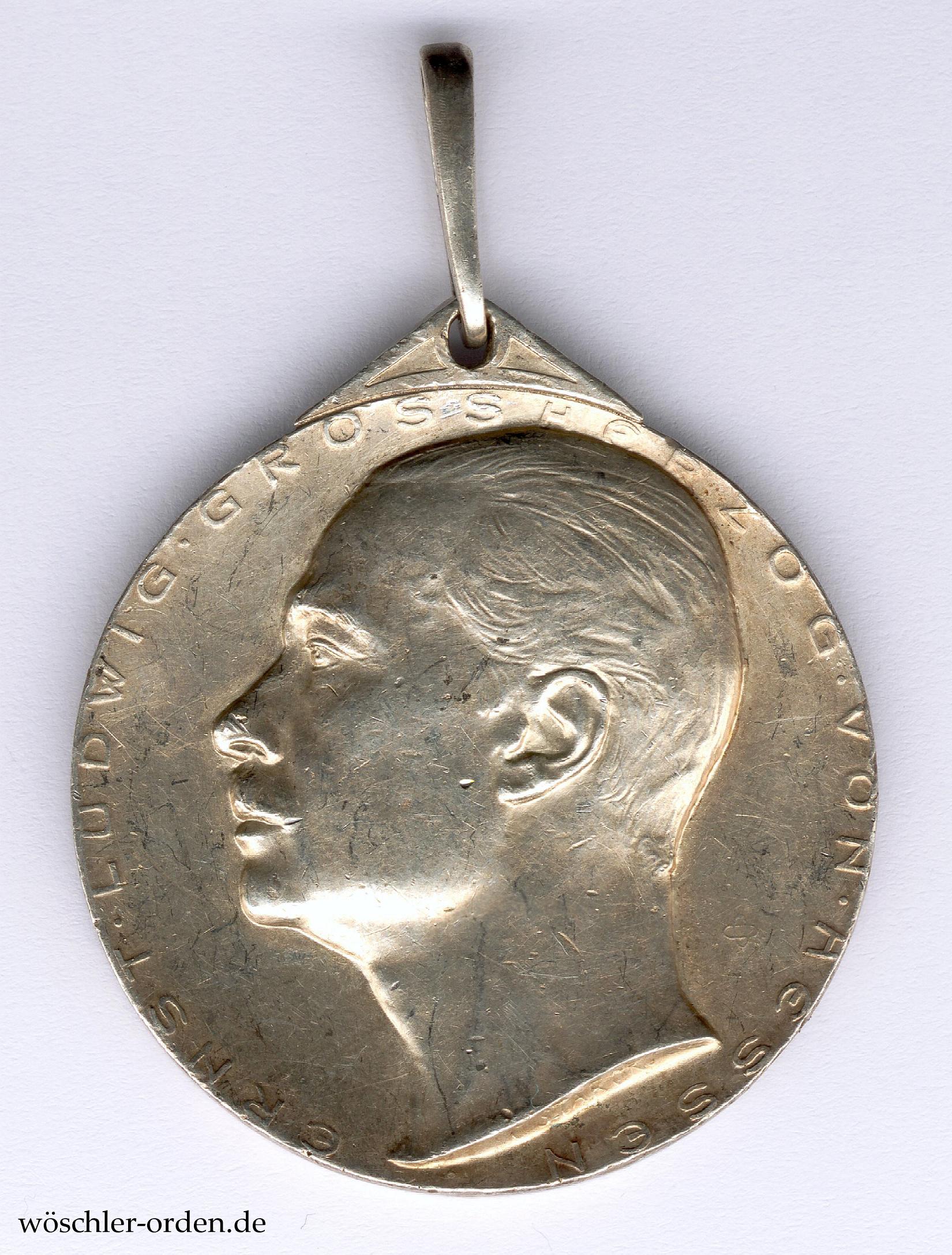 Exemplar des zweiten, 1906 eingeführten Modells mit dem Portrait des Großherzogs Ernst Ludwig, für die Gemeinde BÜTTELBORN, mit entsprechender Gravur auf der Rückseite. Silber geprägt, an gelochtem Ösensegment, dadurch ein länglicher, geschlossener Bandring. Am Rand, auf etwa elf Uhr, die Feingehaltspunzierung „990“. Gefertigt wurde das zweite Modell durch die Berliner Medaillen-Münze Otto Oertel.