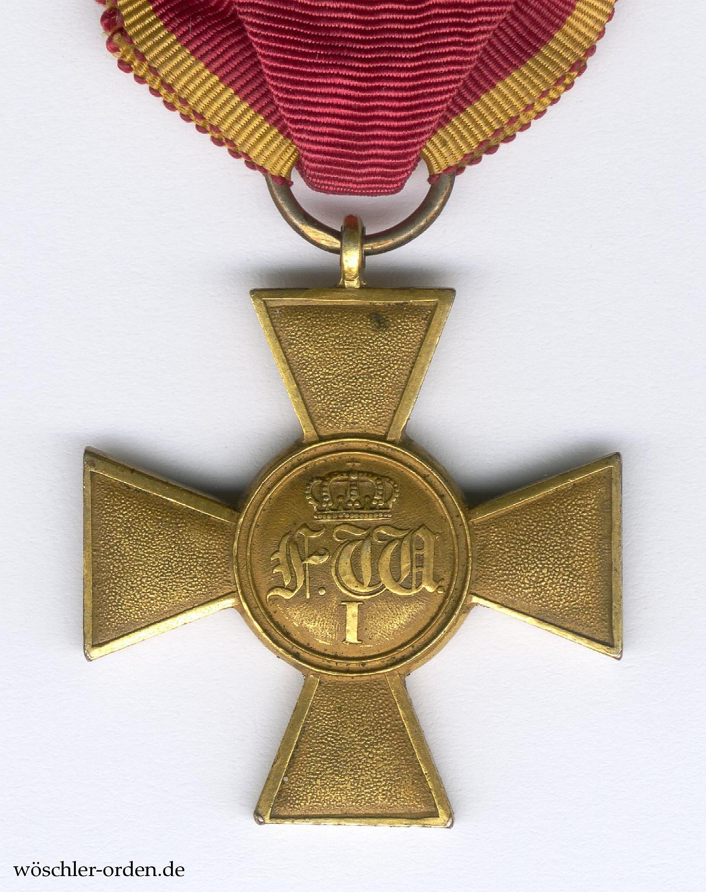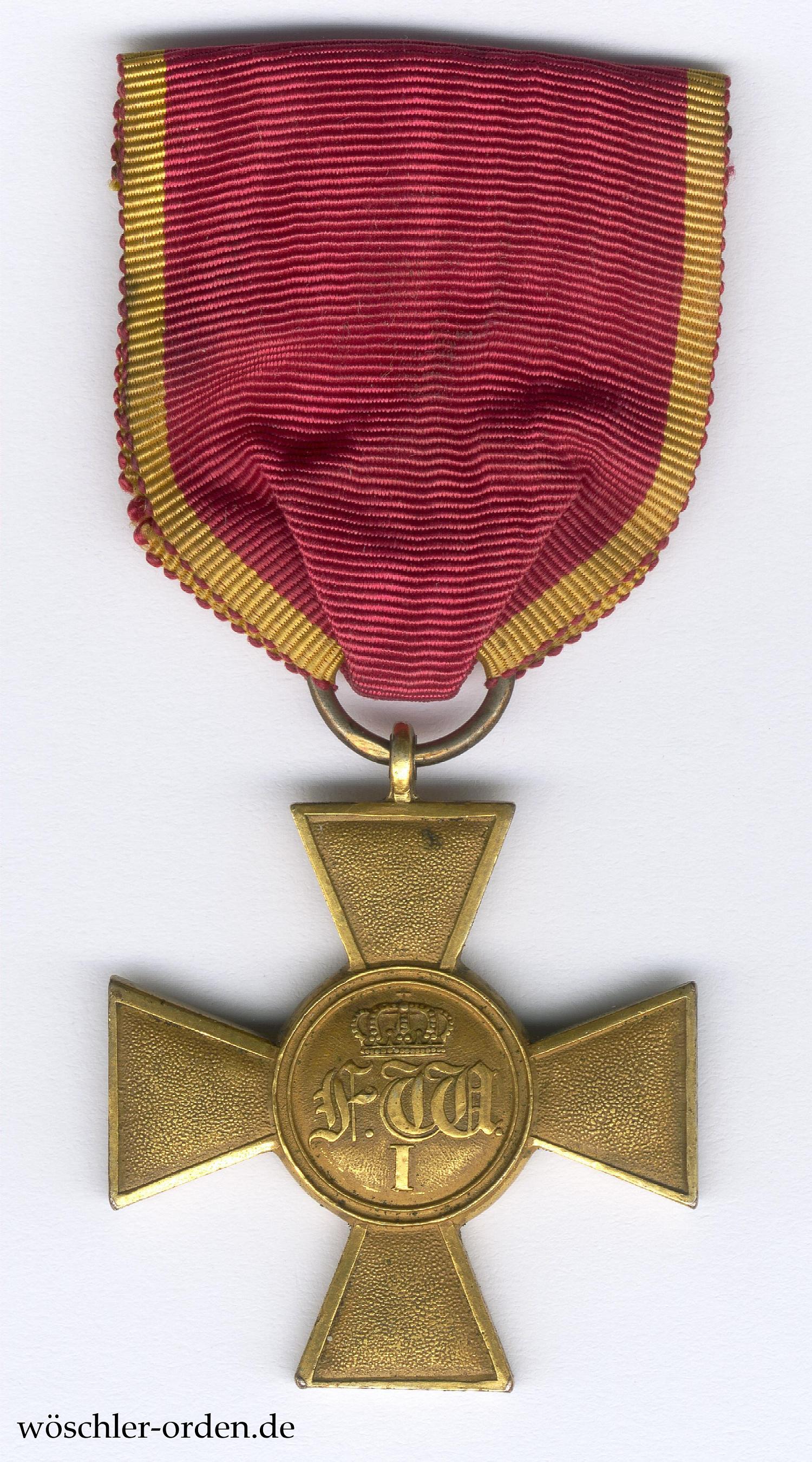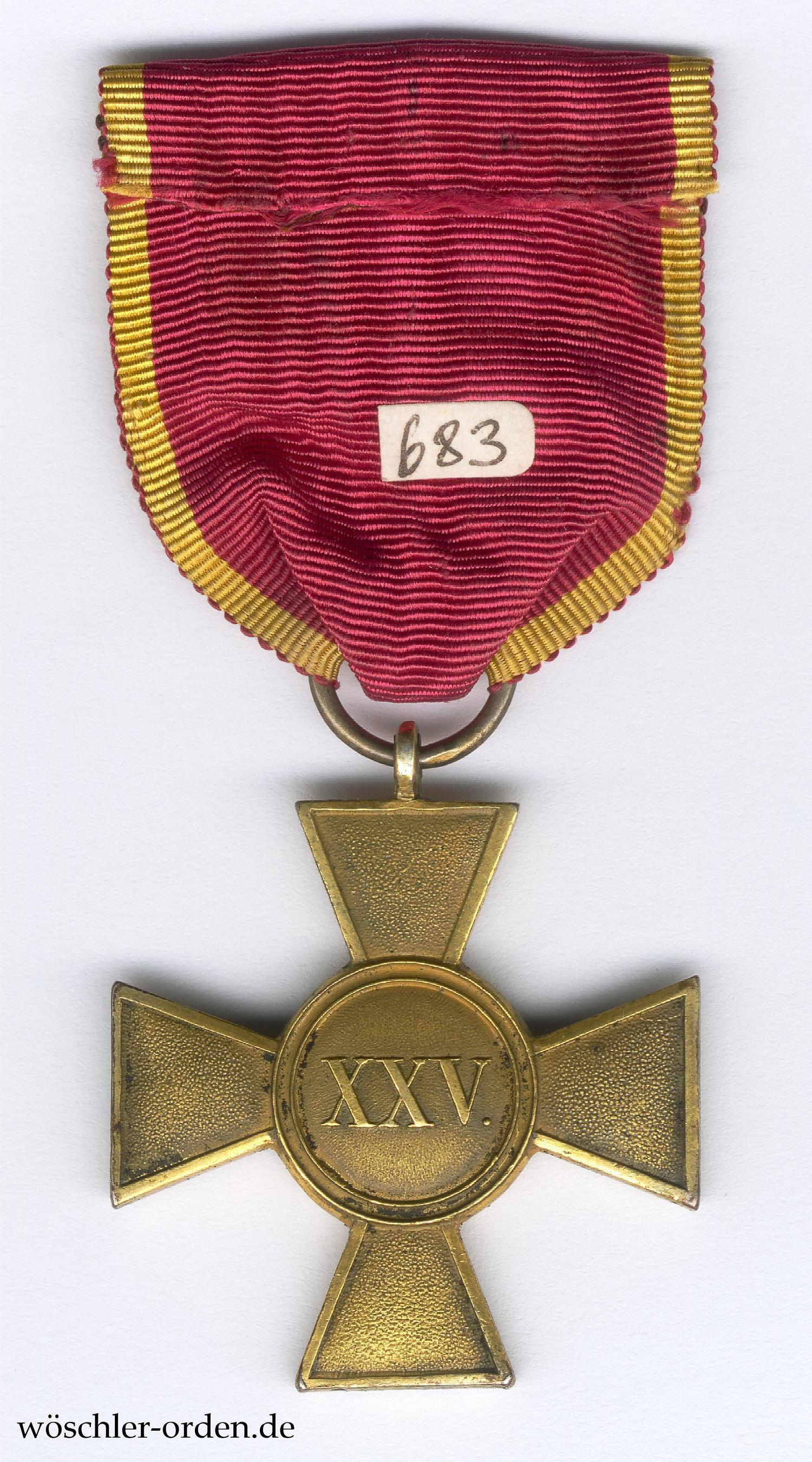 Nachdem ein Dienstauszeichnungskreuz für Unteroffiziere usw. bereits seit 1835 in drei Klassen bestand, stiftete Kurfürst Friedrich Wilhelm schließlich durch Befehl vom 16. März 1849 eine Dienstauszeichnung für Offiziere, die in einer Klasse als vergoldetes Kreuz für 25 Dienstjahre bestand. Gestaltet war sie ganz nach preußischem Vorbild, abgesehen von der „I“ statt der „III“ im Monogramm der Vorderseite, und natürlich dem Band, das in Kurhessen karmesinrot mit schmalen gelben Rändern statt wie in Preußen einfarbig dunkelblau war.