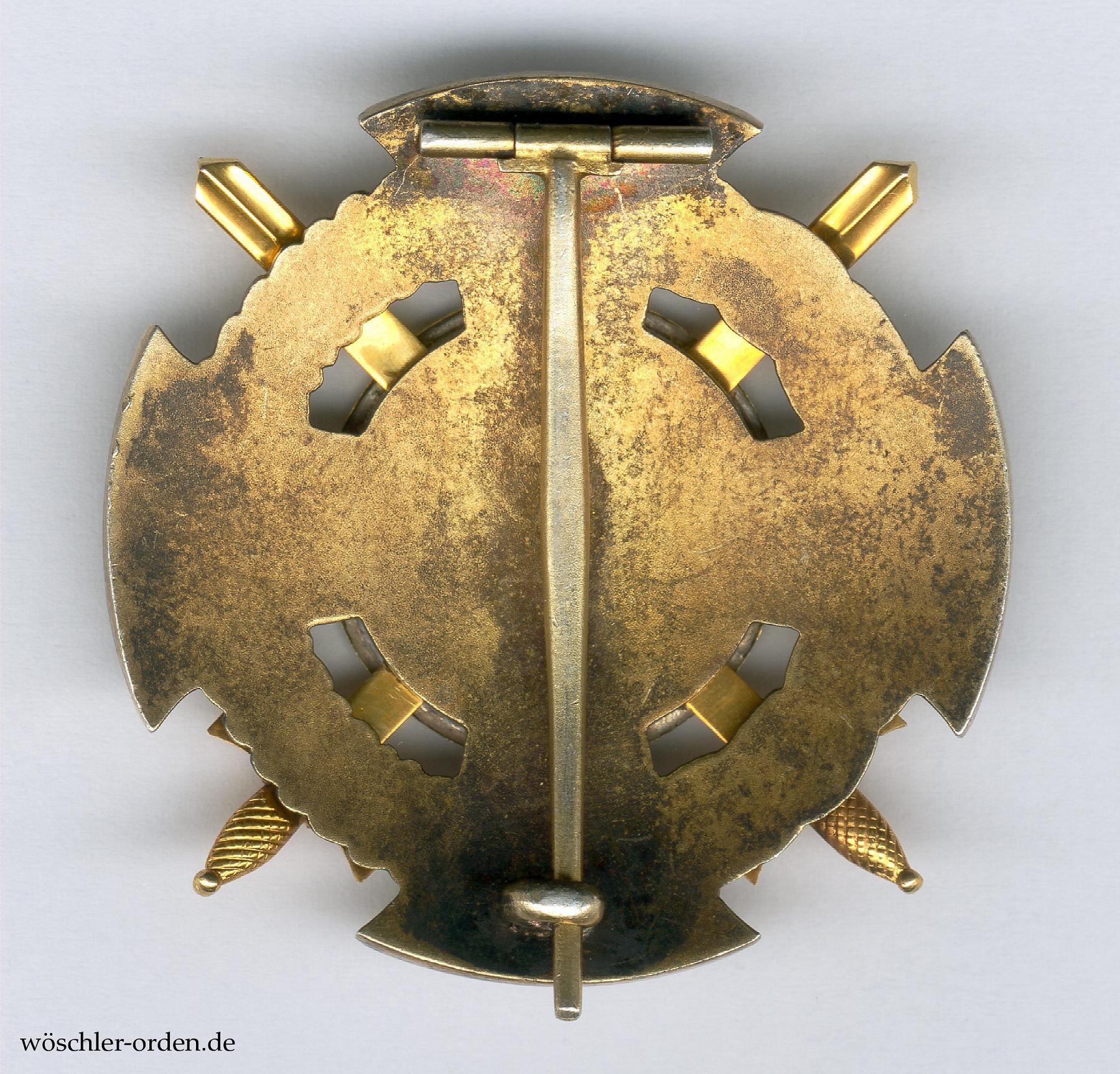 Typisches Verleihungsstück aus der Zeit des Weltkriegs. Der Korpus in vergoldetem Silber, emailliert, die Schwerter und das Medaillon in Gold und Emaille. An ebenfalls vergoldetem Nadelsystem. Ohne eine Hersteller- oder Feingehaltspunze, jedoch sicherlich aus der Lieferung des Hofjuweliers Johann Georg Zimmerer, Sigmaringen, der möglicherweise bei der Firma C. F. Zimmermann in Pforzheim fertigen ließ.