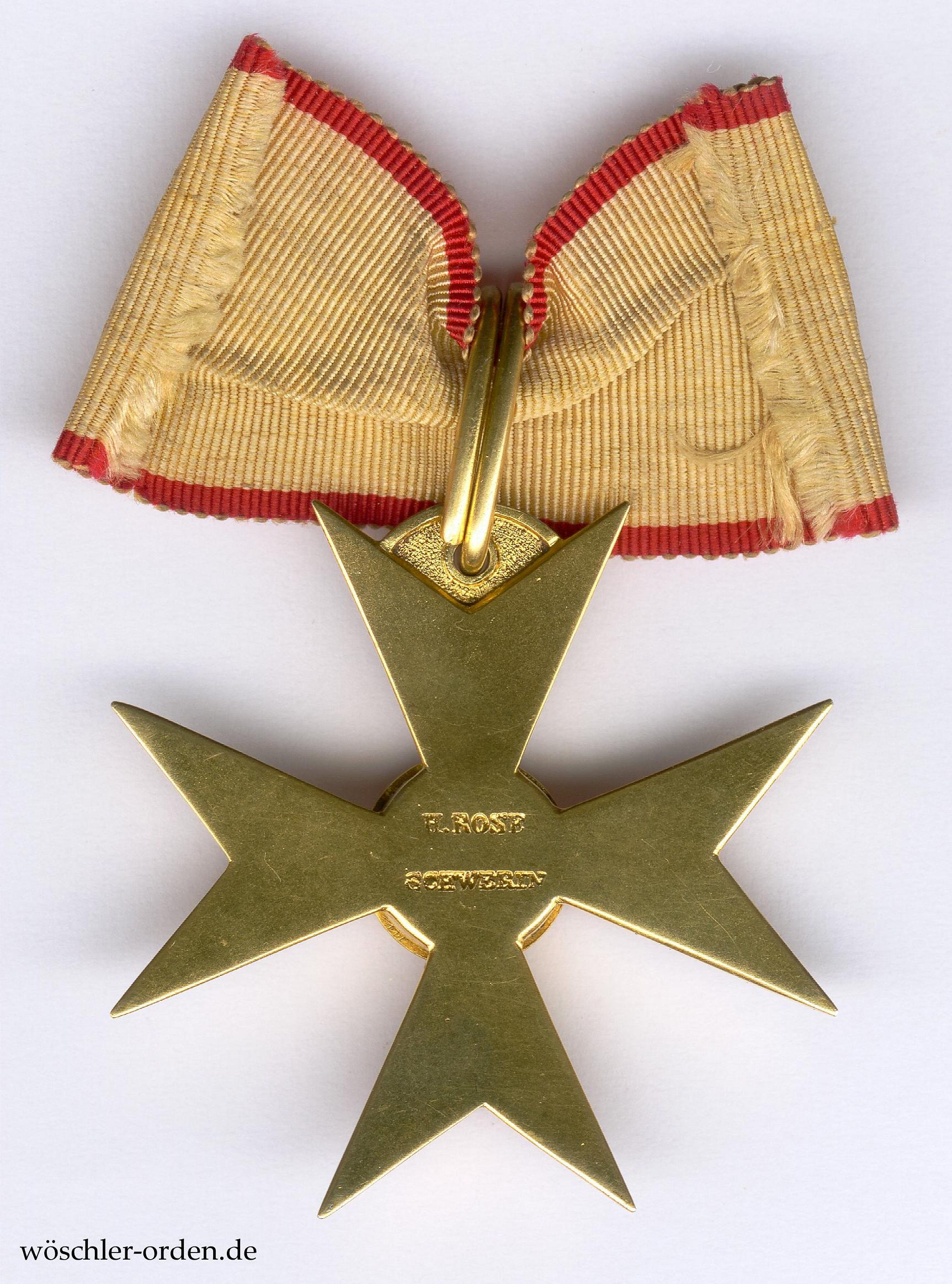 Ungewöhnliche, variante Fertigung des Großherzoglichen Hofjuweliers Heinrich Rose, Schwerin. Wohl Bronze vergoldet, das Vorderseitenmedaillon mit separat gefertigtem, aufgelegtem Greifen, die vorderseitigen Kreuzarmflächen flinkiert und feinst emailliert. Die Rückseite plan gefertigt, mit zweizeiliger Herstellerpunzierung „H. ROSE / SCHWERIN“. An Sprungring aus ungewöhnlich dickem Draht.