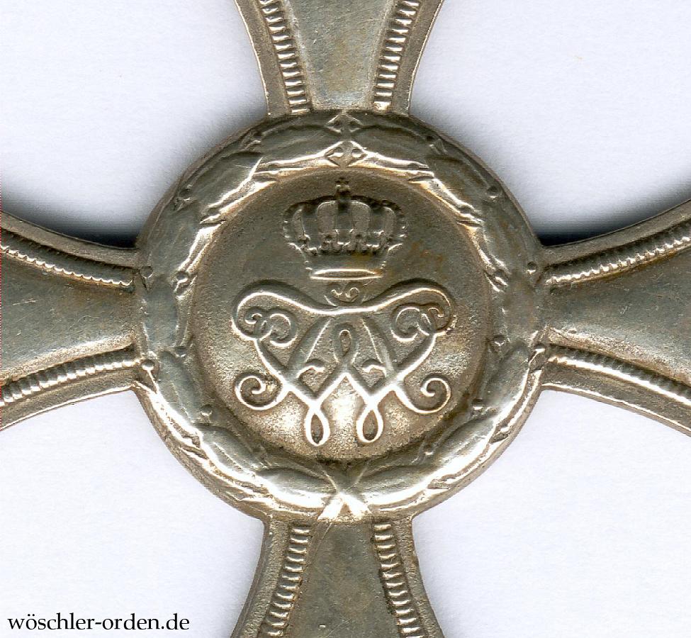 Ausgabe mit Inschrift „TAPFER / UND / TREU“ im Medaillon der Vorderseite. Silberguss, an angelöteter, stabiler Ringöse mit geschlossenem Bandring. Ohne Herstellermarkierung. Bei den gegossenen Exemplaren handelt es sich um die früheren, wie sie hauptsächlich für den Krieg von 1870/71 verliehen wurden.