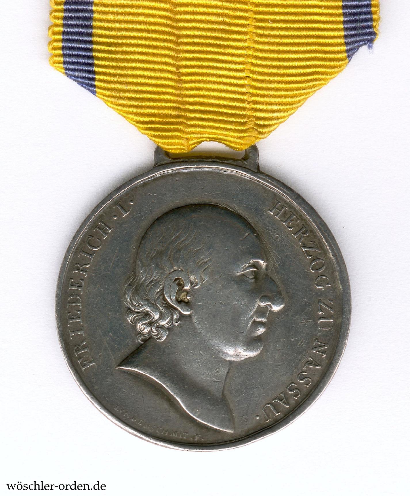 Die Tapferkeitsmedaille wurde mit Edikt vom 9. August 1807 von Herzog Friedrich I. August von Nassau-Usingen, zugleich im Namen des Fürsten Friedrich Wilhelm von Nassau-Weilburg, für die seit dem Staatsvertrag vom 30. August 1806 zu einer Brigade vereinigten nassauischen Truppen in zwei Klassen – Gold und Silber – gestiftet, damit „in Zukunft einzelne tapfere Handlungen bei dem Militär durch ein öffentlich fortdauerndes Ehrenzeichen der Vergessenheit entrissen“ werden. Von diesem Modell kamen in Silber insgesamt 290 Medaillen zur Ausgabe.