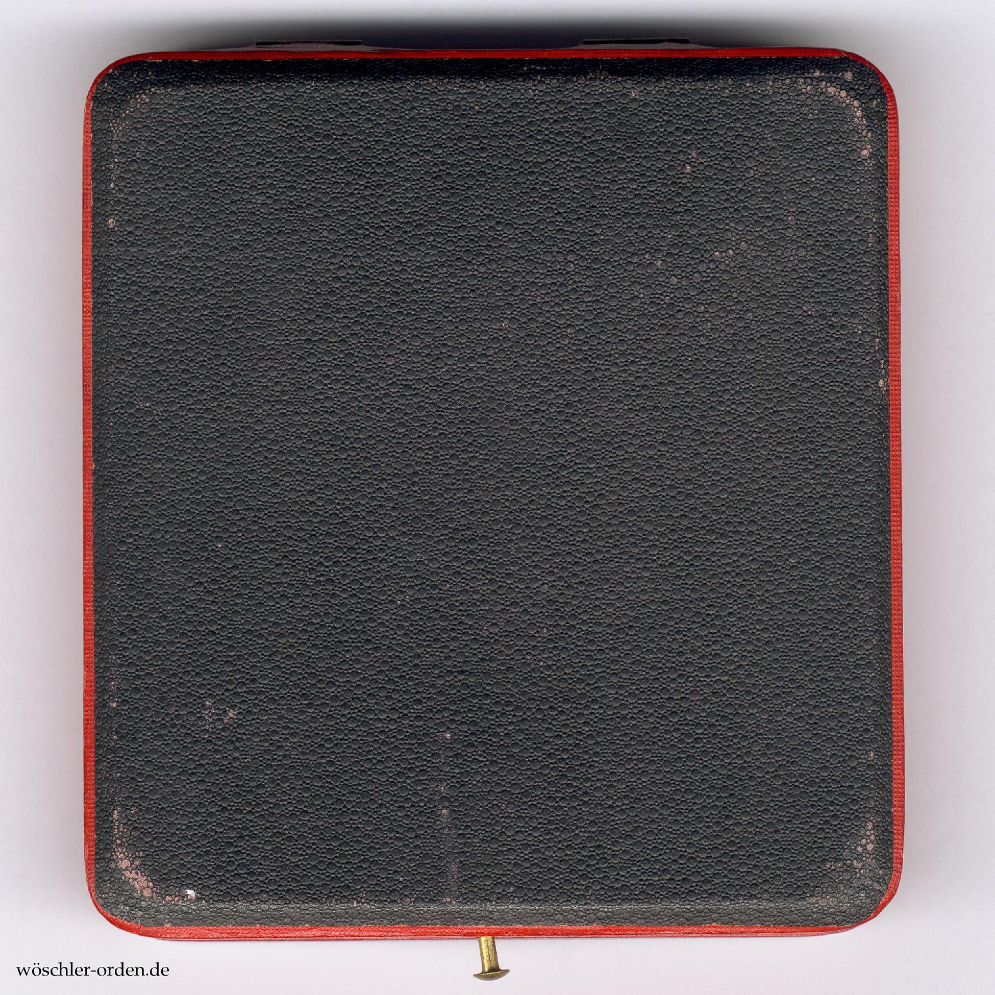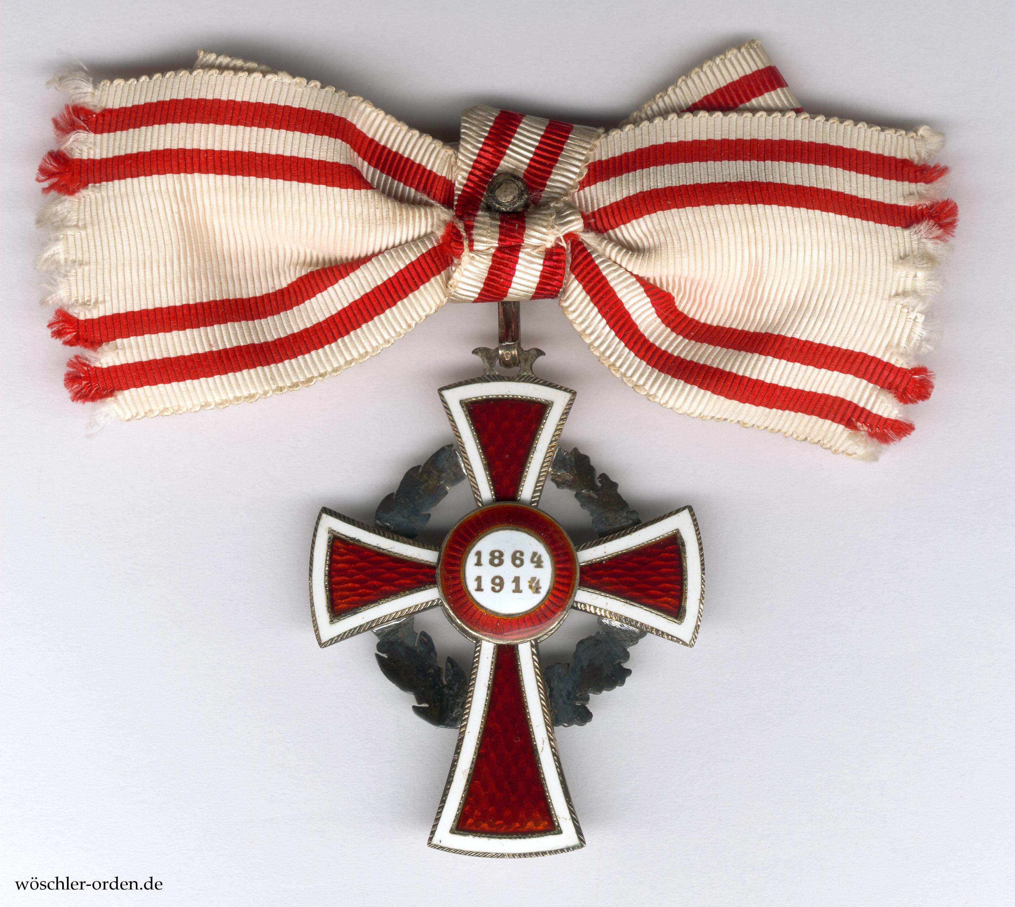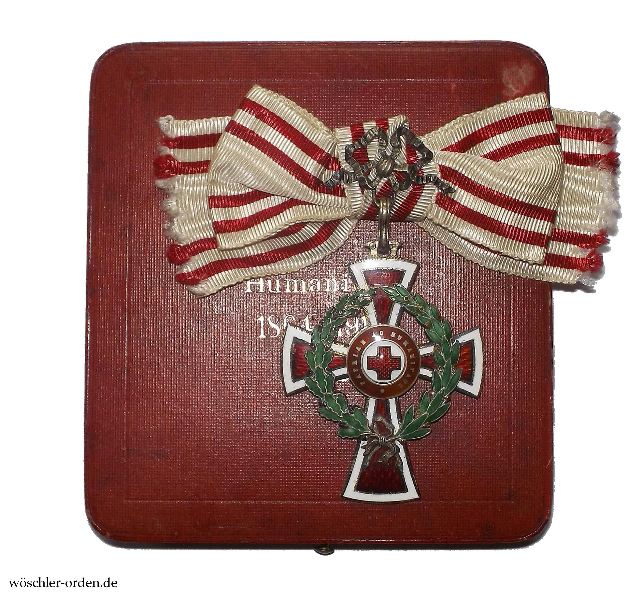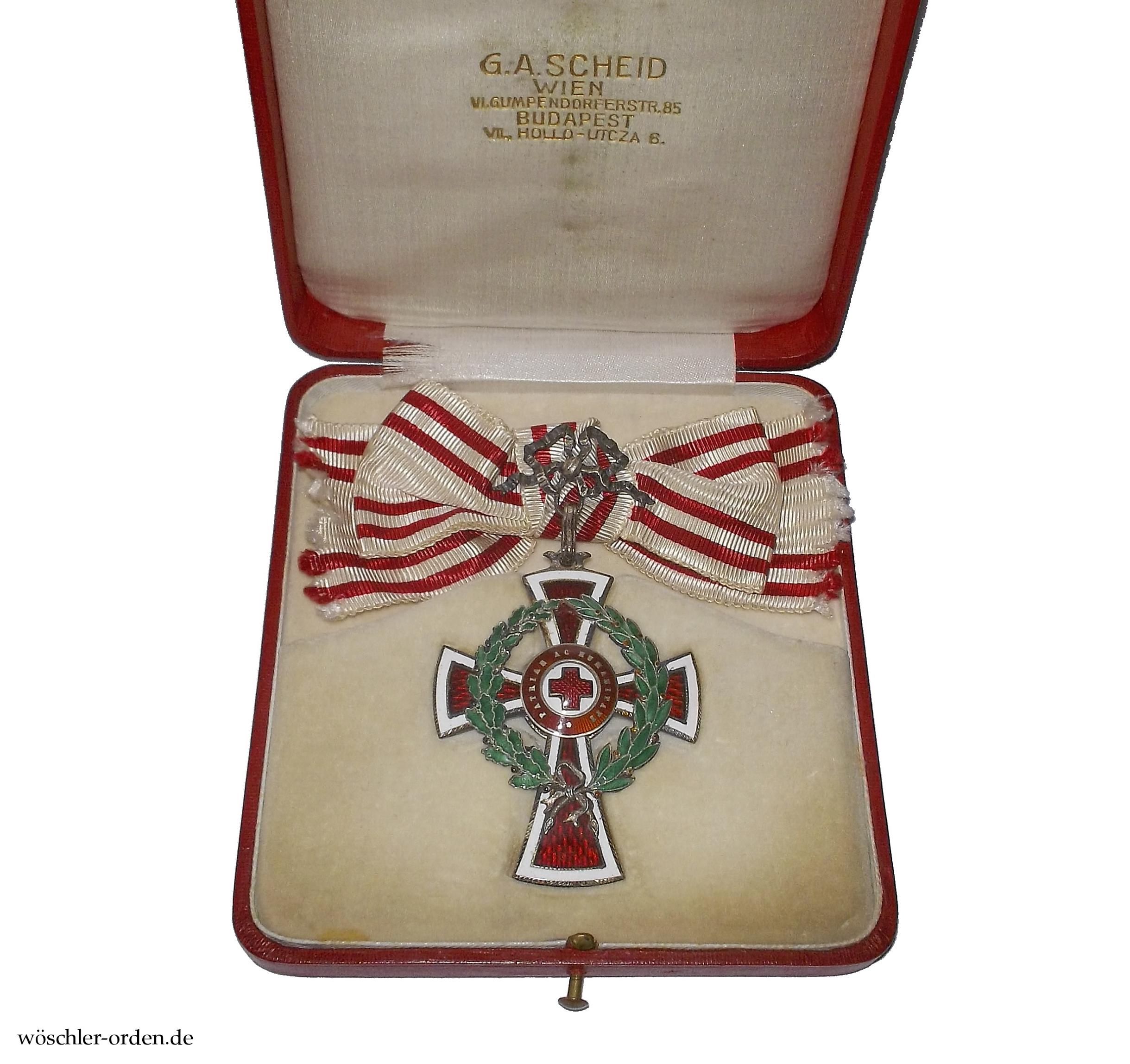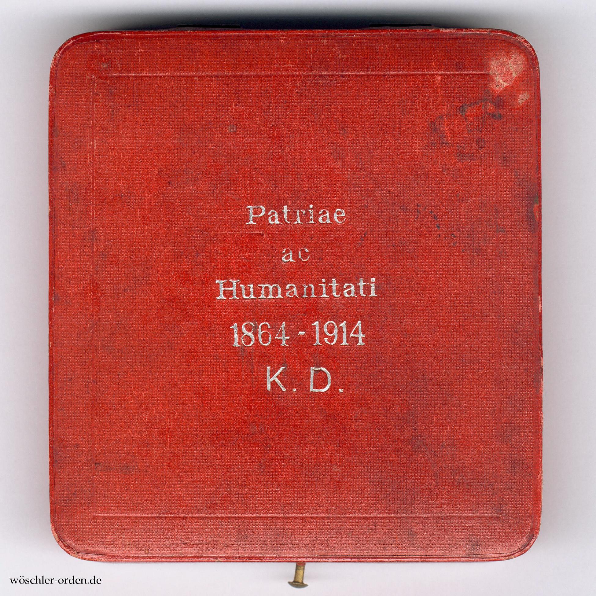 Dazu das rechteckige, wohl mit rotem Kaliko bezogene Verleihungsetui mit dem silbernen, fünfzeiligen Aufdruck „Patriae / ac / Humanitati / 1864 - 1914 / K. D.“, der Himmel in weißer Seide verkleidet, diese mit golden geprägter, wiederum fünfzeiliger Herstellerangabe von G. A. Scheid, Wien und Budapest; die Samteinlage mit Aussparung für Kreuz und Schleife.