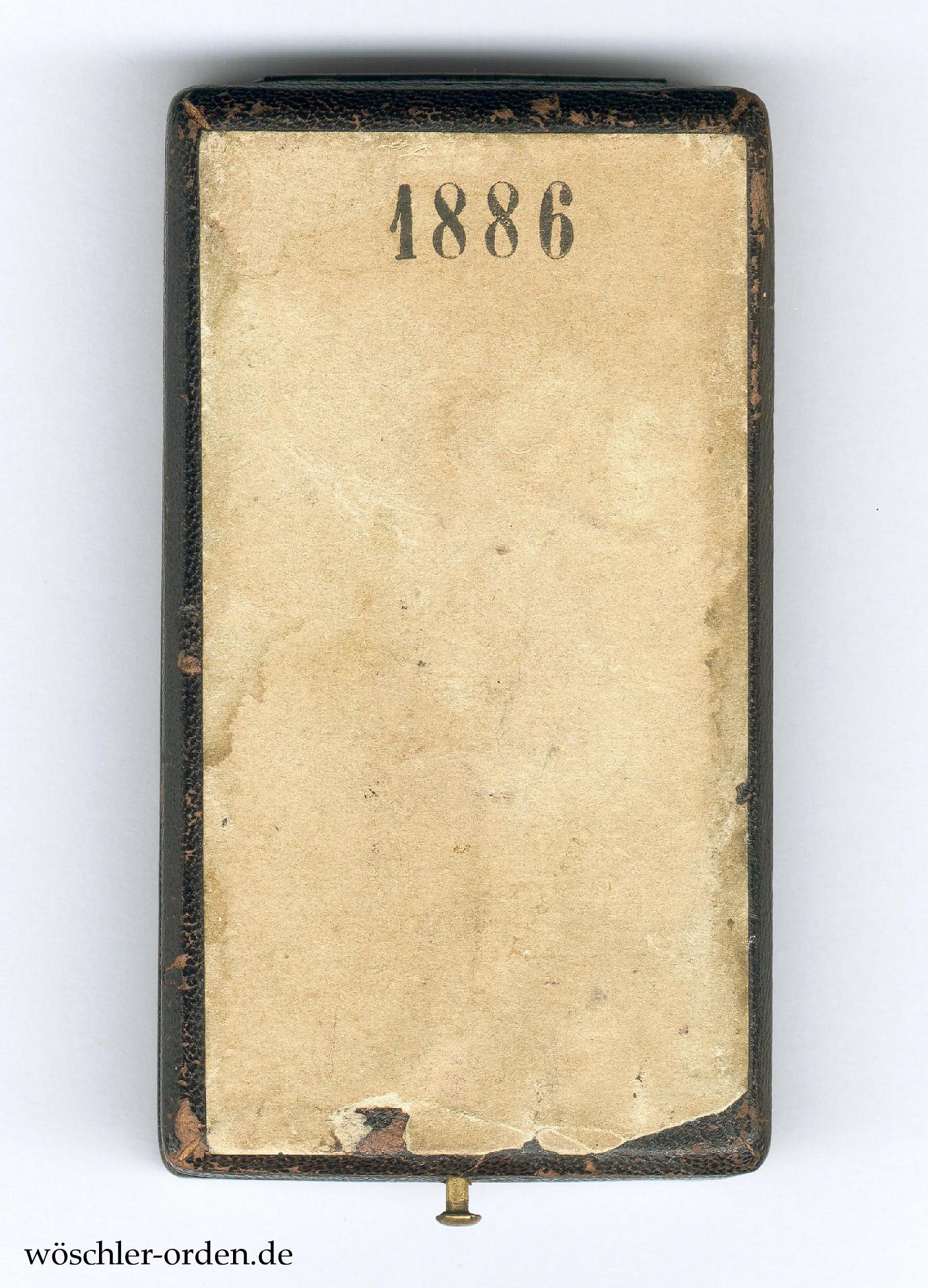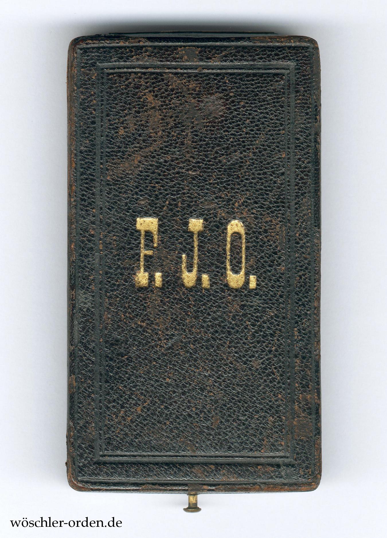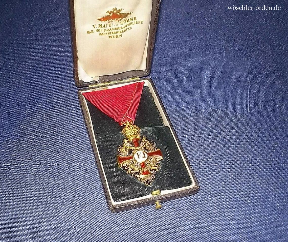 Dazu das Verleihungsetui in dunkelbraunem Leder, mit goldgeprägter Angabe „F. J. O.“ auf dem Deckel und Stempel „1886“ am Boden. Innen dunkelgrüner Samt und im Deckel, auf weißer Seide, das goldgeprägte Herstellerlogo der K.K. Hof- und Kammerjuweliere und Ordenfabrikanten V. Mayers Söhne, Wien.
