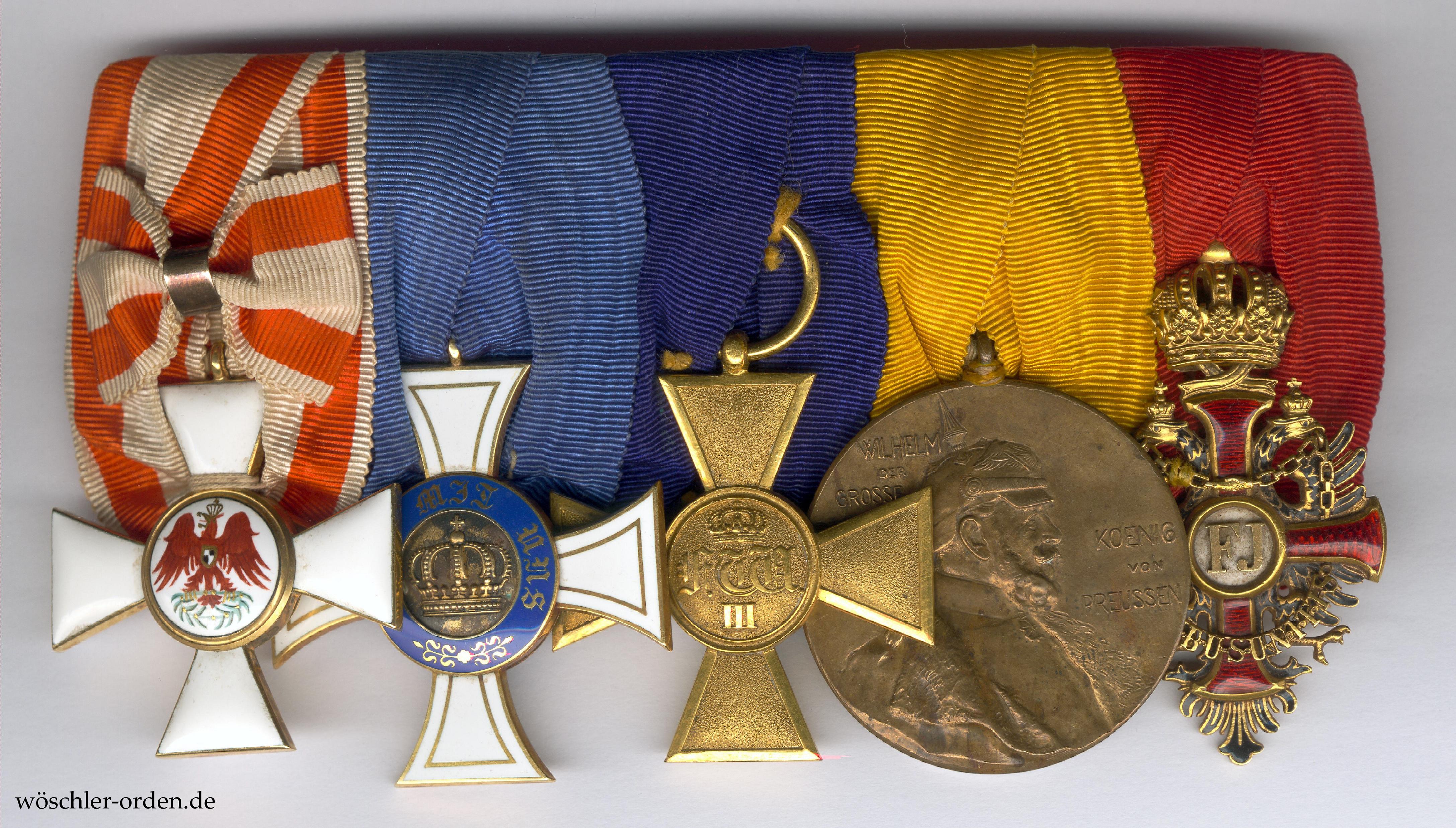 Königreich Preußen, 5er Ordensschnalle des Generalmajors Otto Sommerfeld (1856–1920), wohl aus der Zeit kurz vor Beginn des Ersten Weltkrieges, mit folgenden Auszeichnungen: