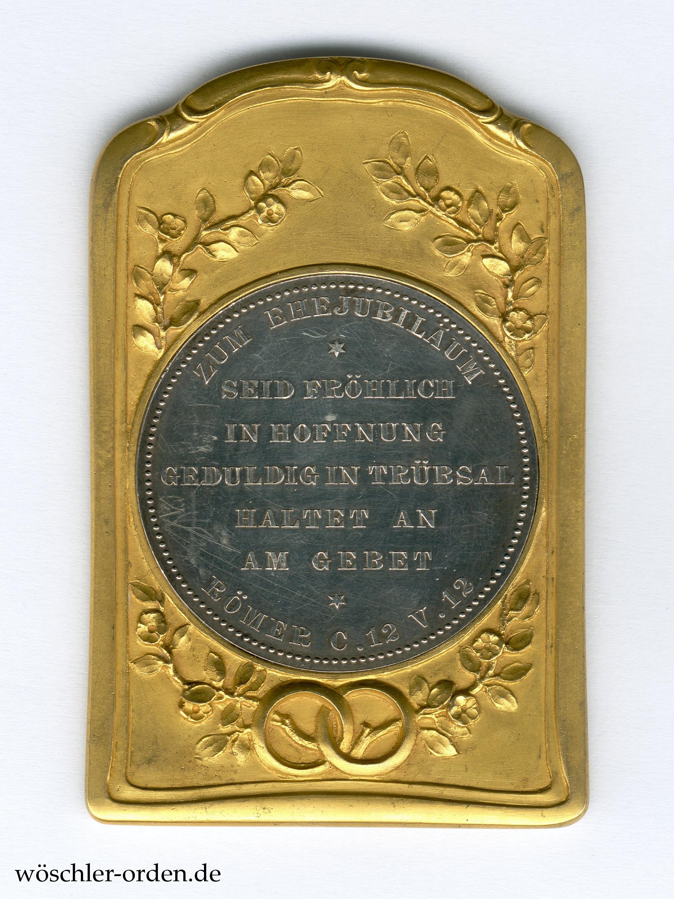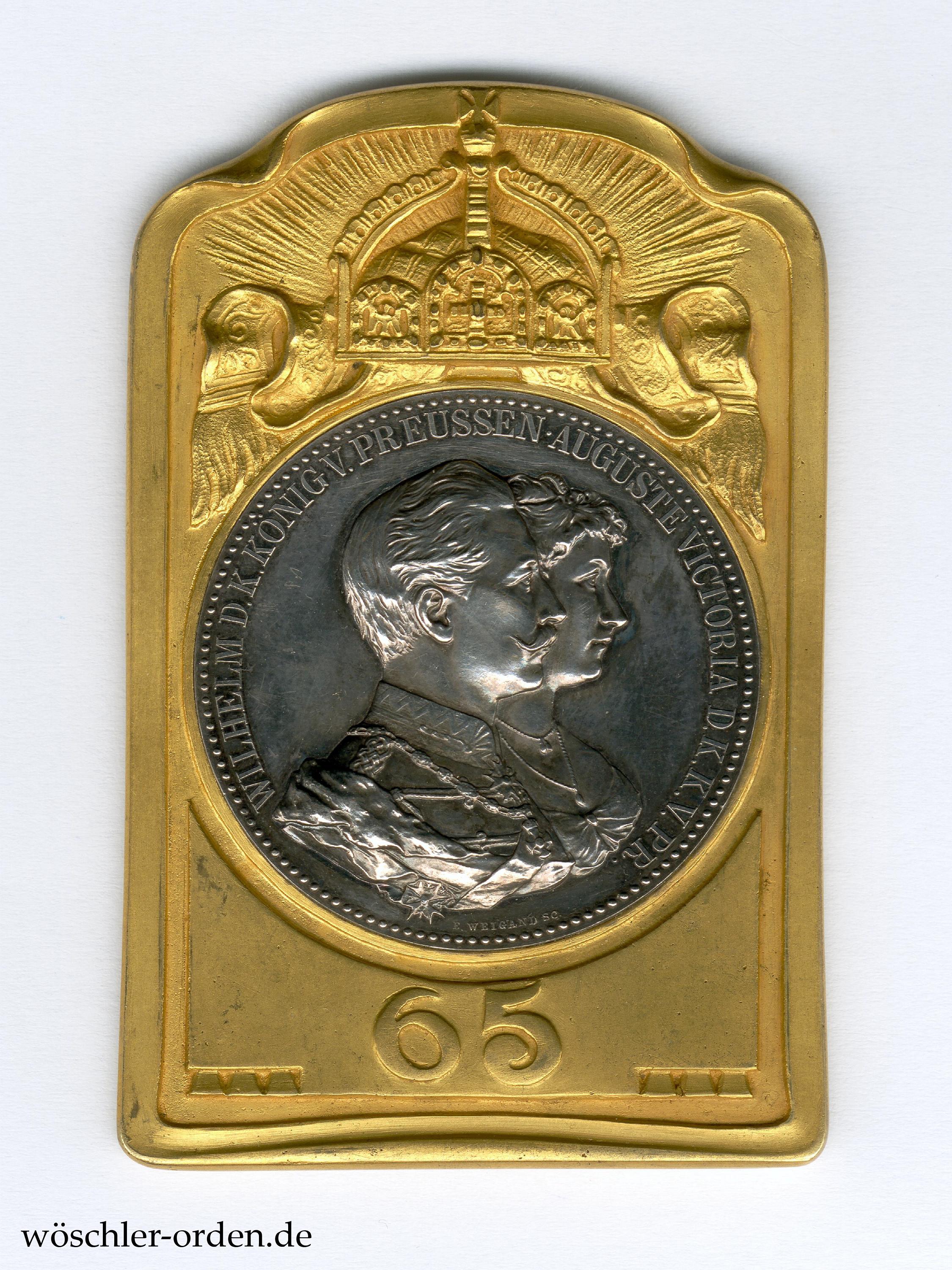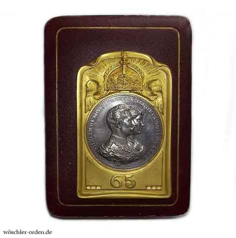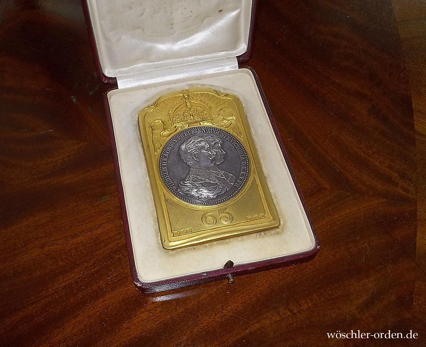 Bronzeplakette, feuervergoldet und ziseliert, mit eingesetzter Silbermedaille zwischen Kaiserkrone und Jubiläumszahl „65“, wie sie durch Wilhelm II. mit Kabinettsordre vom 9. Mai 1899 für 60-jährige und für 65-jährige Ehejubiläen auf Basis der seit 1881 verliehenen Ehejubiläumsmedaille gestiftet wurde. Der Entwurf des Zierrahmens stammte von Professor Emil Döpler d. J., die handwerkliche Ausführung übernahm der Ziseleur und Professor an der Schule des Kgl. Kunstgewerbemuseums Otto Rohloff. Insgesamt wurden in der Ausgabe mit Jubiläumszahl „65“ lediglich 42 Exemplare hergestellt.