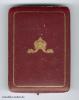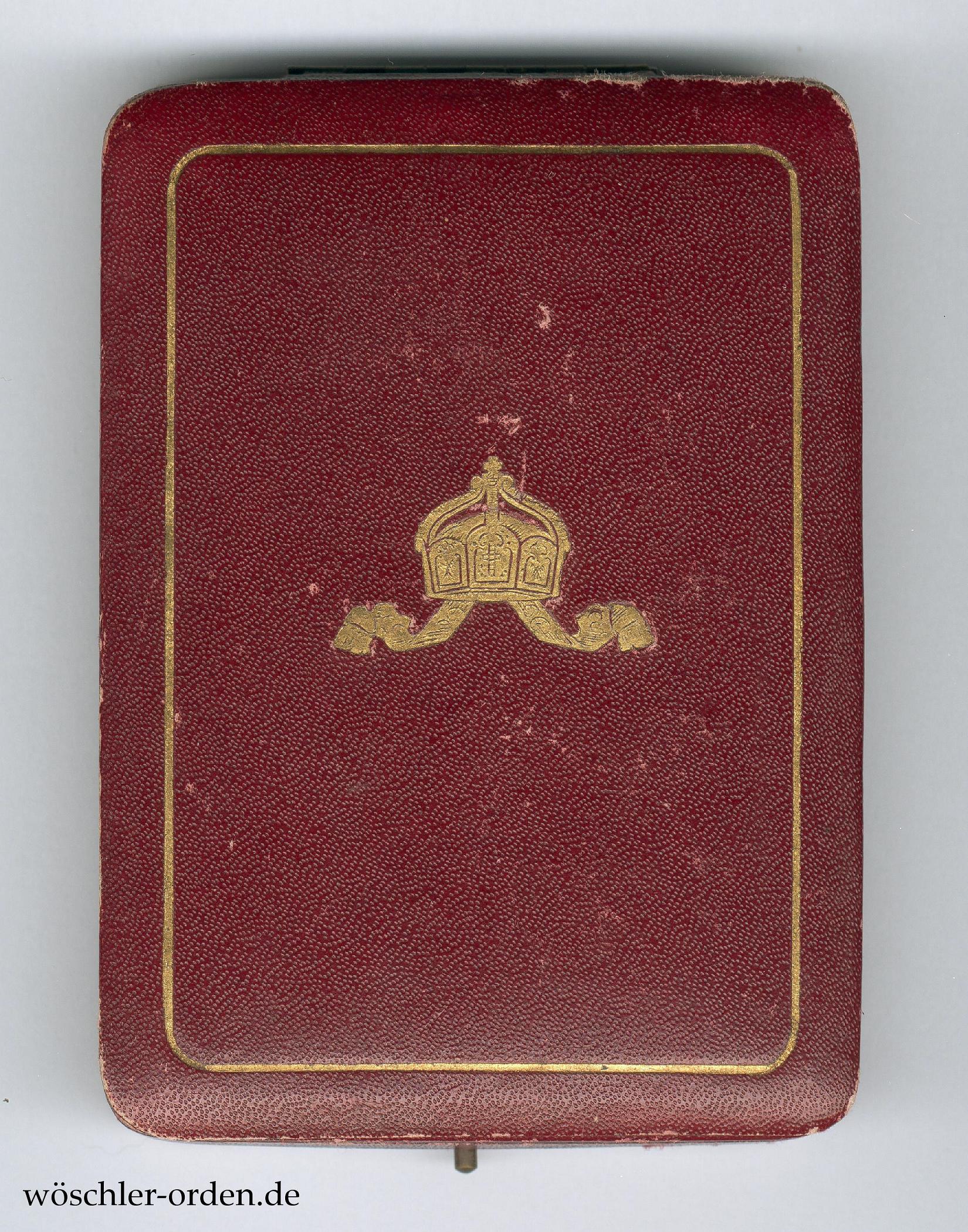 Dazu das rechteckige, mit weinrotem Lederimitat bezogene Vergabeetui mit aufgedruckter Kaiserkrone und goldener Zierleiste, innen mit altweißer Samteinlage mit Aussparung für die Plakette sowie ebenfalls altweißer Seidenverkleidung des Himmels.