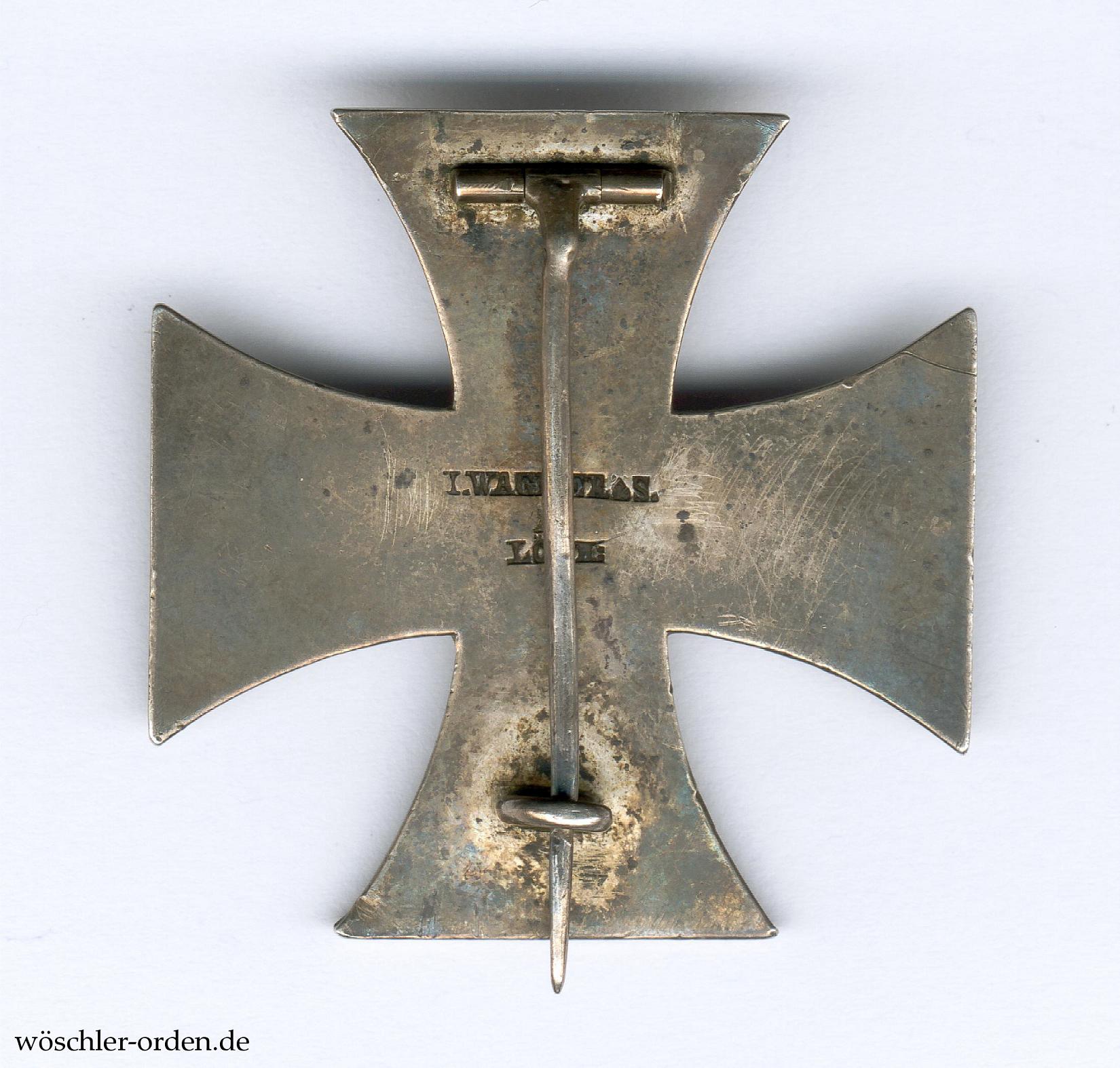 Verleihungsstück in probemäßiger Fertigung mit gegossenem Eisenkern in Silberzarge, rückseitig Herstellerpunzierung „I. WAGNER & S. / 14 / LÖTH:“, an dünner Rundnadel.