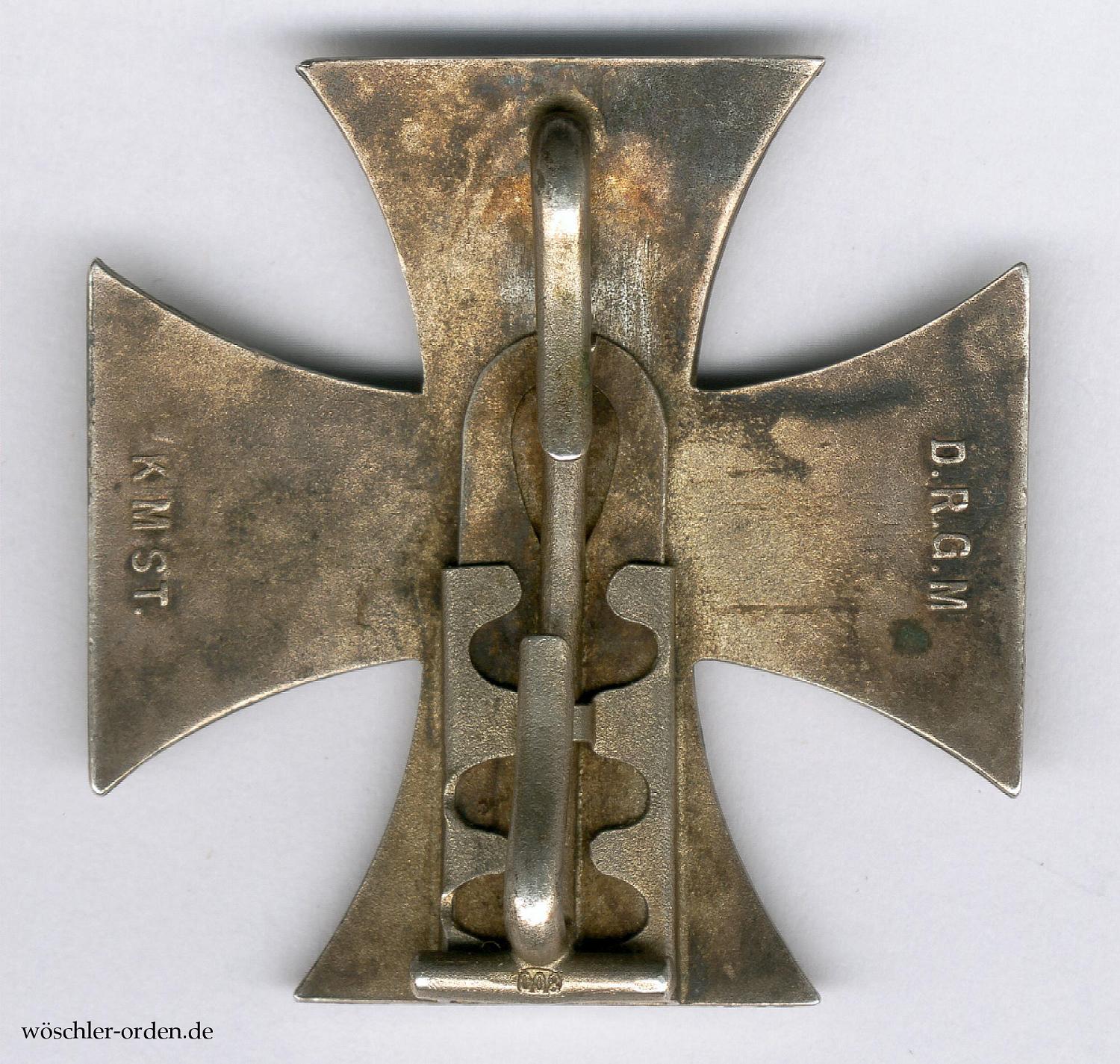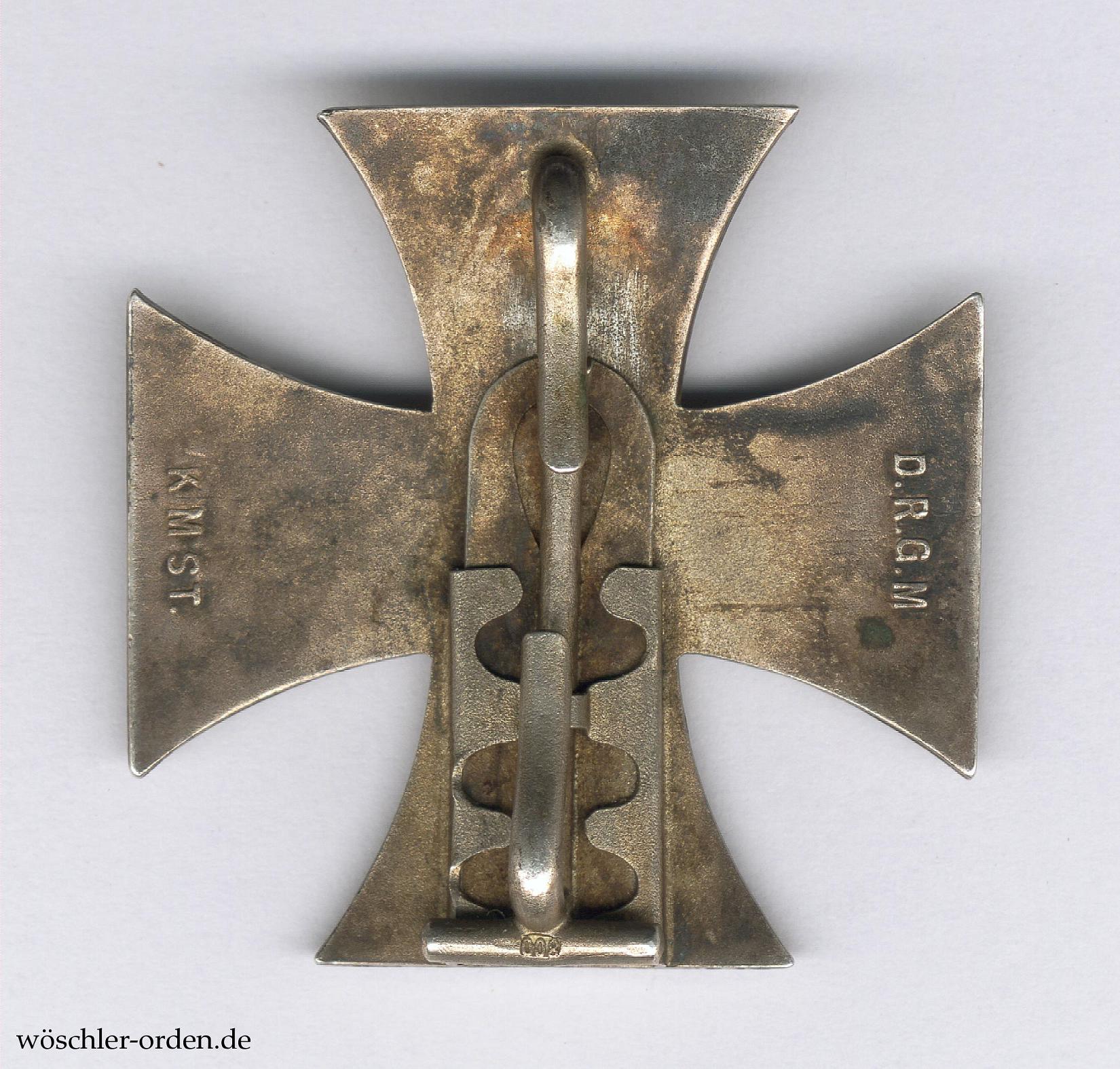Zeitgenössische, nichtprobemäßige Zweifertigung in leicht gewölbter Ausführung mit geprägtem, glänzend lackiertem Eisenkern in Silberzarge. Rückseitig aufwändiger, vielteilig gefertigter Schiebeverschluss sowie erhaben mitgeprägte Musterschutzangabe „D.R.G.M.“ und Herstellermarkierung „K.M.ST.“ der Königlichen Münze, Abteilung Orden, Stuttgart. Am Schieber zusätzlich „800“ für den Feingehalt punziert.